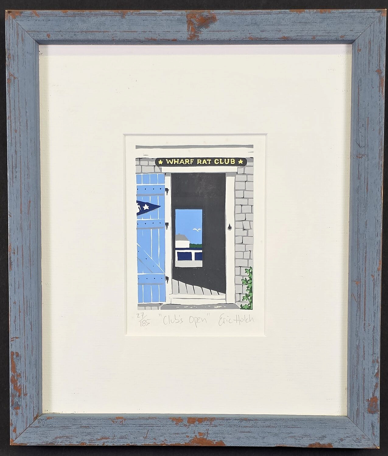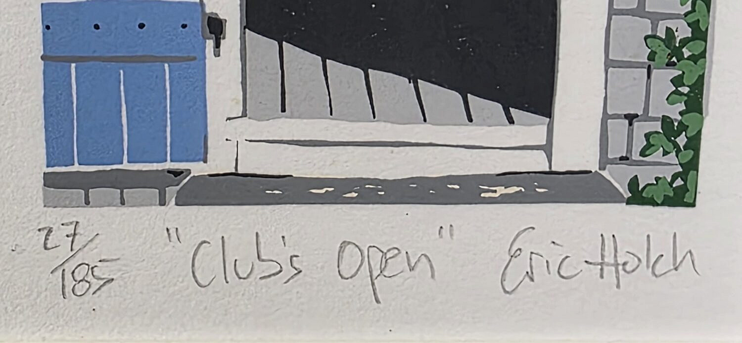 Eric Holch Limited Edition Nantucket Silk Screen, “Clubs Open”, Ed # 27/185, pencil signed and numbered, depicting the Wharf Rat Club Nantucket.