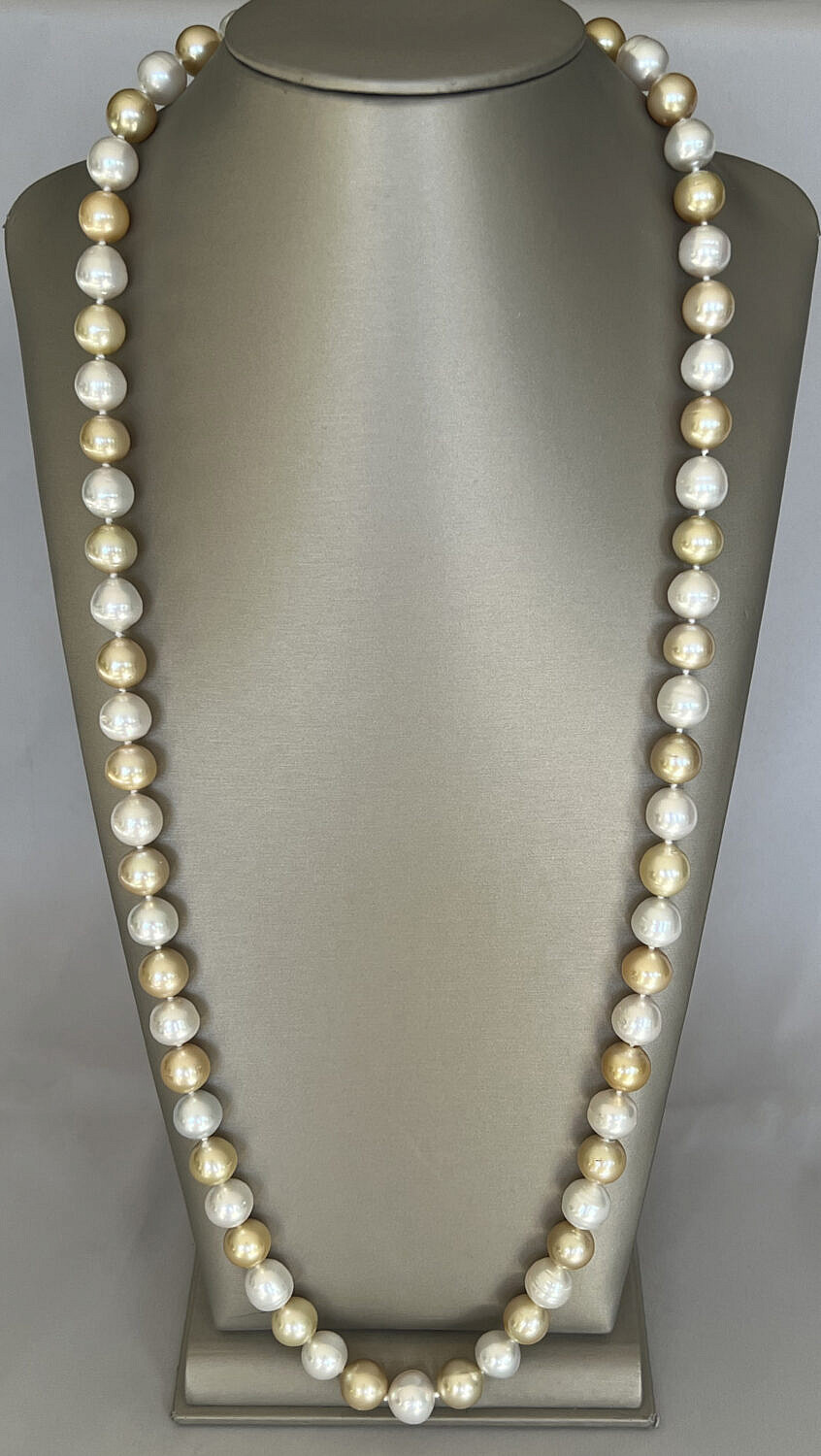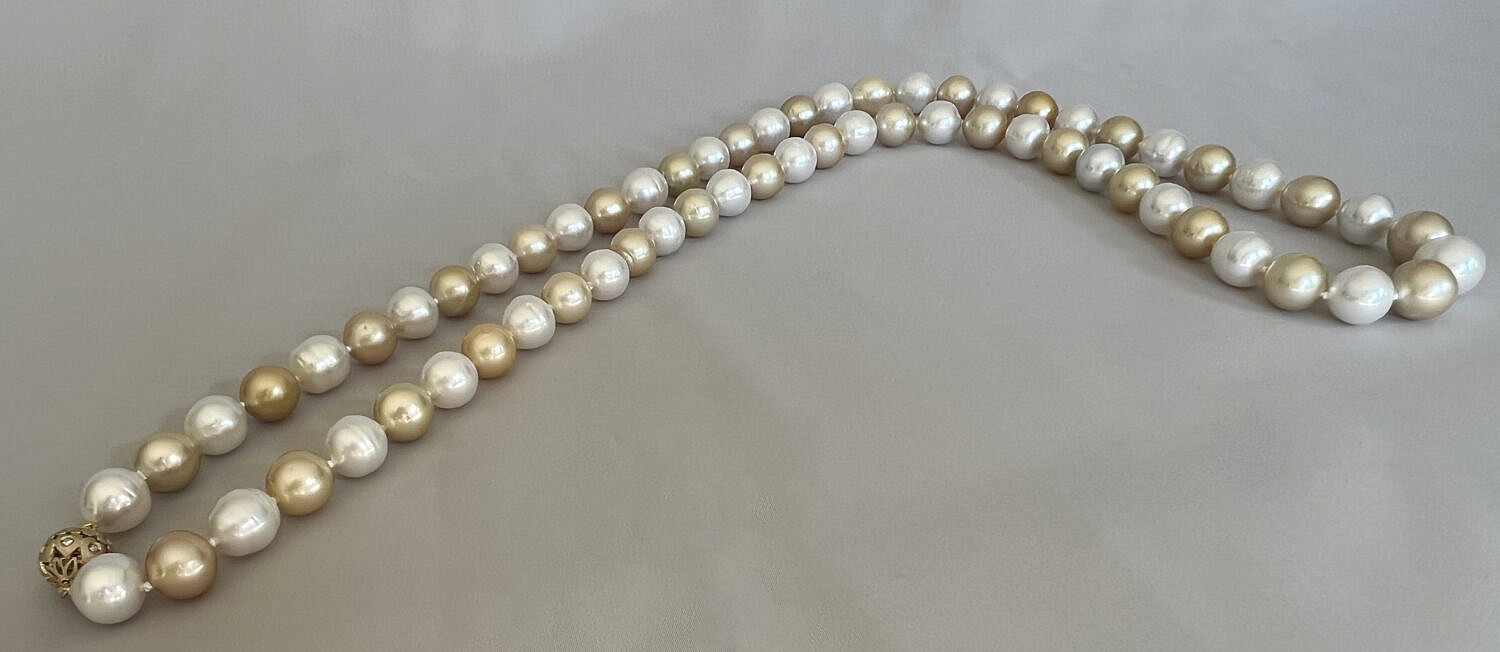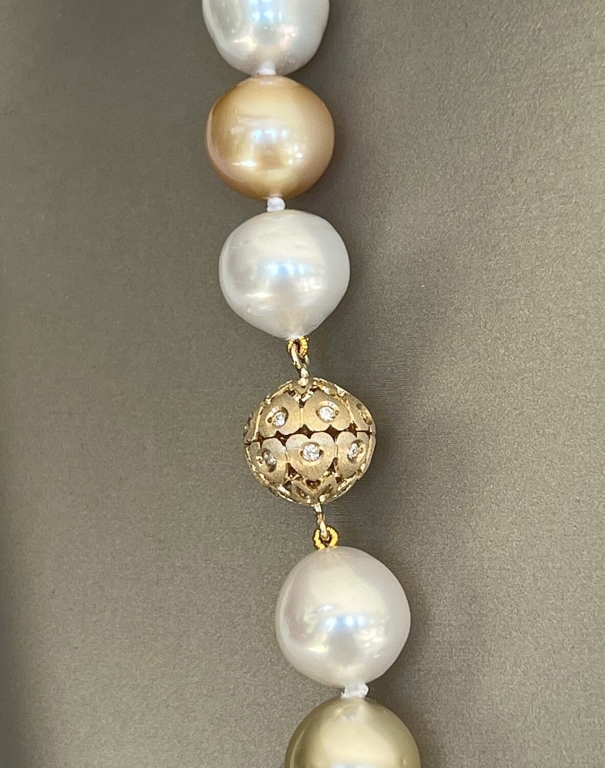 Fine 12mm x 13.9mm Natural Gold and White South Sea Baroque Pearl Necklace, 14k Yellow Gold and Diamond Clasp