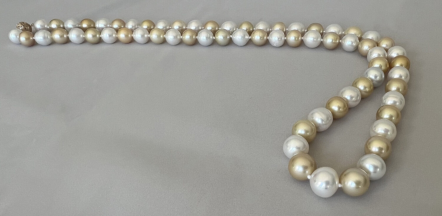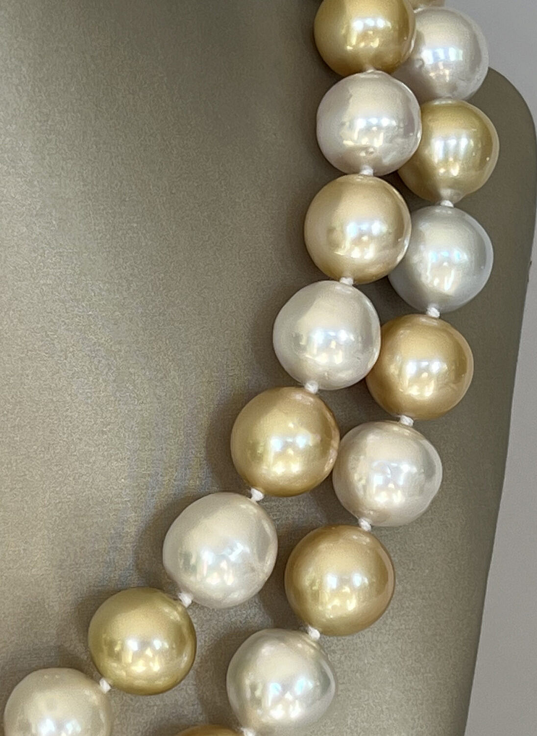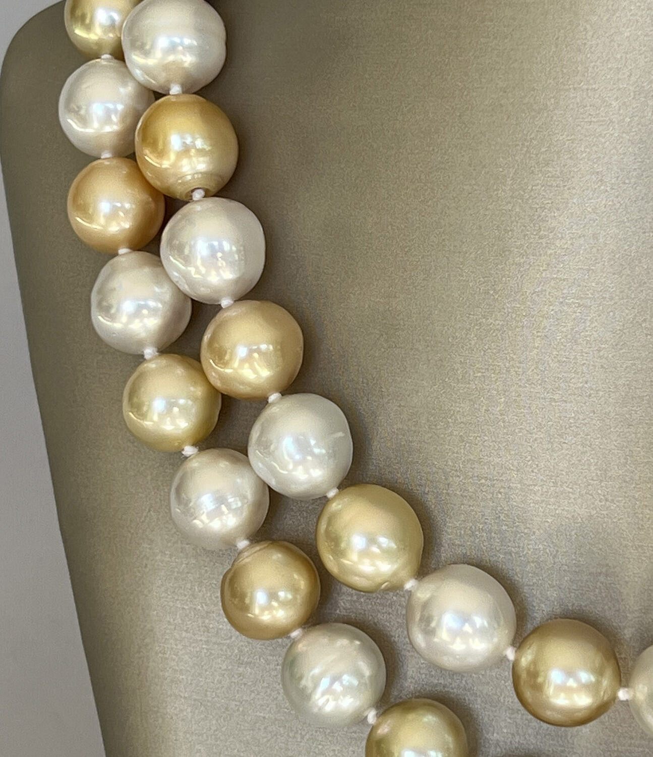 Fine 12mm x 13.9mm Natural Gold and White South Sea Baroque Pearl Necklace, 14k Yellow Gold and Diamond Clasp