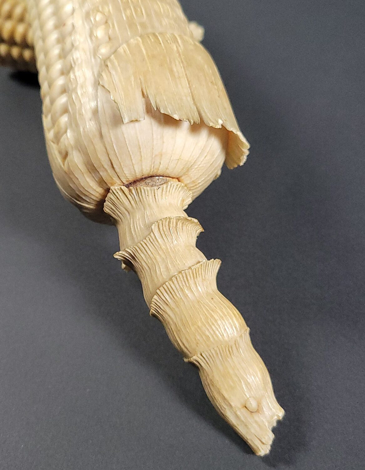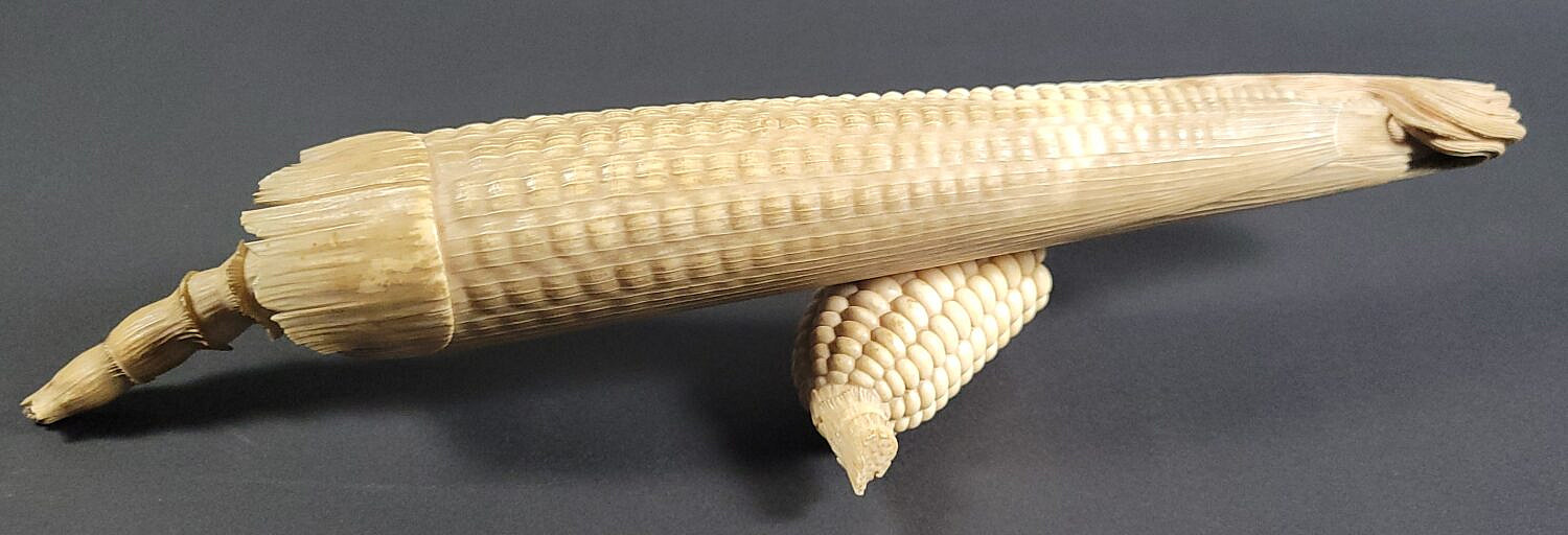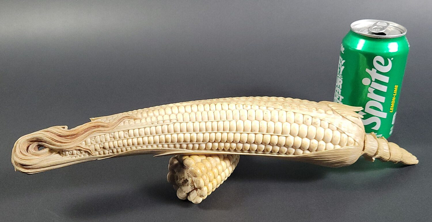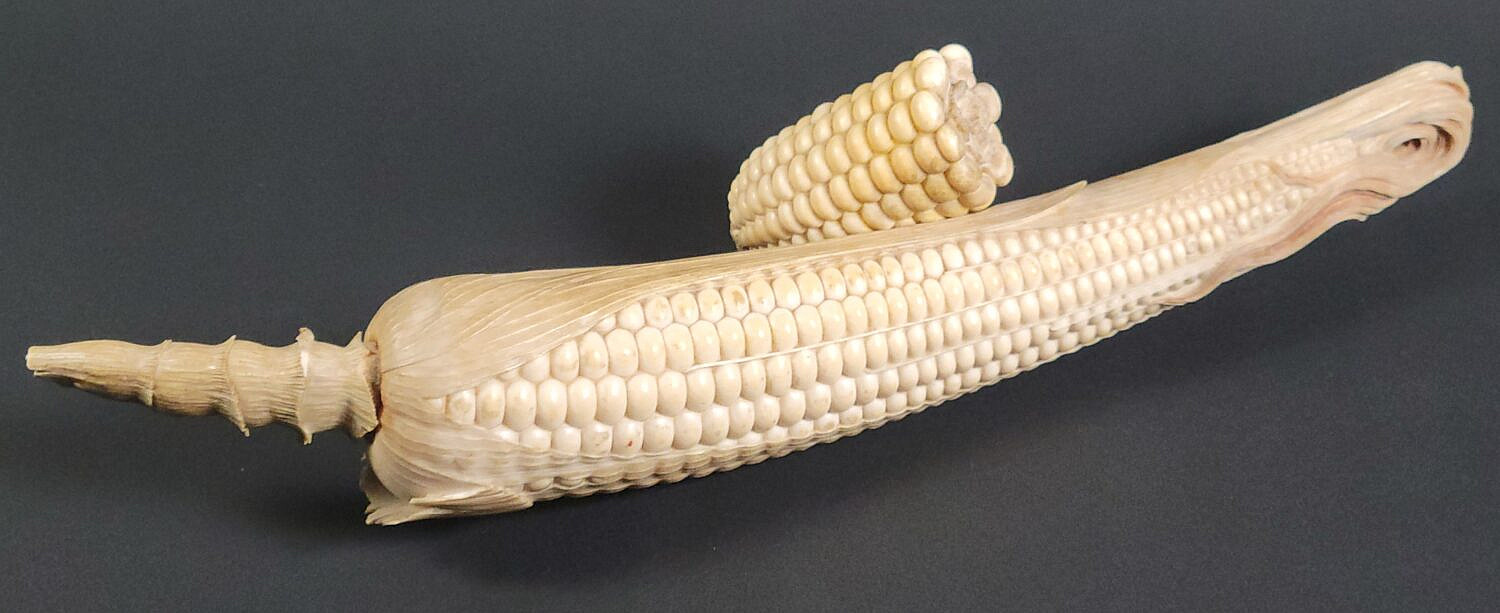Fine Antique Nakagawa Ryuei Large Sweet Corn Okimono Carving, late 19th century Meiji Restoration era, the finest carved lifelike details of corn silk, kernels, and stalk, attached half section of cob, signed with red kanji on underside, actual size of an ear of corn, Ryuei(1868-1912) was a member of the Tokyo Carver’s Association from 1906-1910.