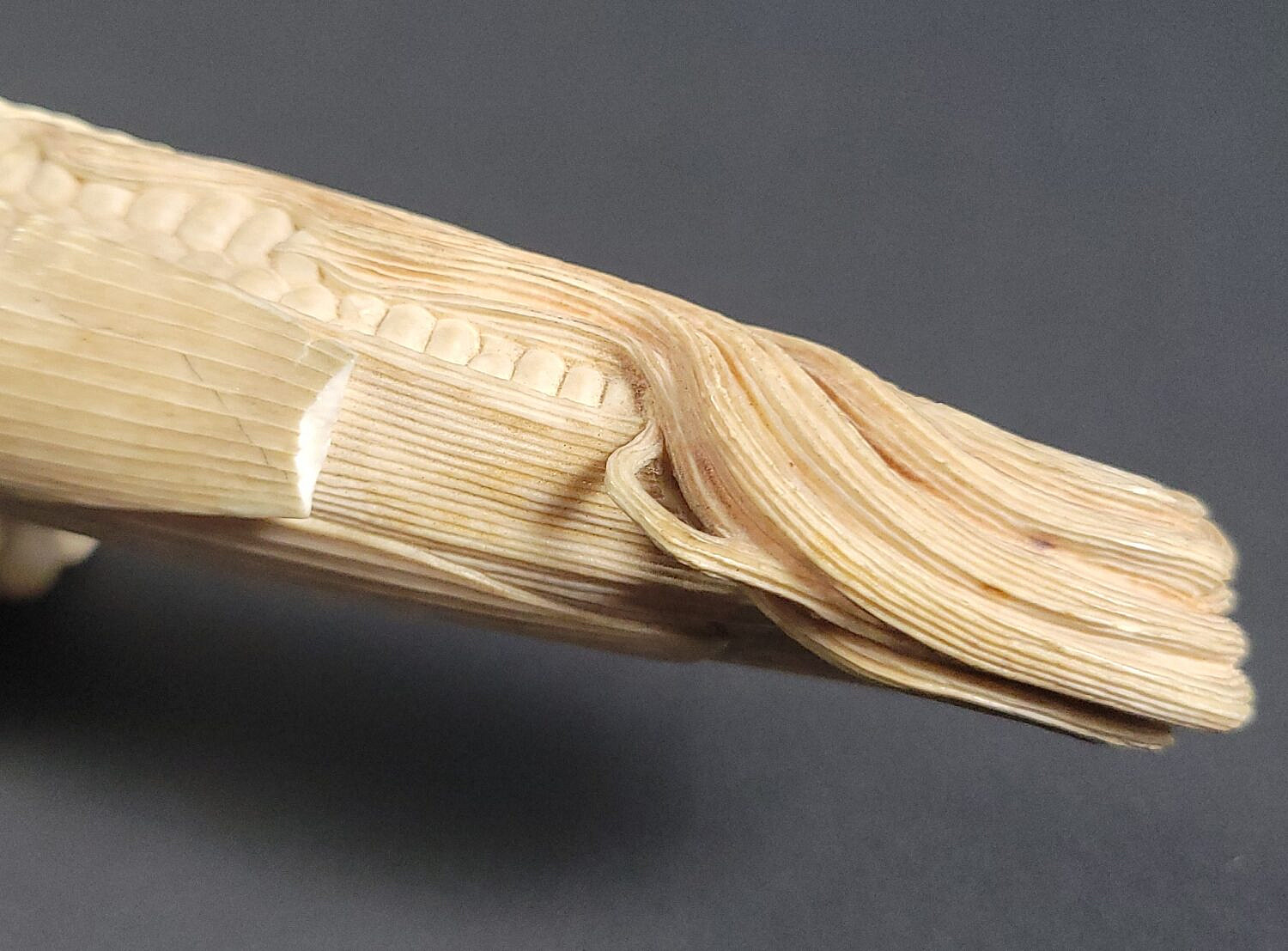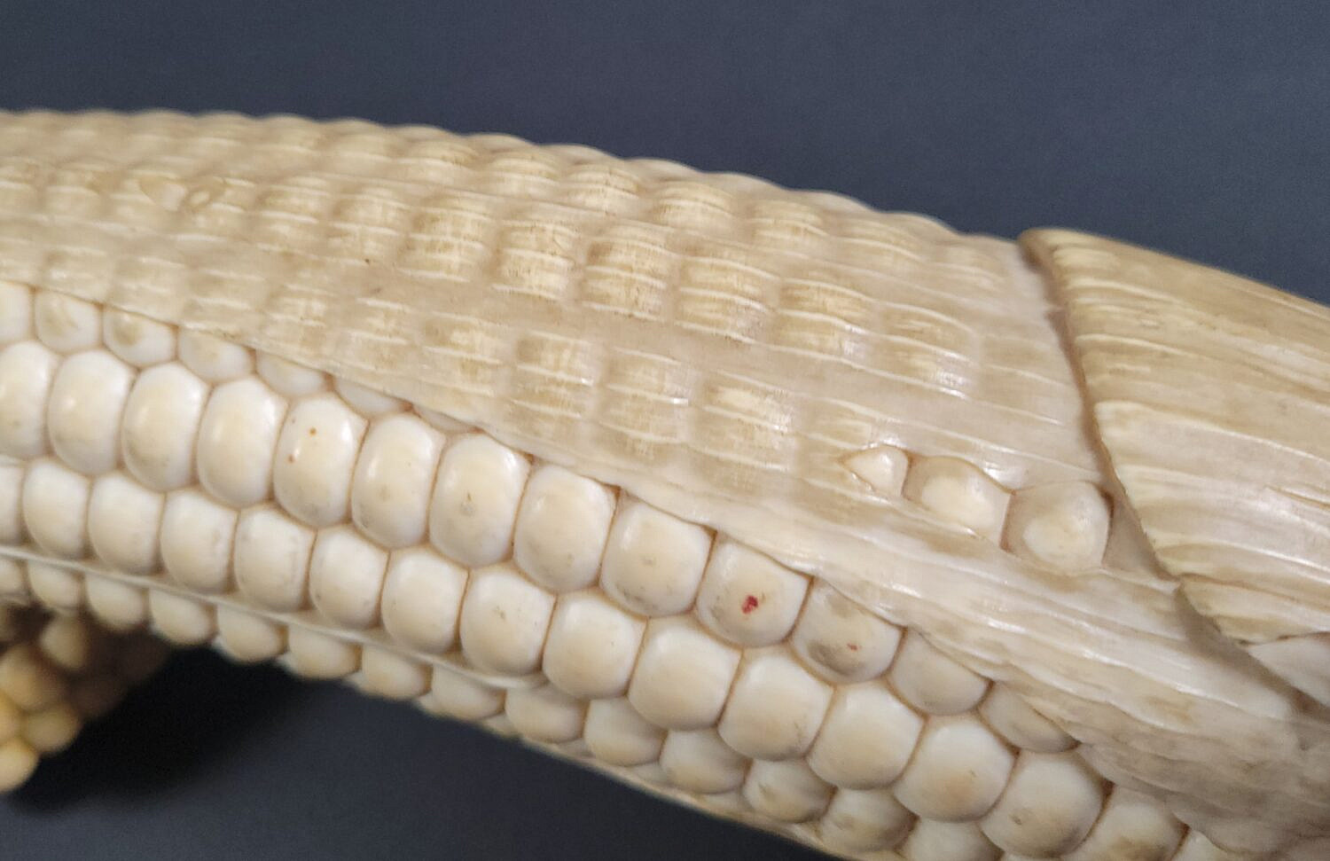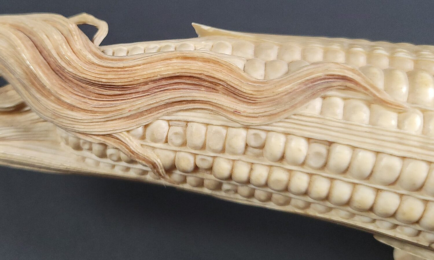 Fine Antique Nakagawa Ryuei Large Sweet Corn Okimono Carving, late 19th century Meiji Restoration era, the finest carved lifelike details of corn silk, kernels, and stalk, attached half section of cob, signed with red kanji on underside, actual size of an ear of corn, Ryuei(1868-1912) was a member of the Tokyo Carver’s Association from 1906-1910.