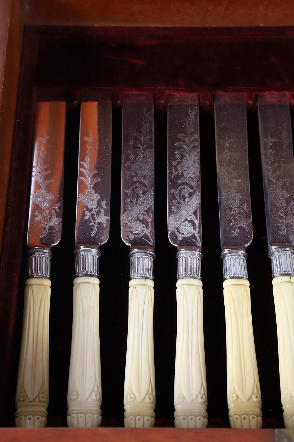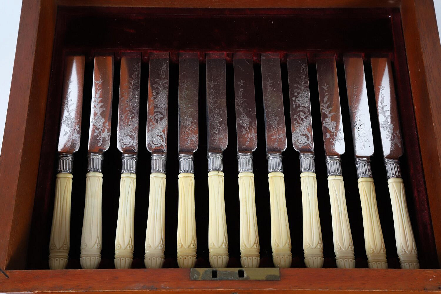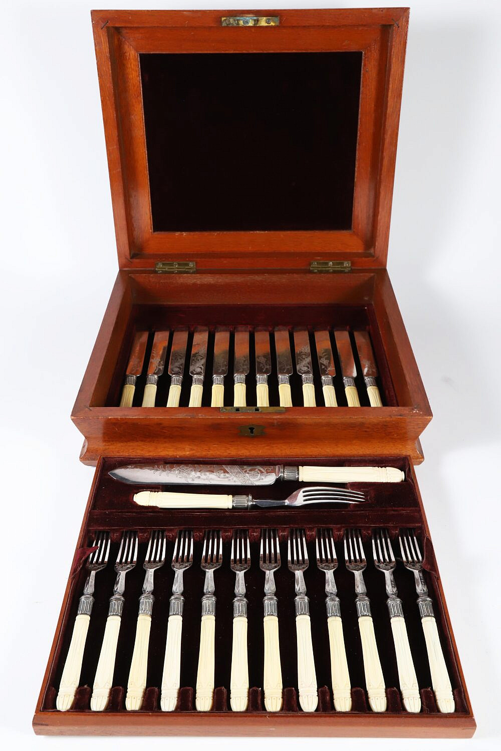 Fine Boxed 26 Piece Luncheon Flatware Set, 19th Century, comprising 12 knives and forks with serving knife and fork, all with engraved blades and carved antique ivory grips, mahogany shaped box with original key