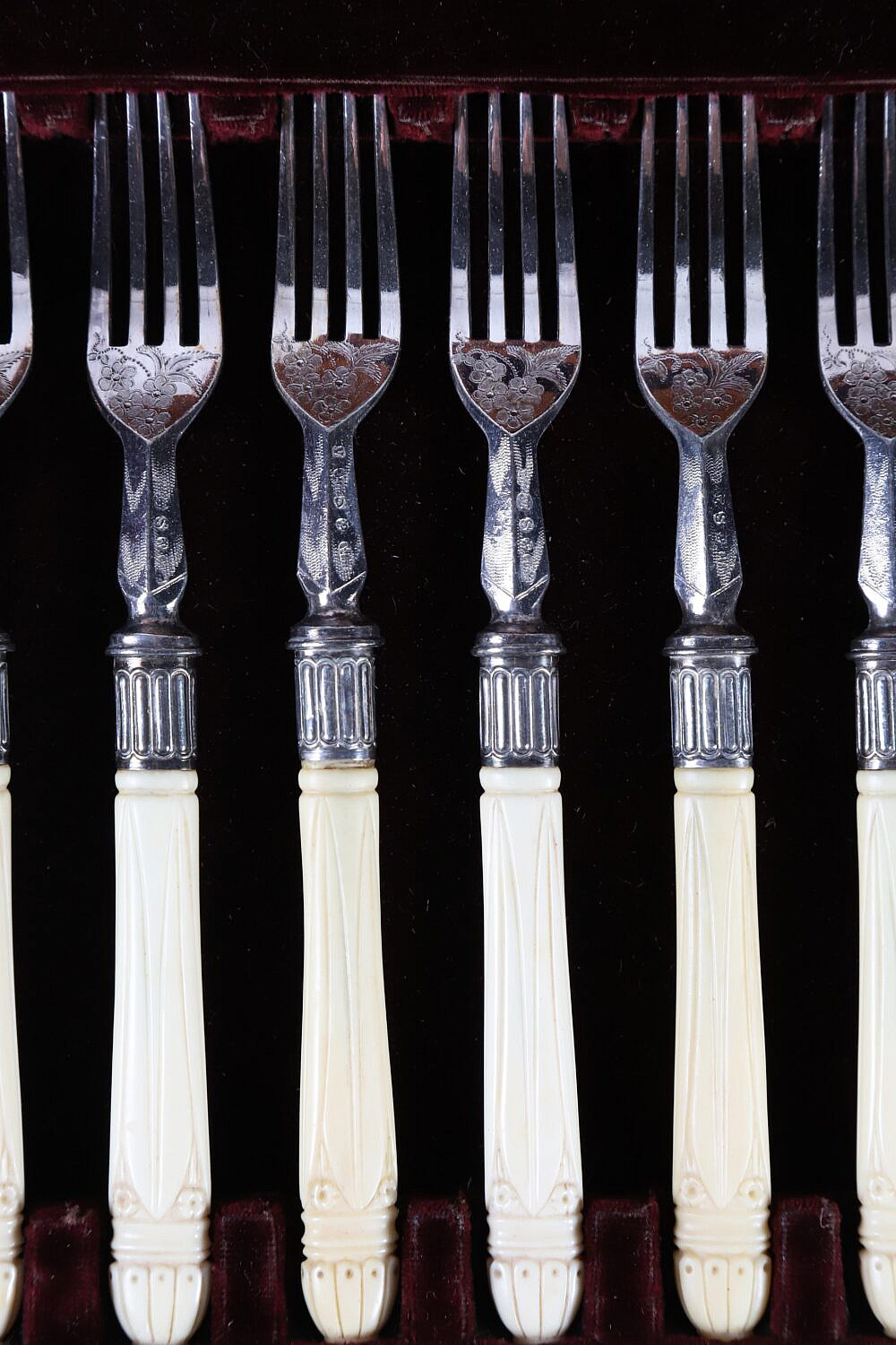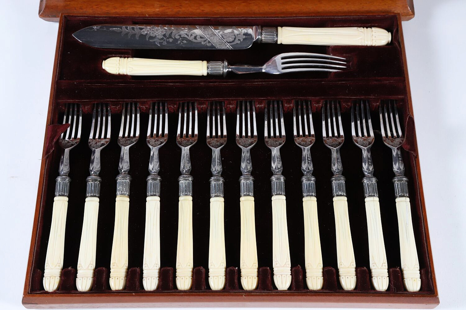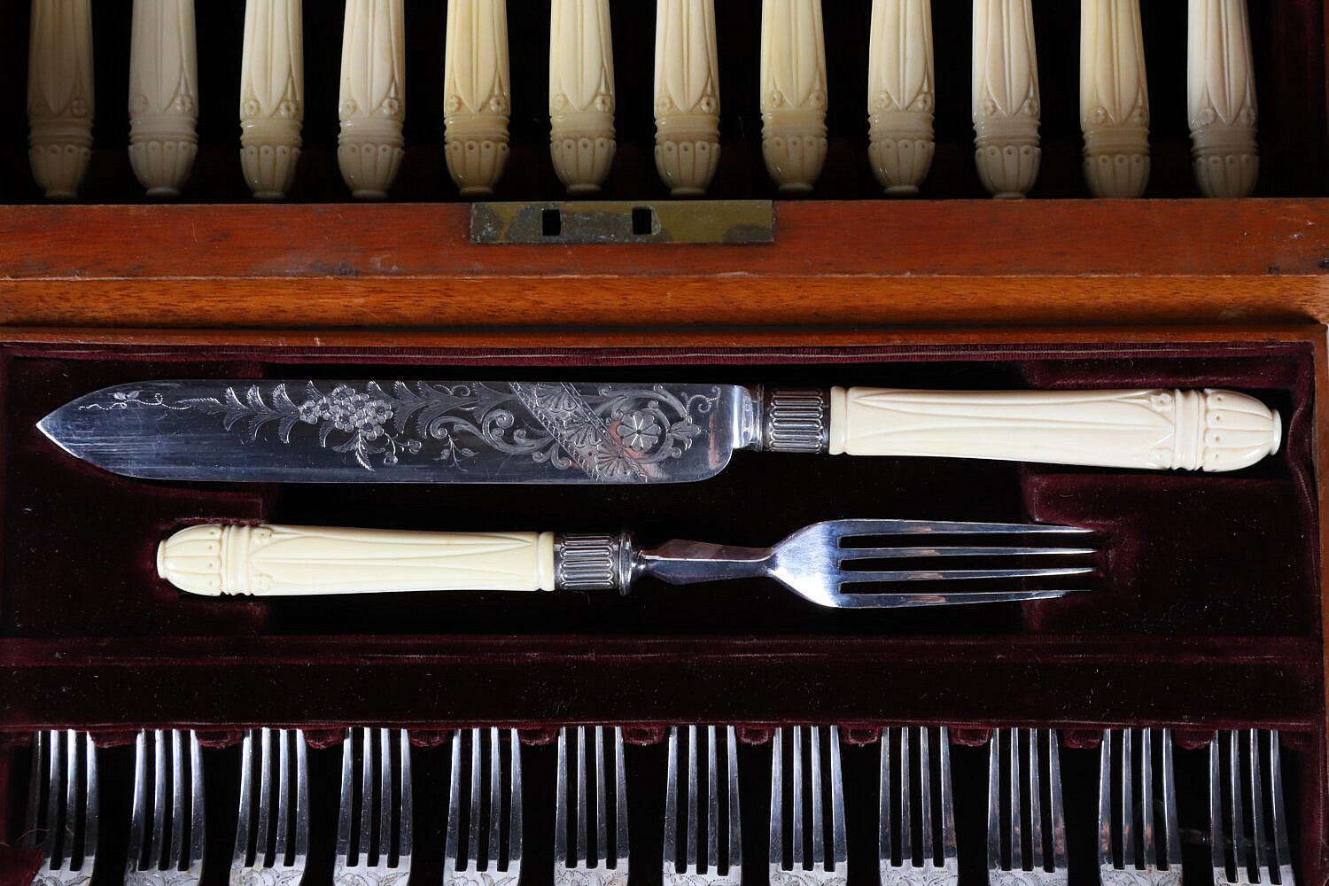 Fine Boxed 26 Piece Luncheon Flatware Set, 19th Century, comprising 12 knives and forks with serving knife and fork, all with engraved blades and carved antique ivory grips, mahogany shaped box with original key