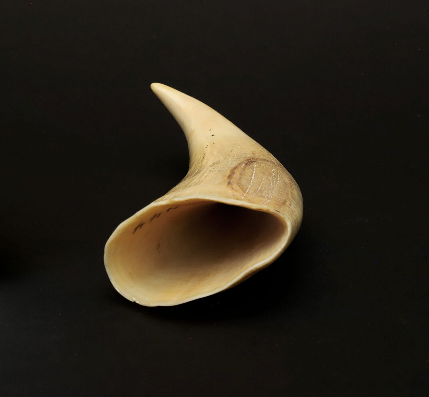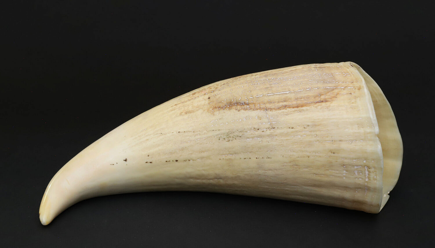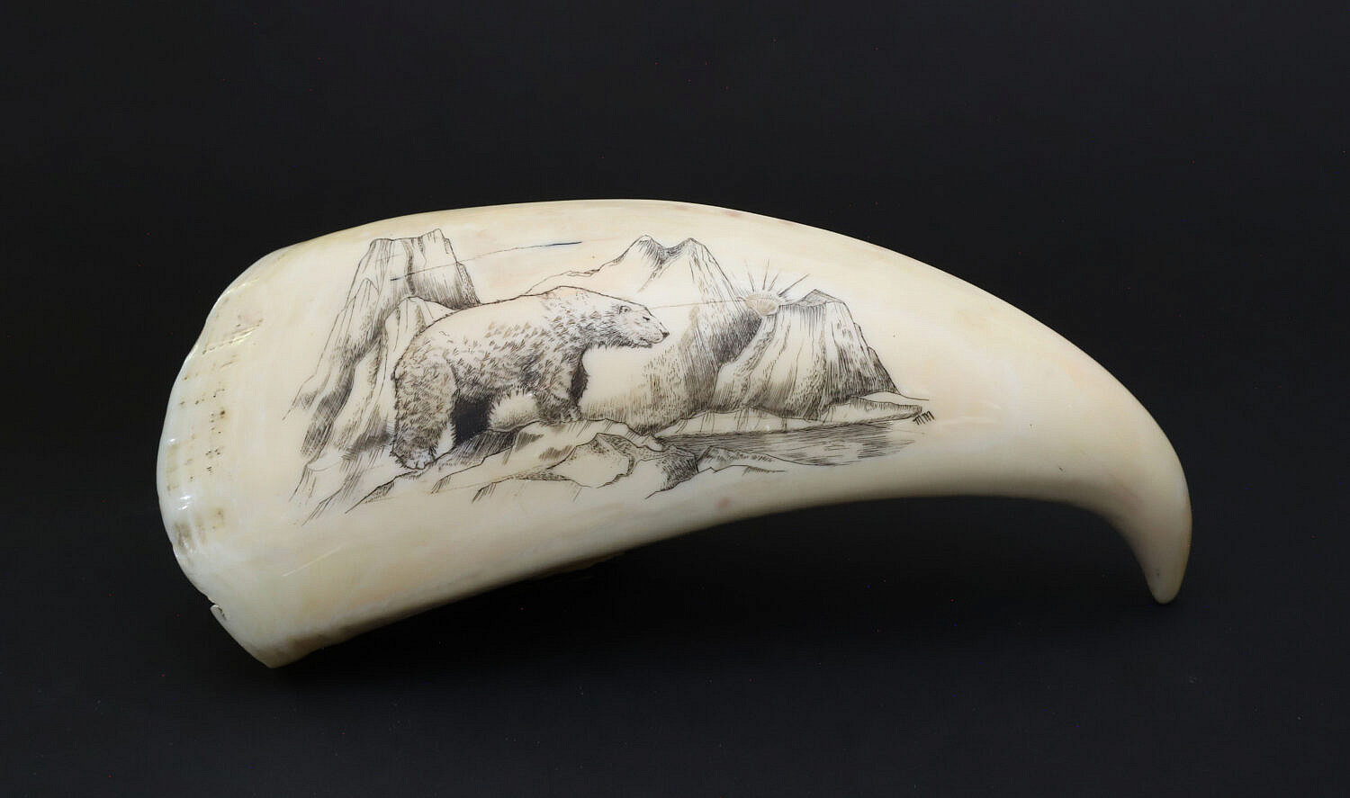 Fine Contemporary Scrimshaw Whale’s Tooth, Mid 20th Century, Engraved by M.M. on a 19th Century Whale Tooth, depicting a portrait of a polar bear in the Arctic, signed lower right M.M. *Per Federal regulations, this item may only be purchased by a Massachusetts resident and will not be shipped out of state.