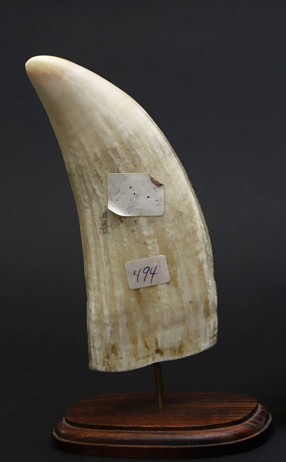 Fine Contemporary Scrimshaw Whale’s Tooth, mid 20th Century, on a 19th century half polished tooth, engraved with a portrait of a peg legged pirate, initialed lower right. *Per Federal regulations, this item may only be purchased by a Massachusetts resident and will not be shipped out of state