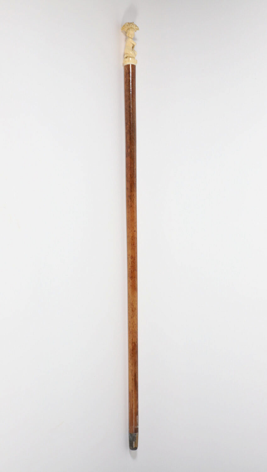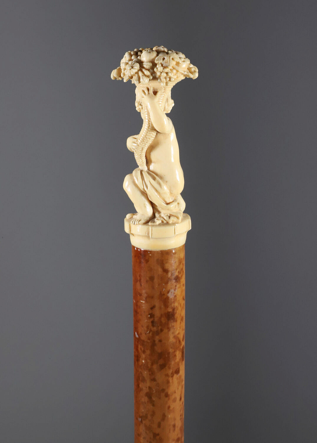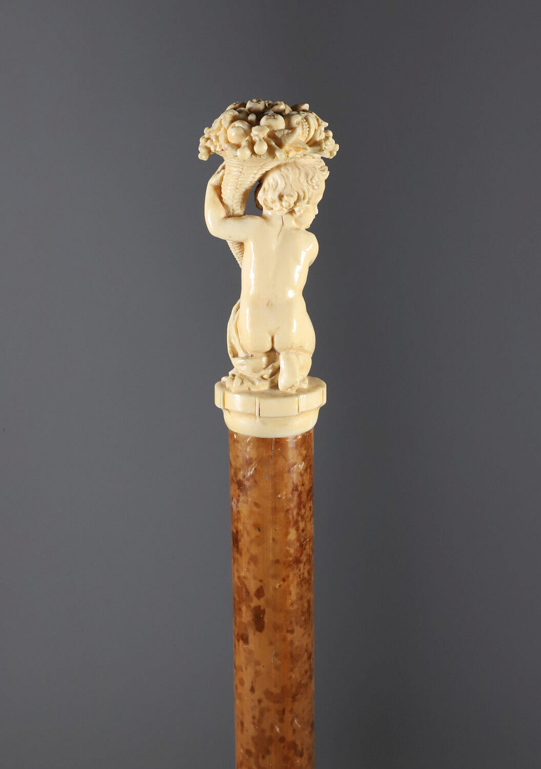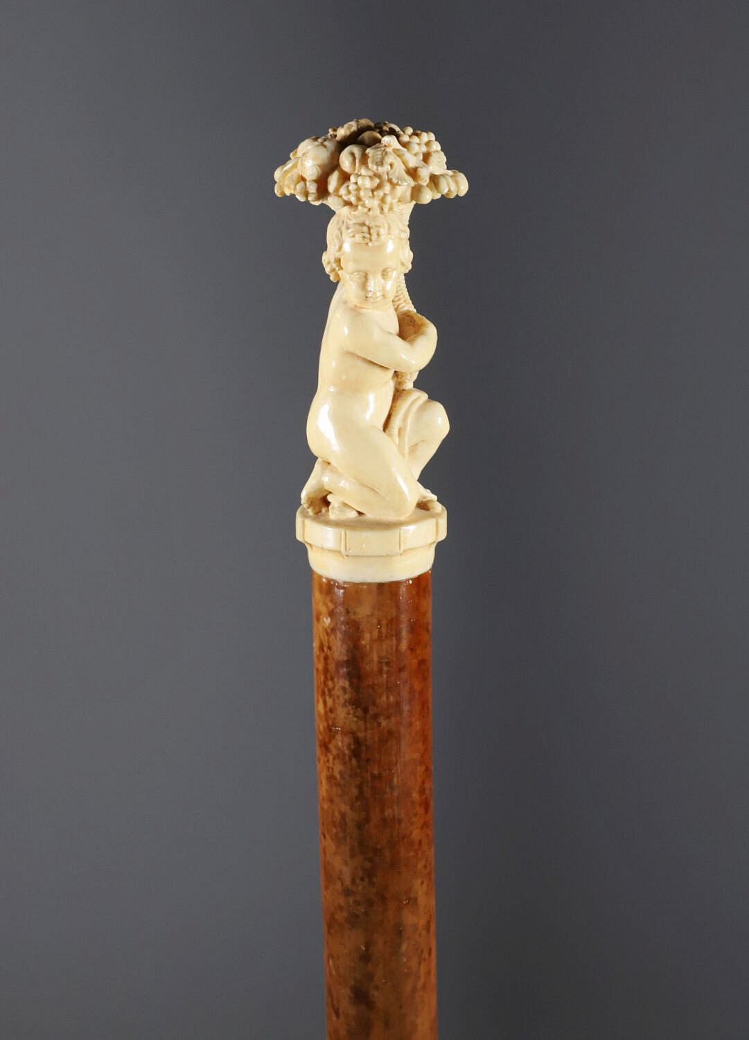 Finely Carved Child Holding Horn of Plenty Walking Stick, 19th Century, fashioned of antique ivory, the cornucopia overflowing with fruits and vegetables on a malacca shaft ending in brass ferrule. Note: This item is not available for International shipping.