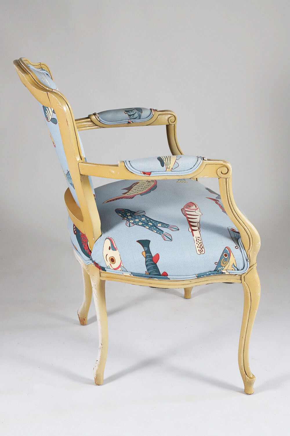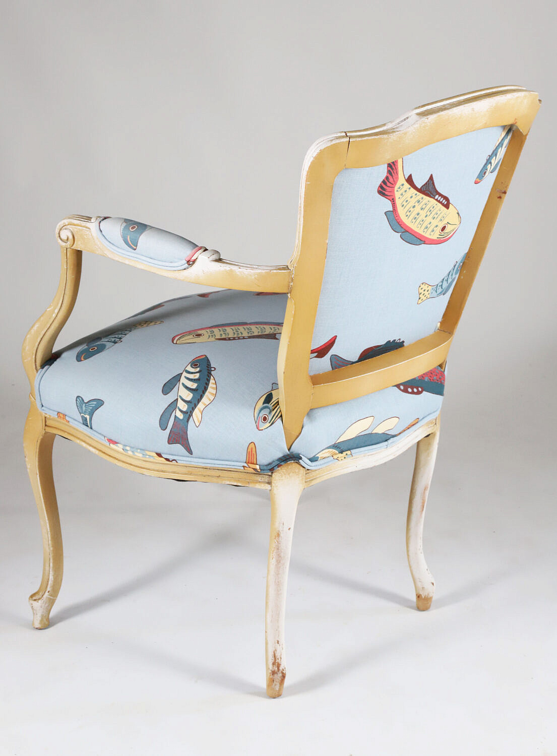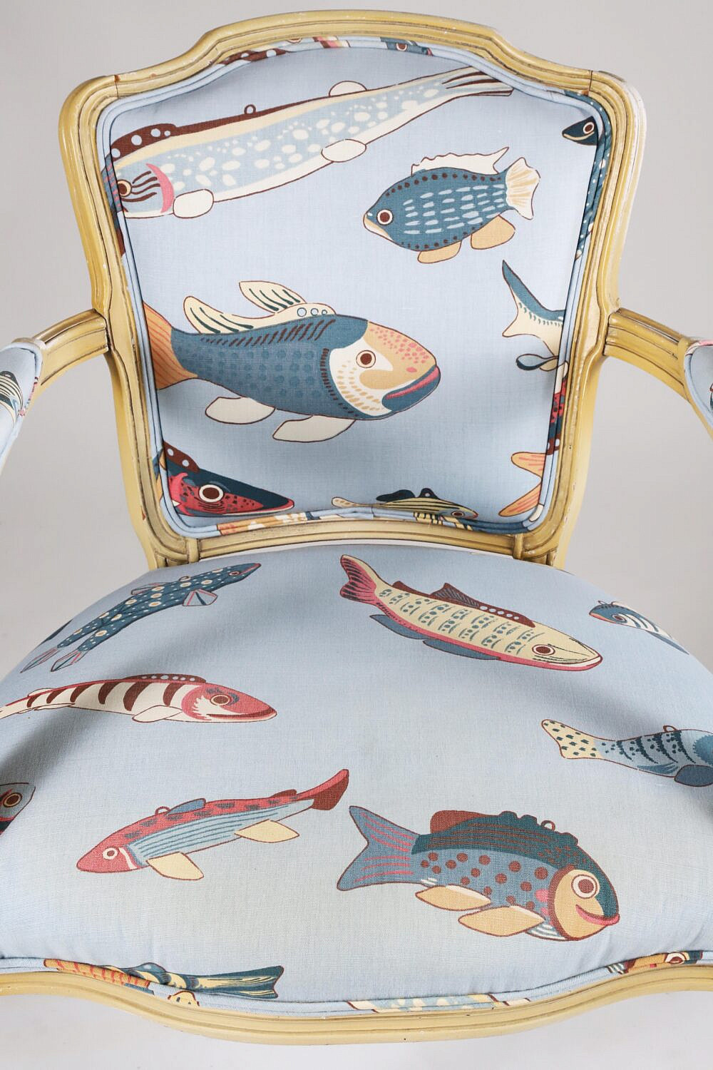 Fish Upholstered Open Armchair Consign Now DeptFurnitureSizeHeight 35 in. Width 23.5 in. Depth 26 in. Fish Upholstered Open Armchair Height 35 in. Width 23.5 in. Depth 26 in. Please note that this auction has ended. Click here for an overview of this auction.