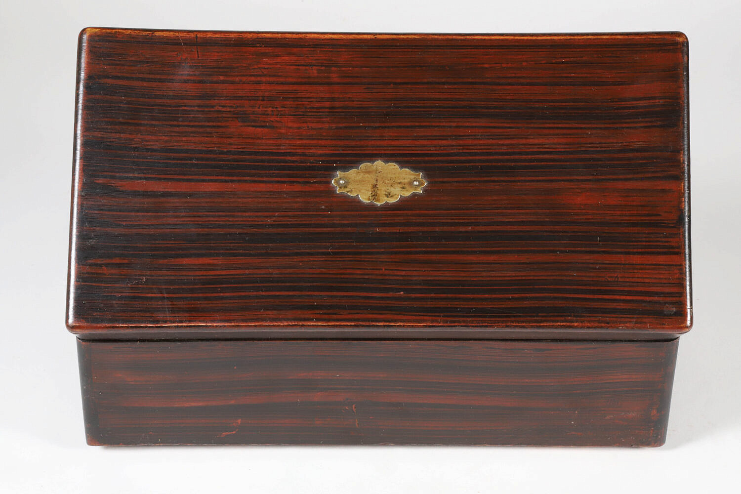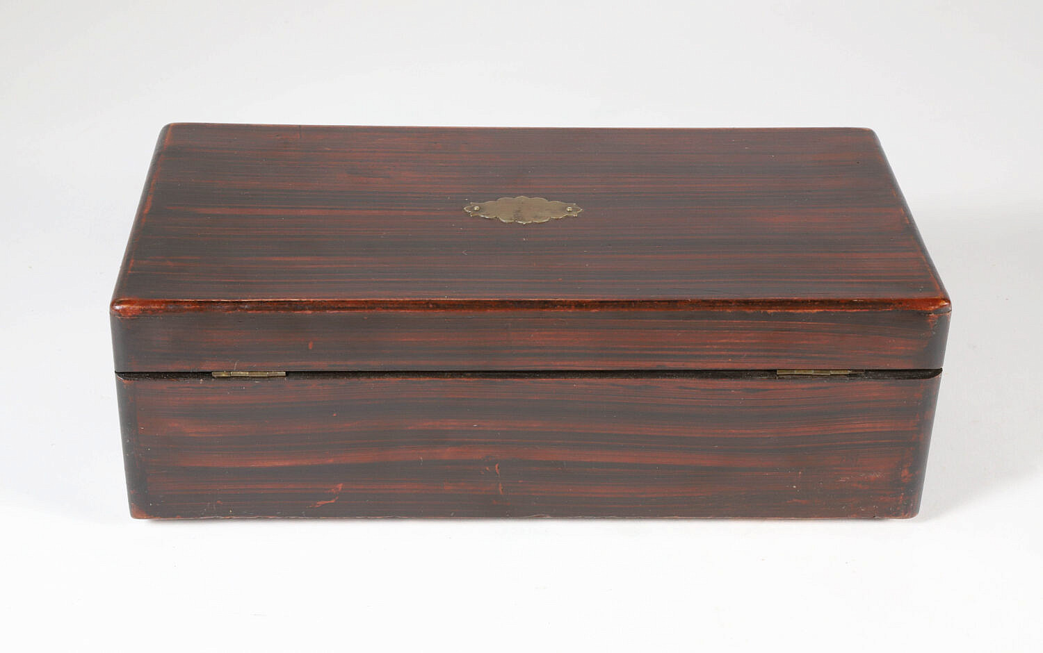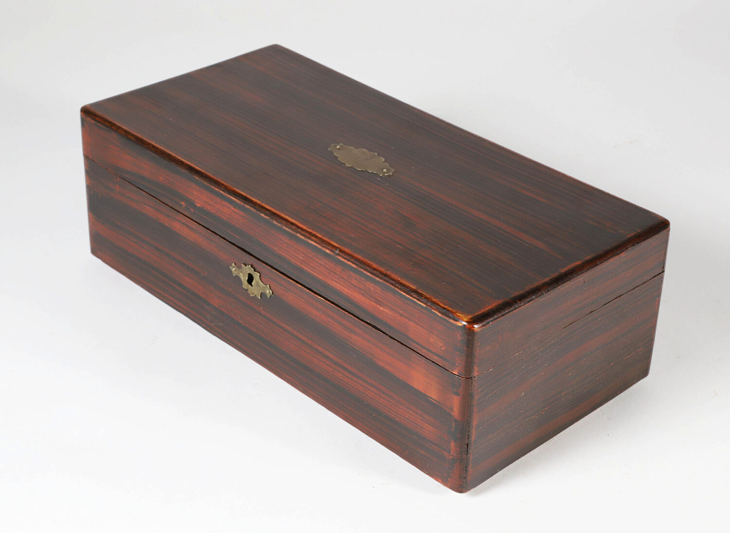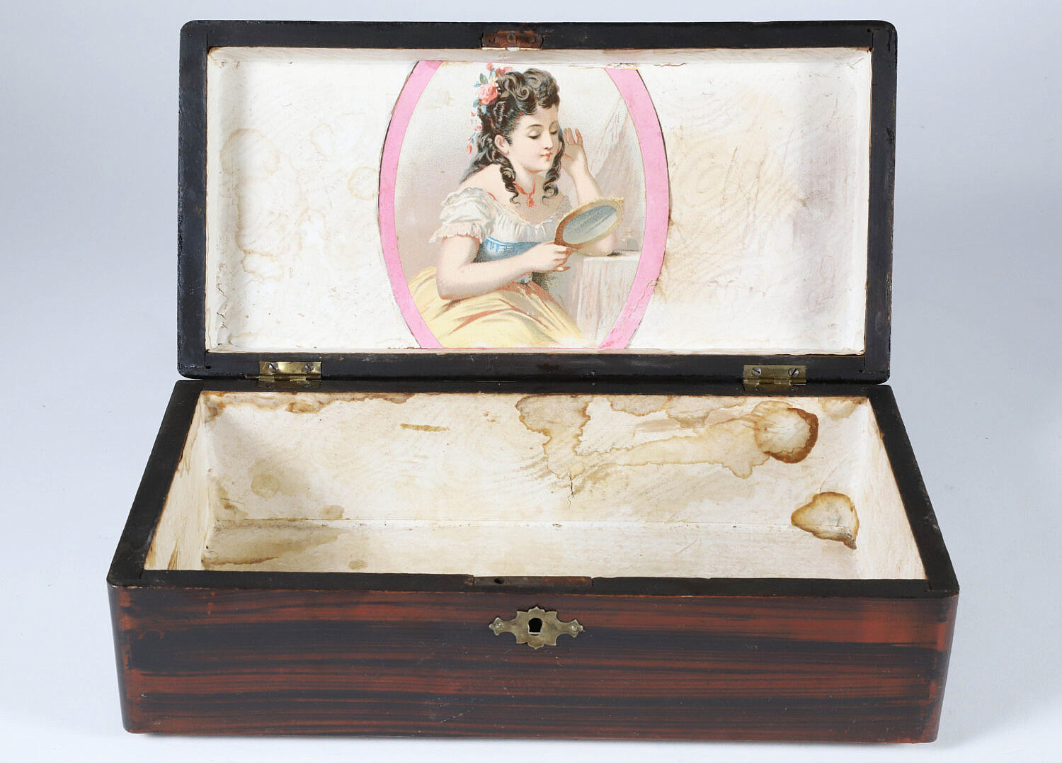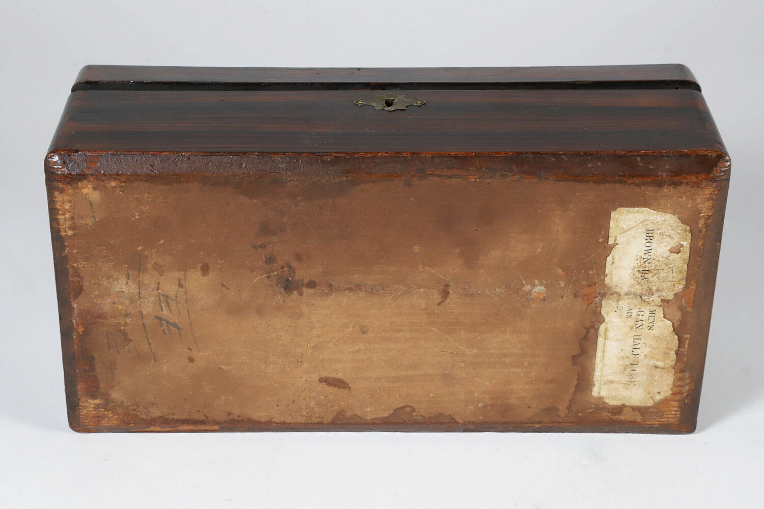 Grain Painted Lift Top Box, 19th Century, with brass key hole escutcheon and partial paper label on bottom