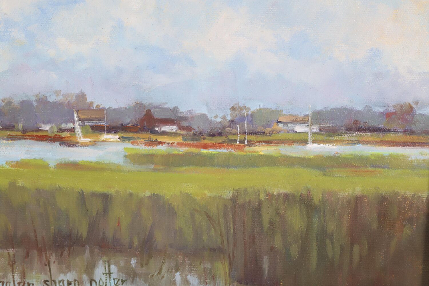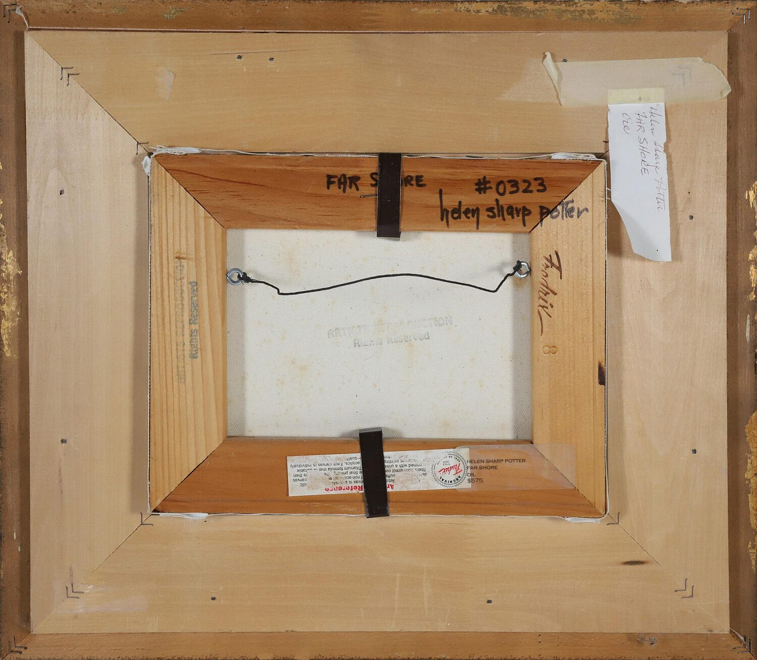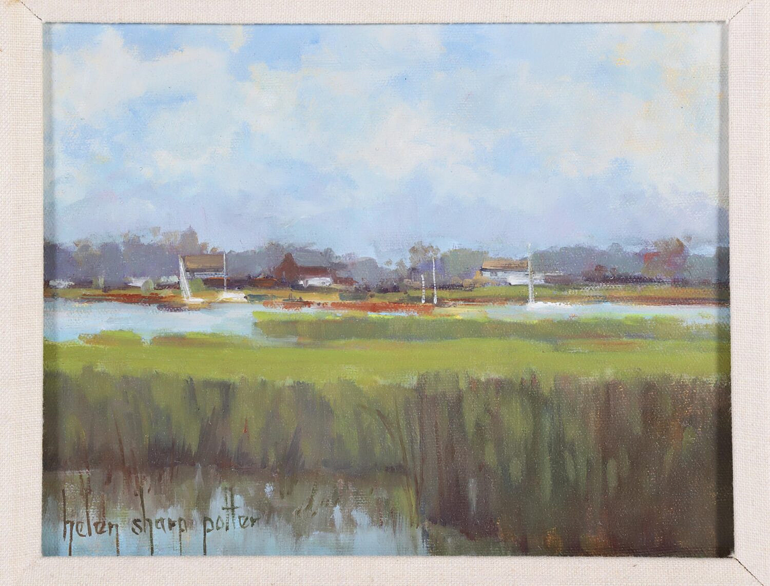 Helen Sharp Potter Oil on Canvas “Nantucket Marsh”, Titled on Stretcher “Far Shore”, signed lower left Helen Sharp Potter, linen mat and gilt frame