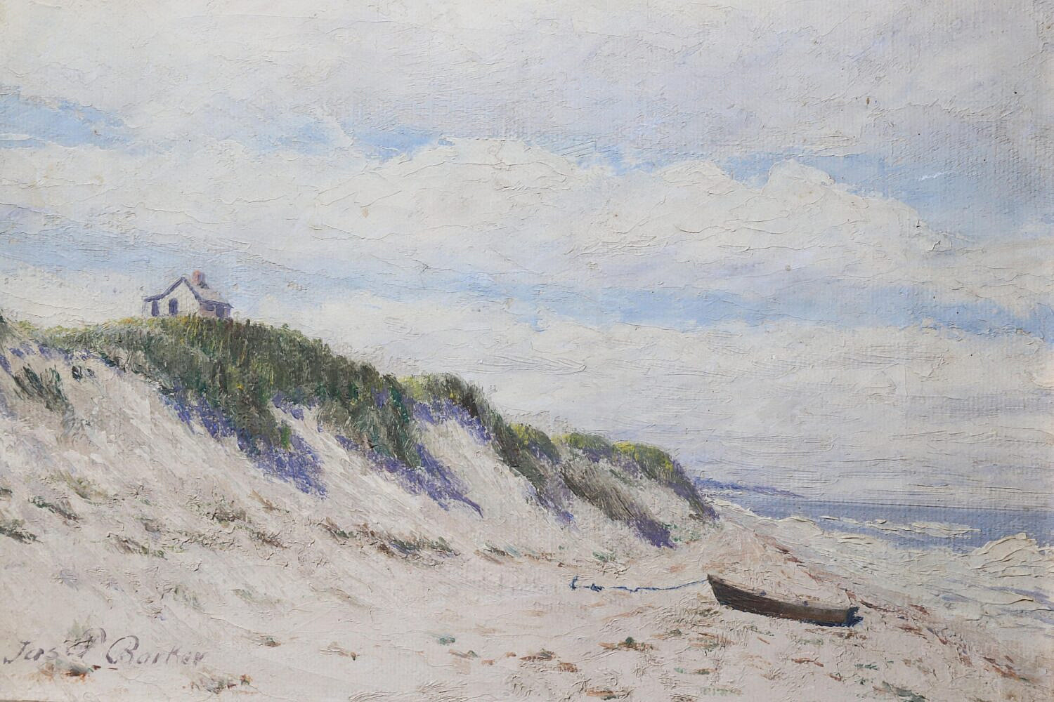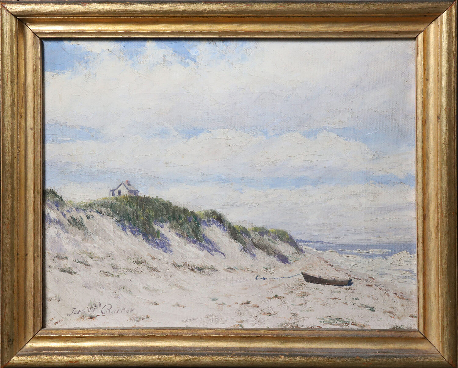 James Francis Barker Oil on Canvas “Nantucket Dunes”, circa 1943, signed lower left Jas. F. Barker, dated on the stretcher August 14, ’43 in molded gilt frame
