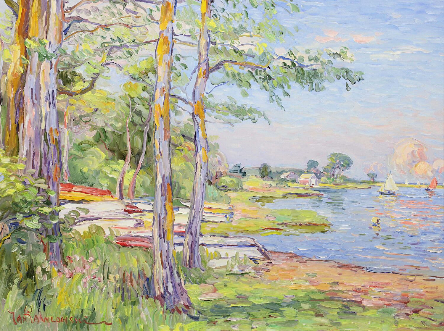 Jan Pawlowski Oil on Canvas “Polpis Harbor”, signed lower left Jan Pawlowski and on the reverse of canvas , in molded gilt frame