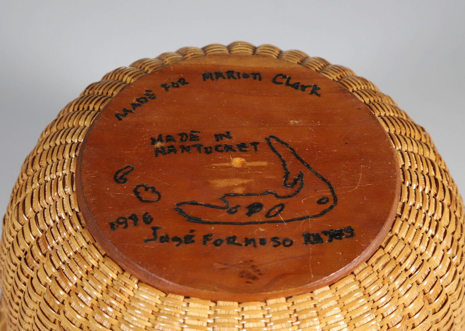 Jose Formoso Reyes Round Swing Handle Nantucket Basket, circa 1976, with 6 concentric circles carved in base and 1976 copper penny, signed upon the base: made for Marion Clark, Made in Nantucket, Jose Formoso Reyes, with an outline map of Nantucket Island