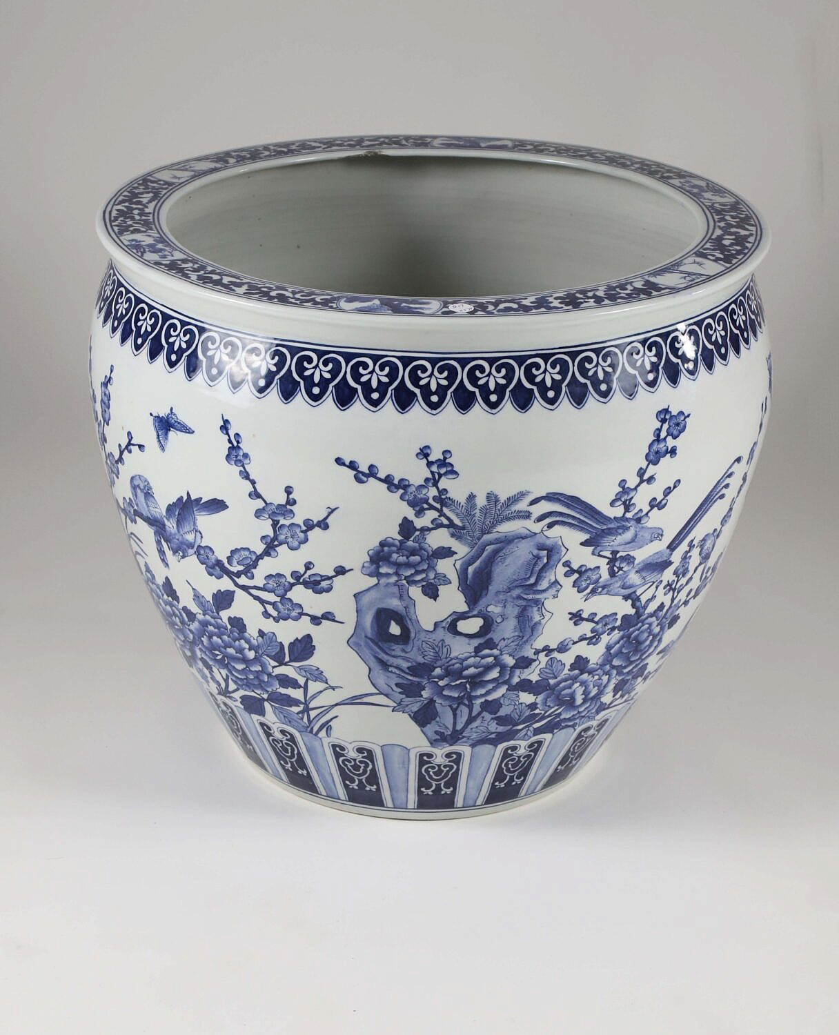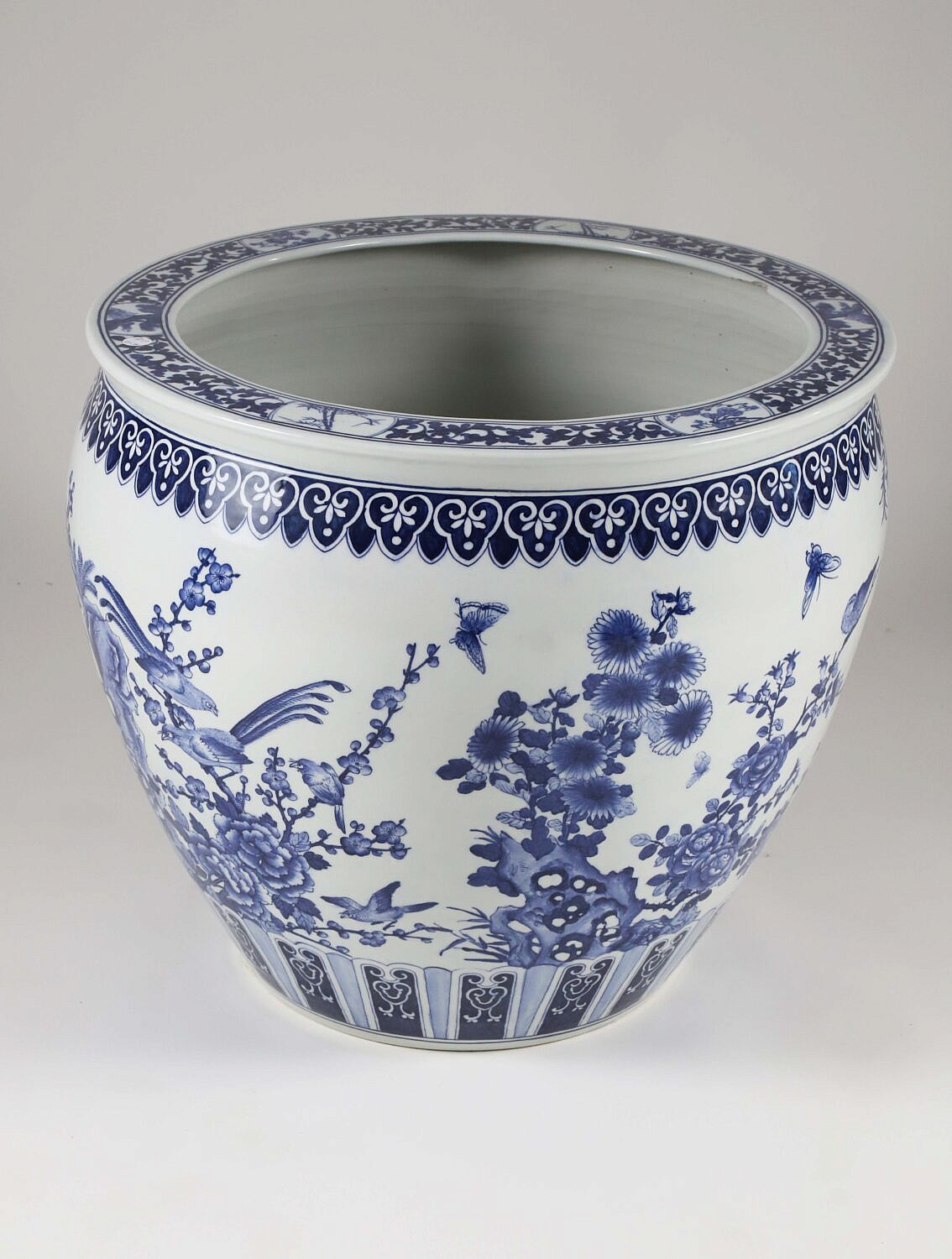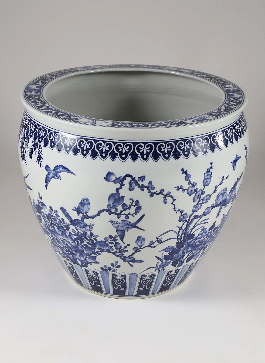 Large Canton Style Blue and White Jardiniere Decorated with Cherry Blossom Branches, Birds and Butterflies