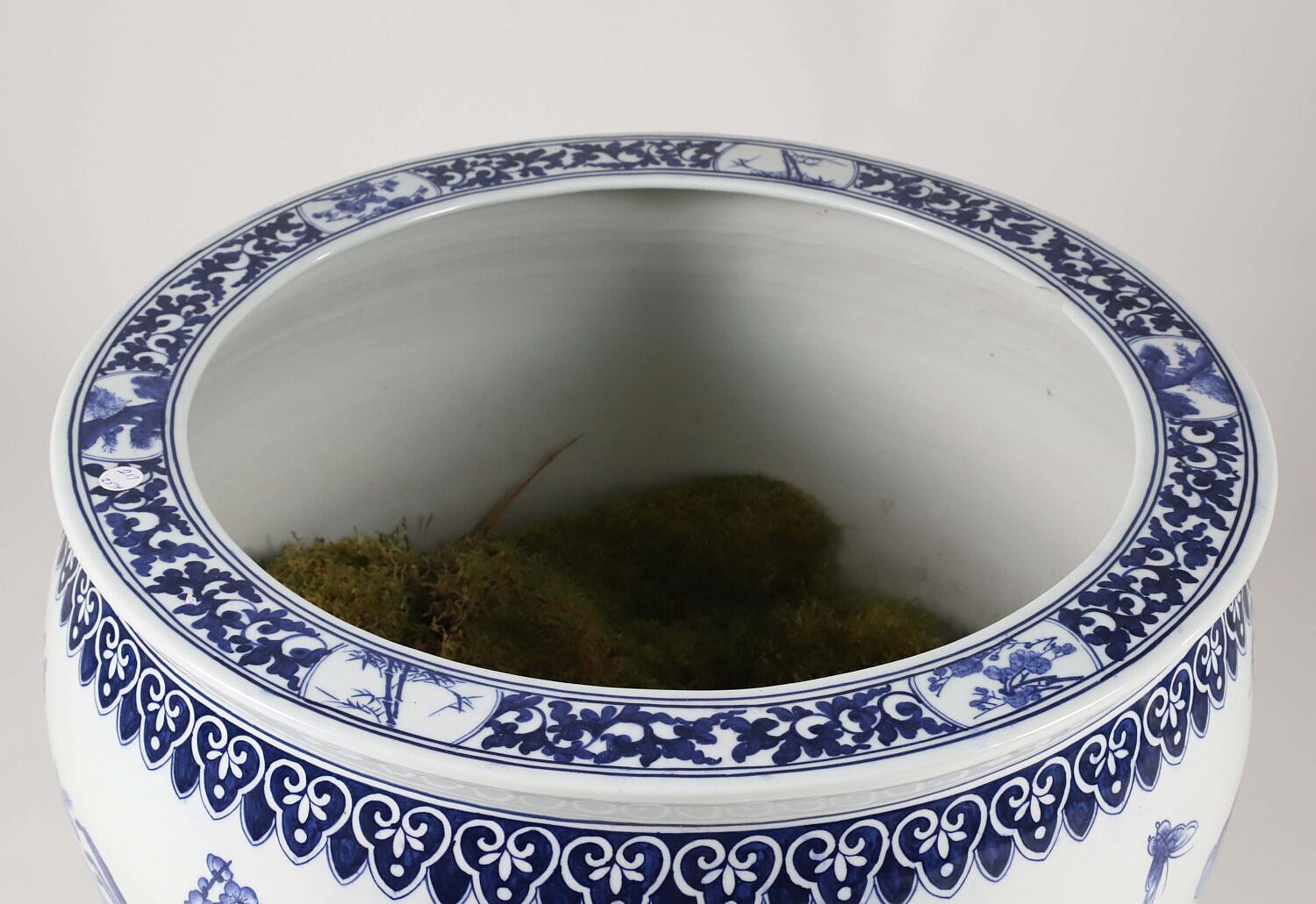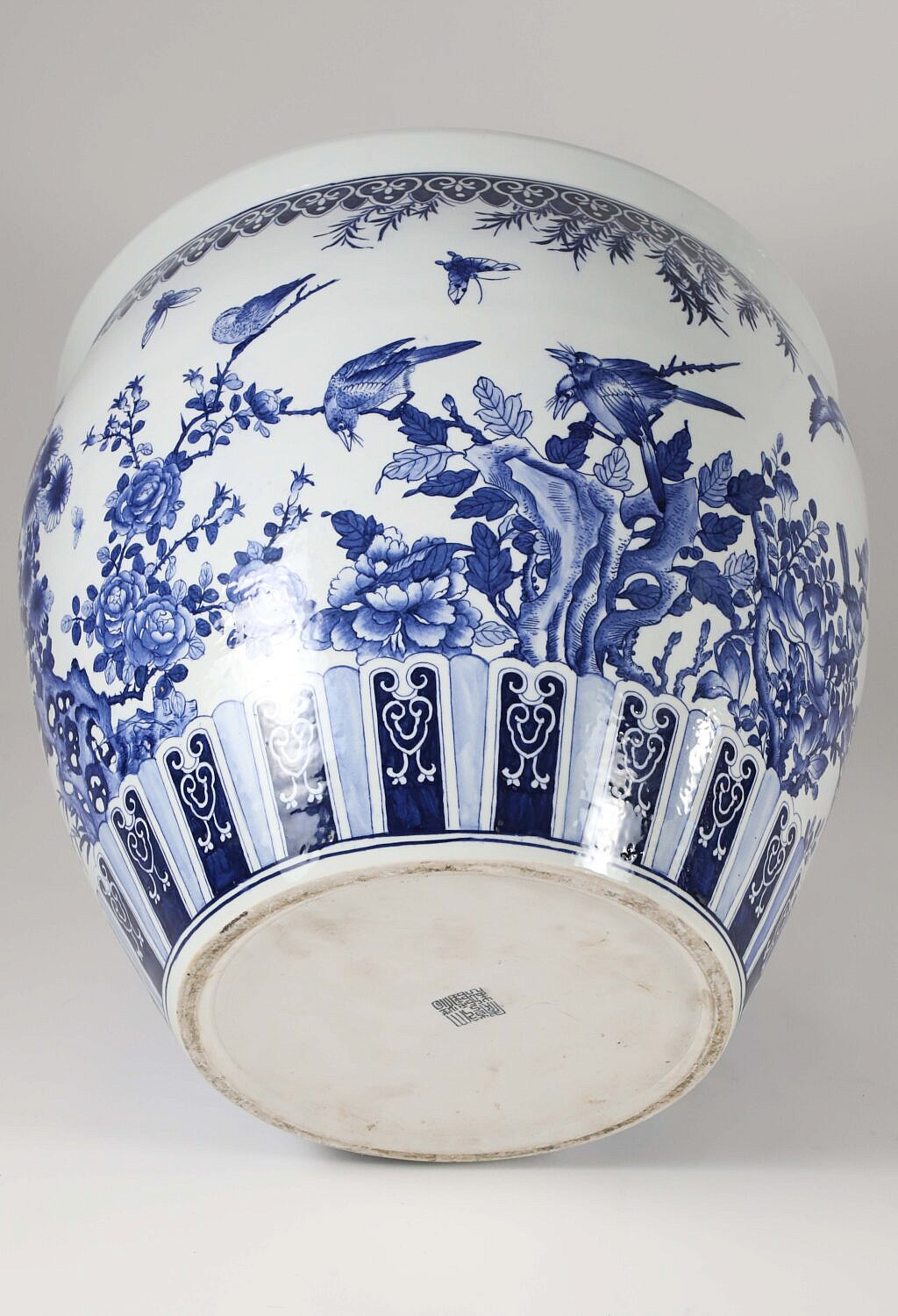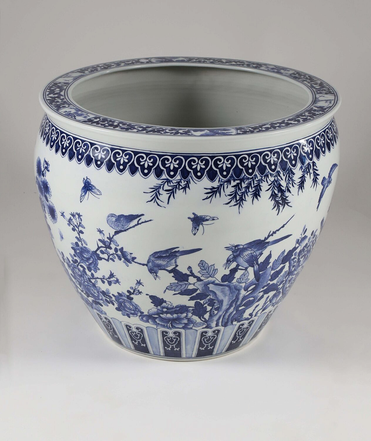 Large Canton Style Blue and White Jardiniere Decorated with Cherry Blossom Branches, Birds and Butterflies