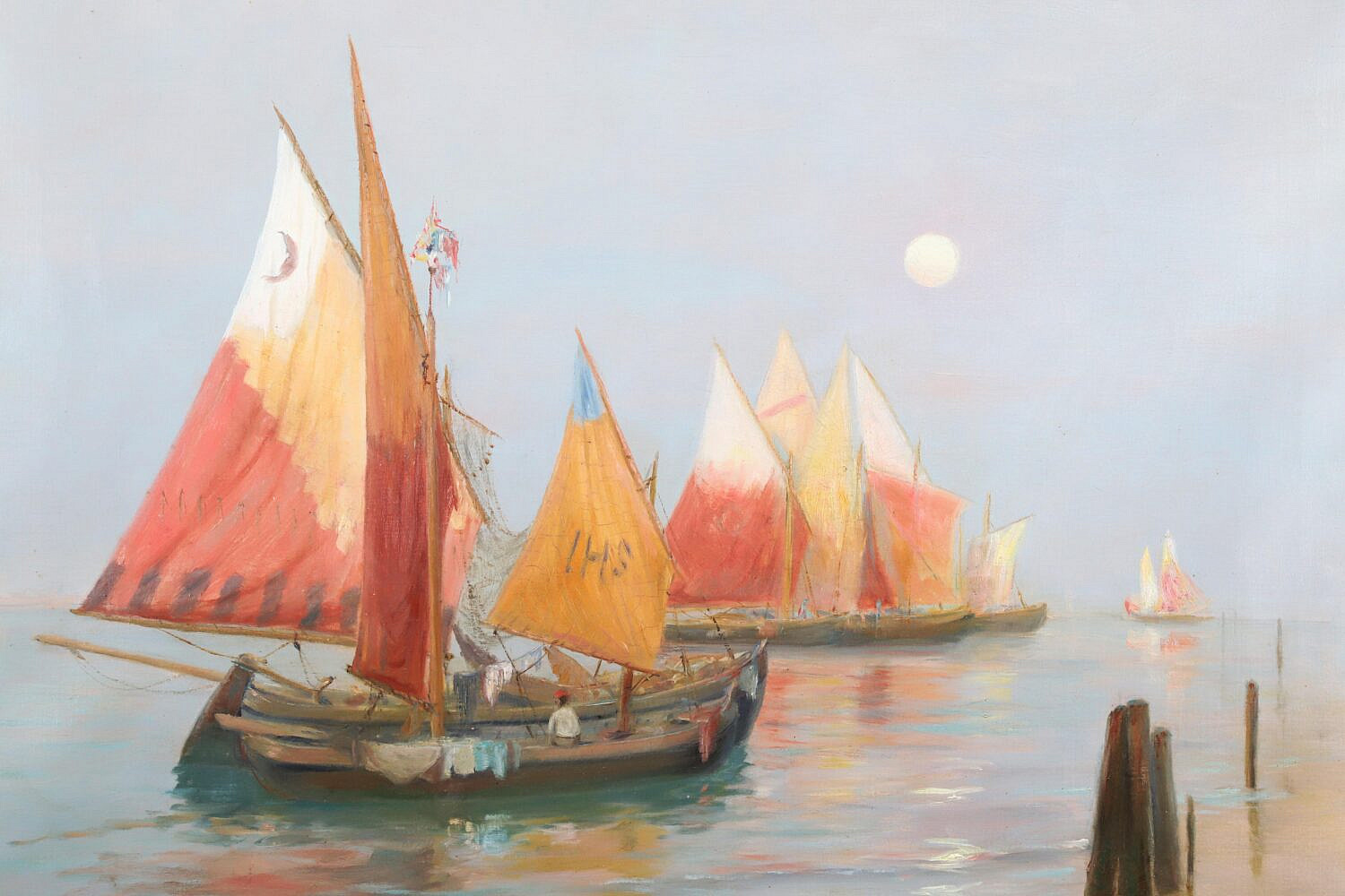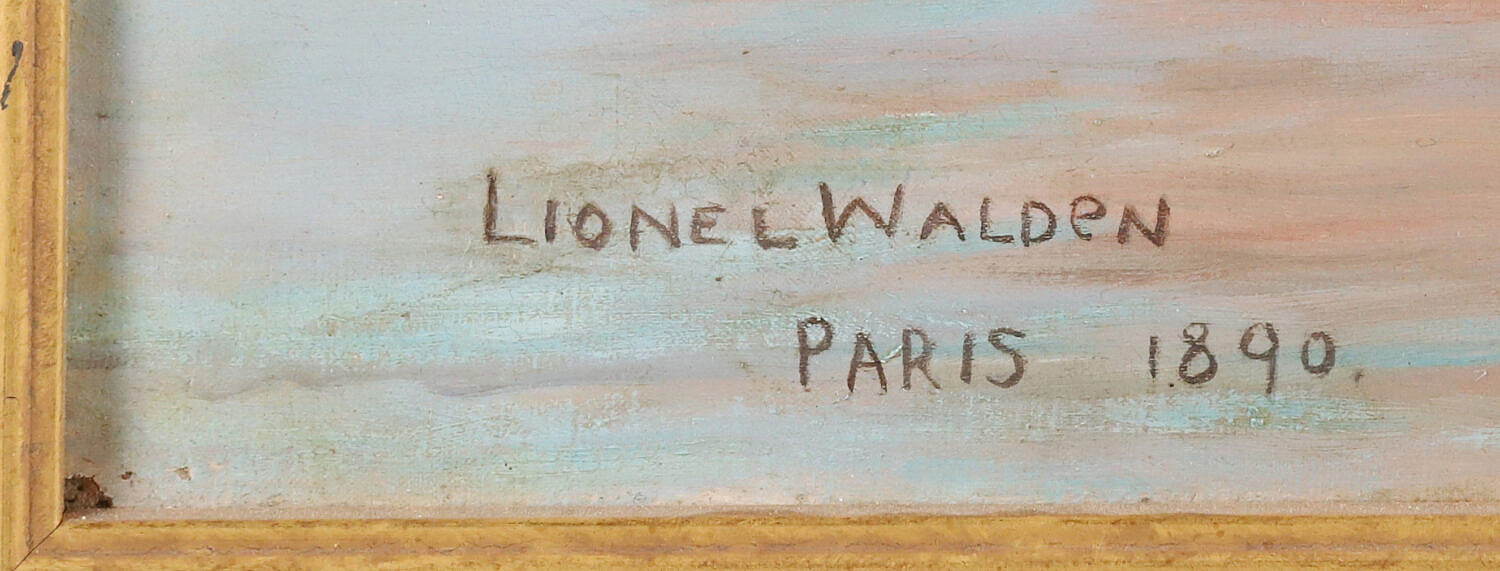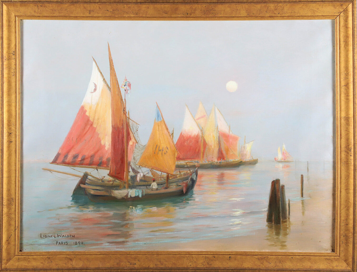 Lionel Walden (American 1861-1933) Oil on Canvas, “French Fishing Fleet”, signed lower left Lionel Walden, Paris, 1890, in molded wood frame