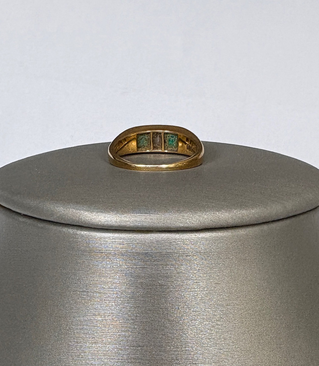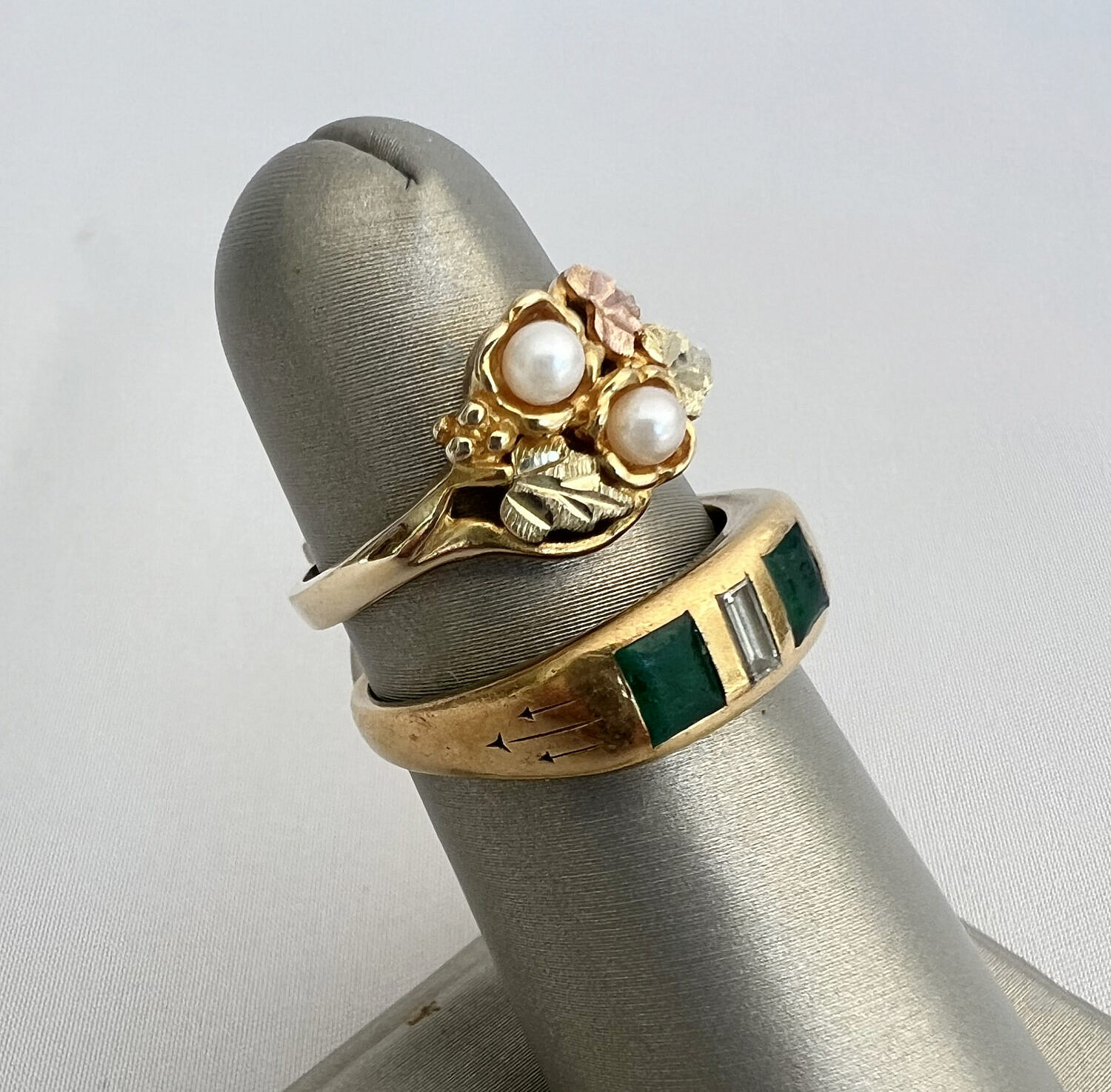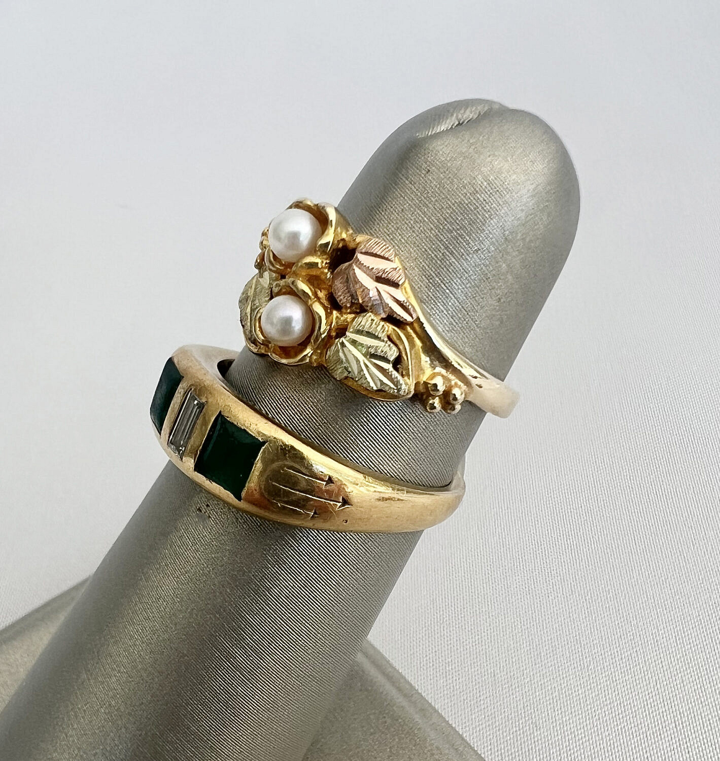 - 10k yellow gold lady’s leaf embossed ring with 2 seed pearls, size 5.5