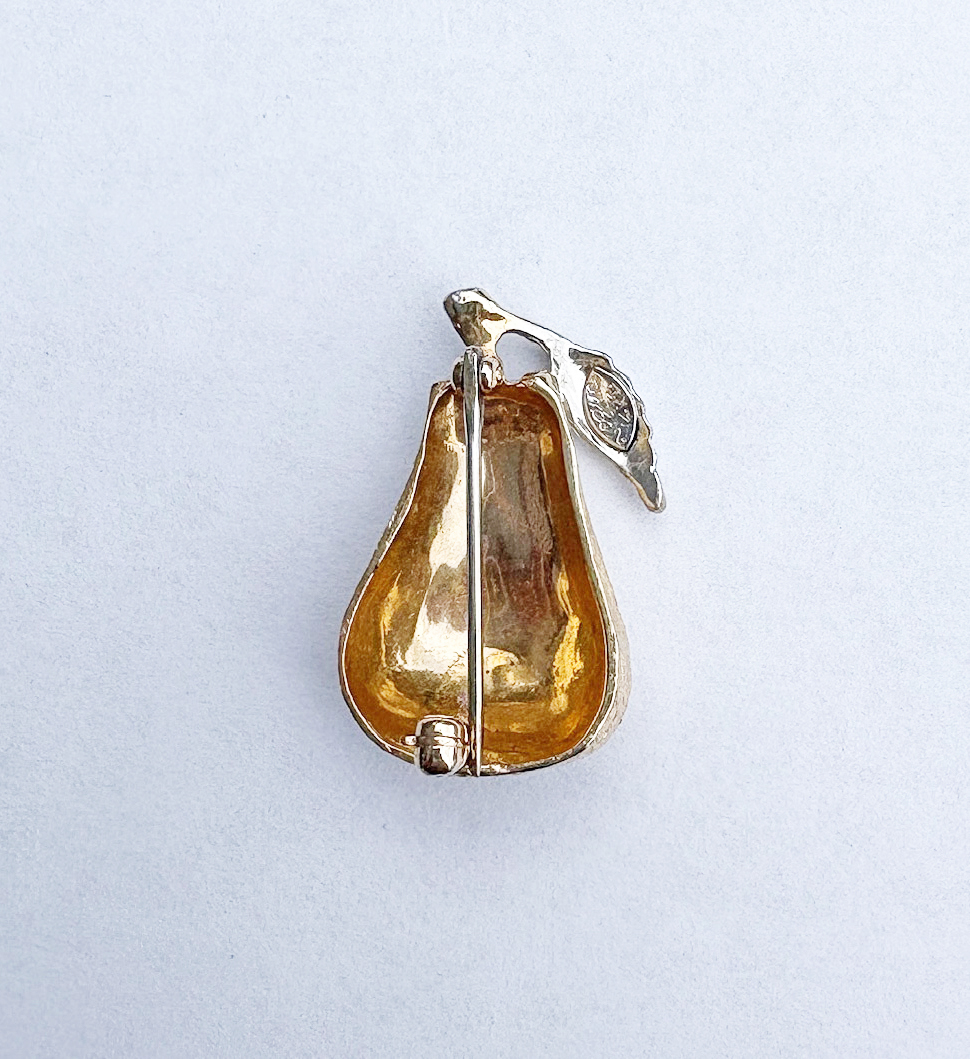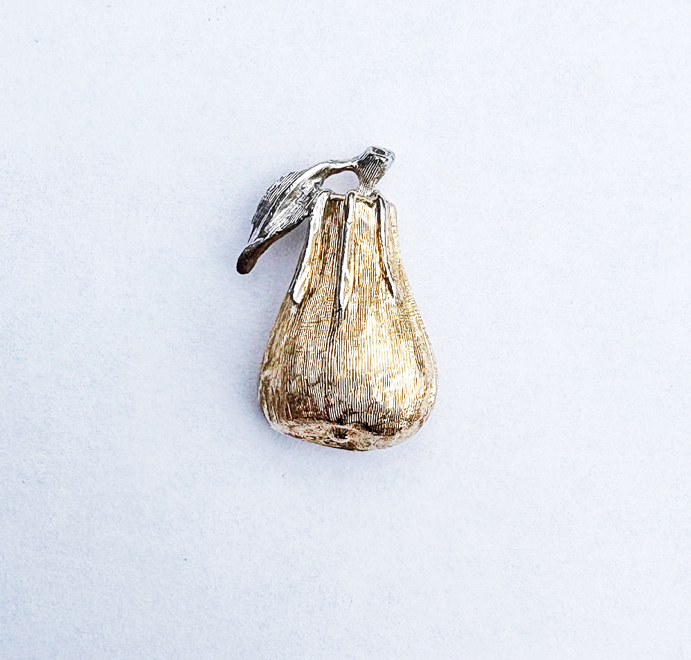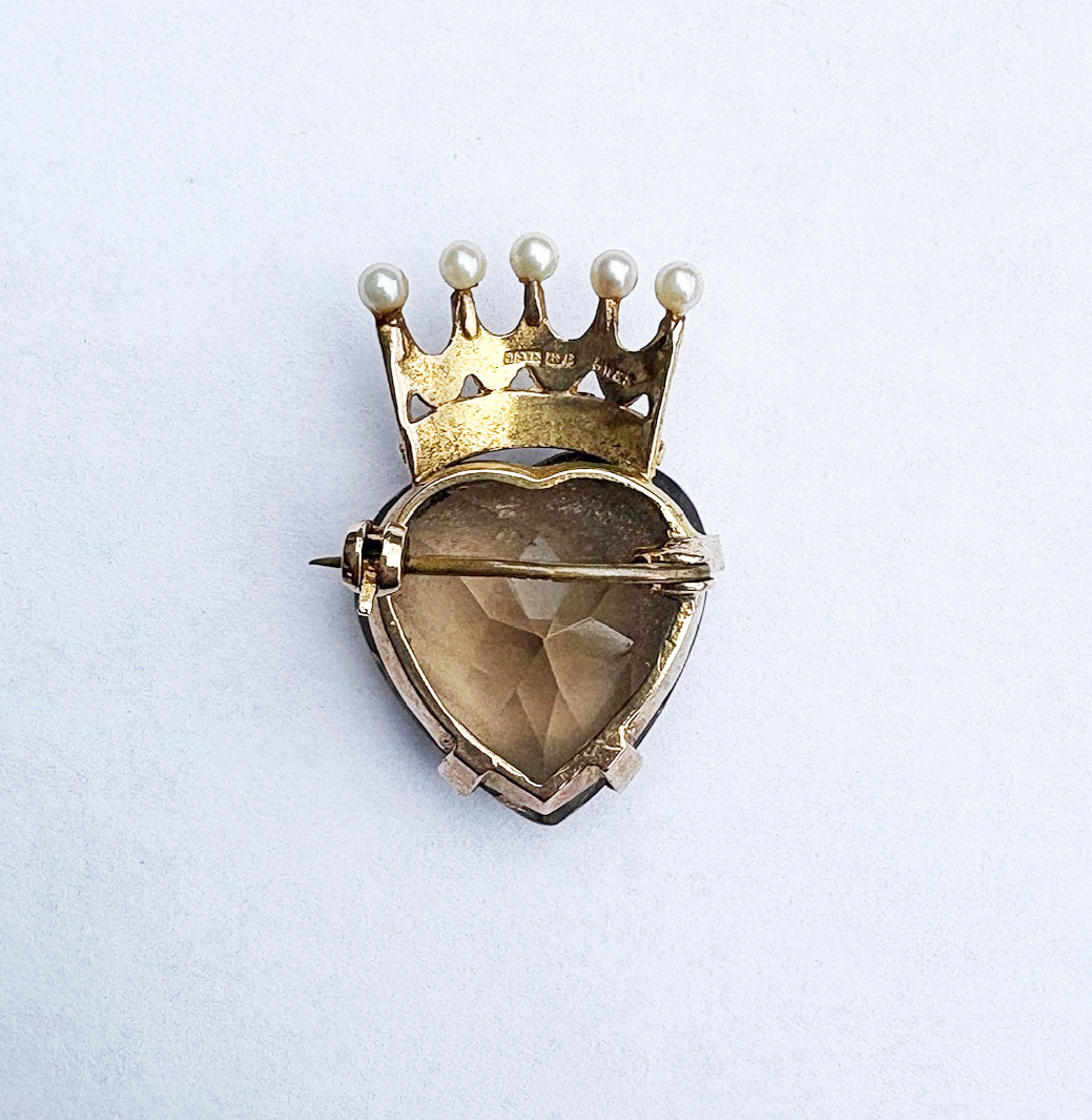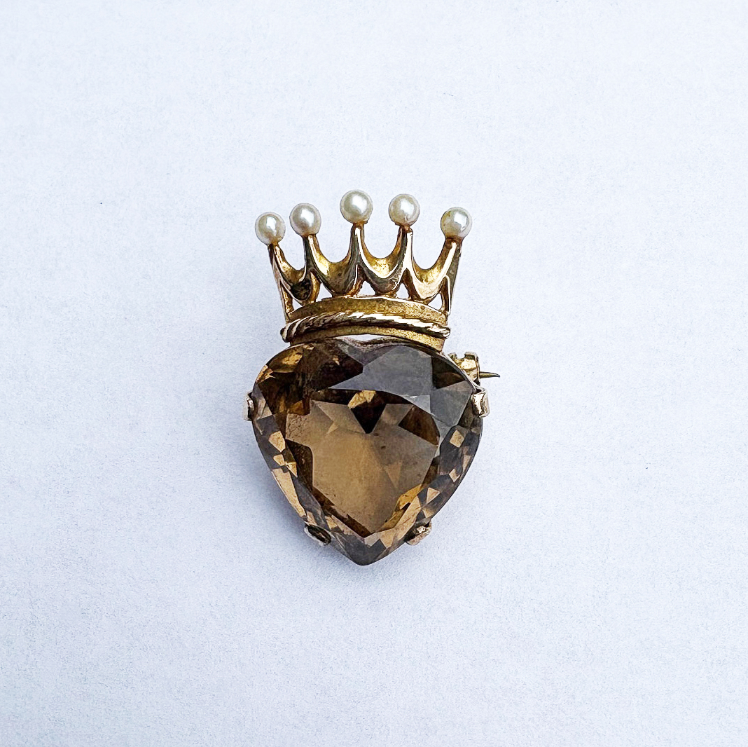 - smokey topaz heart shaped crown pin set in 14k gold with five seed pearls on crown