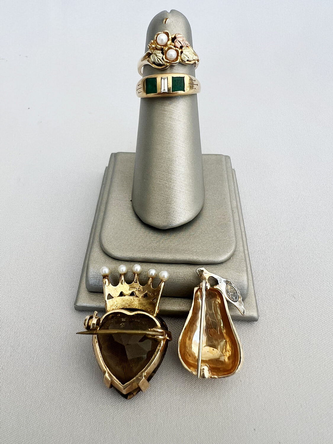 Assorted 14k and 18k Gold and Silver Pins and Two Rings Comprising:
