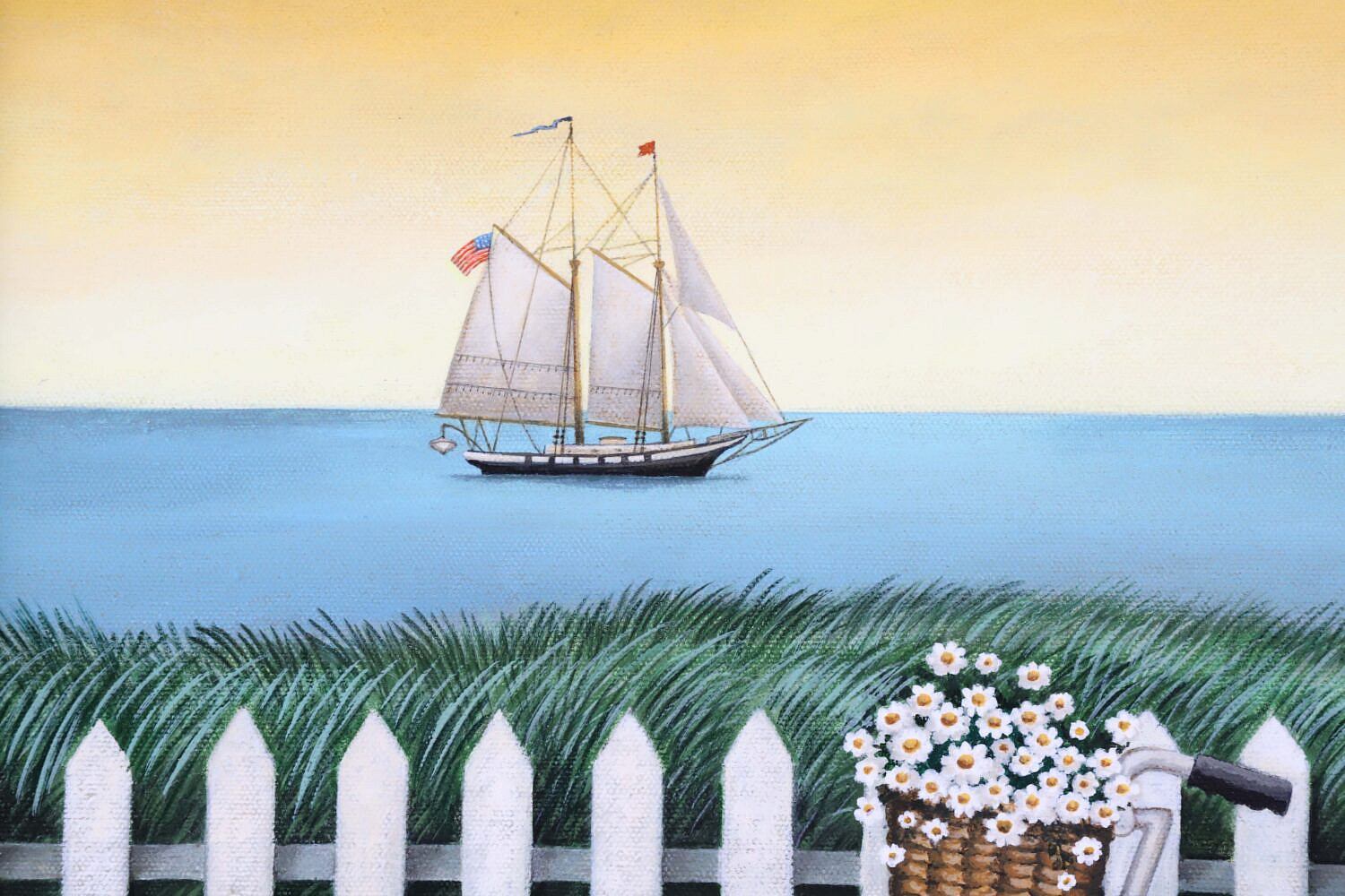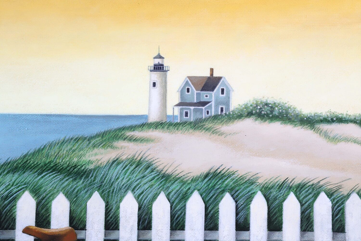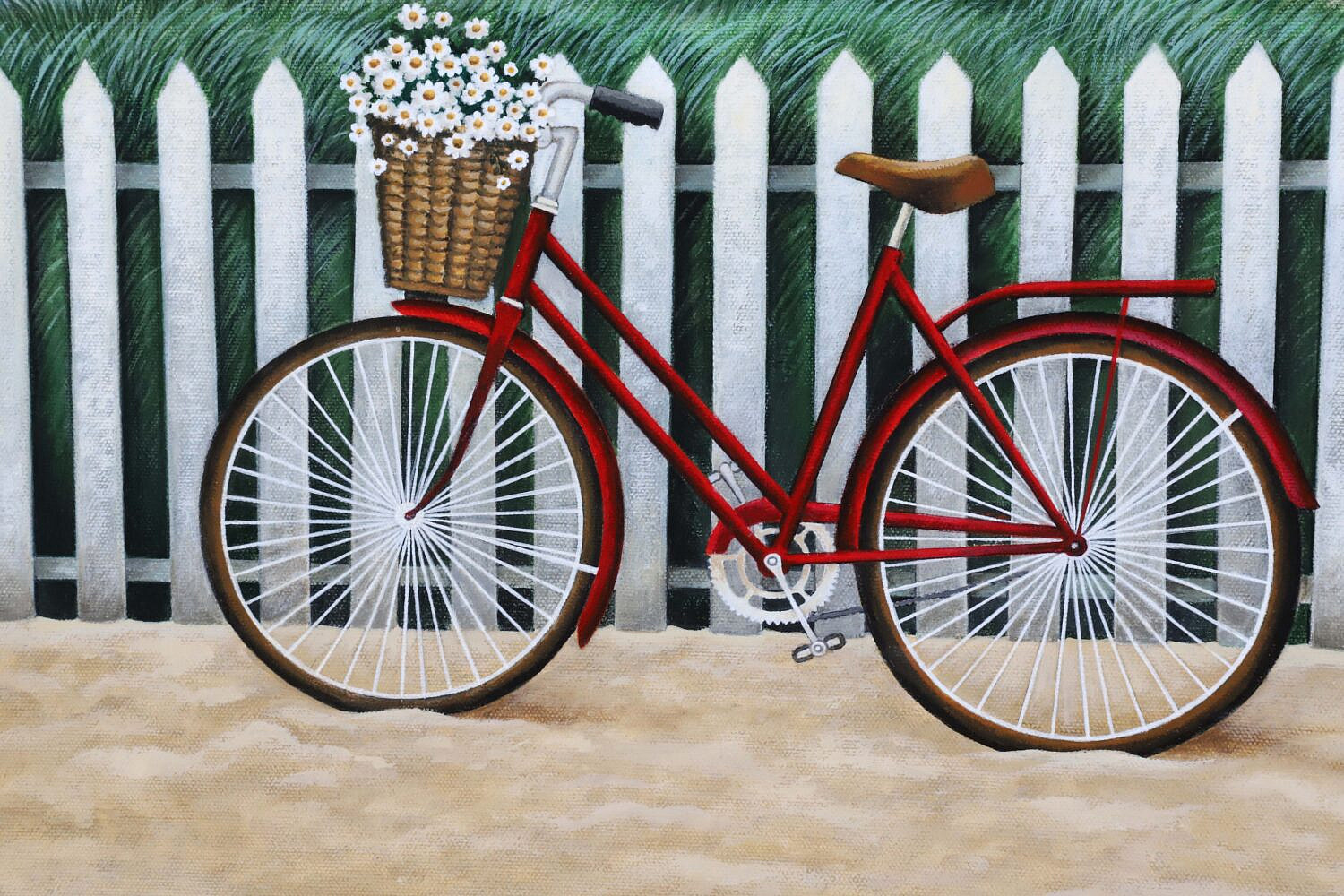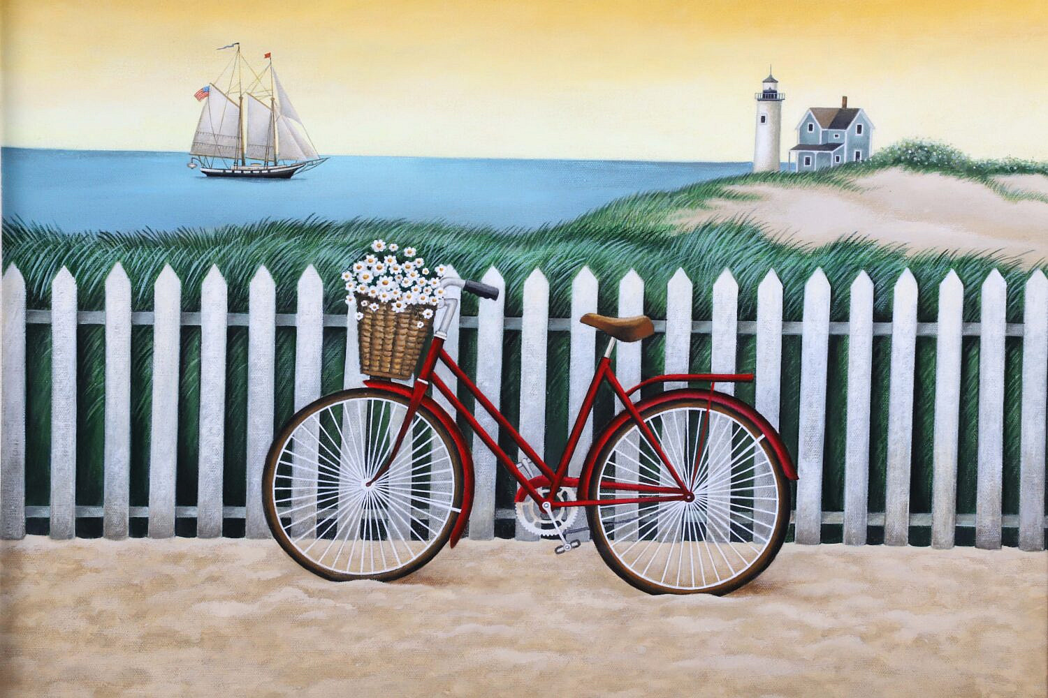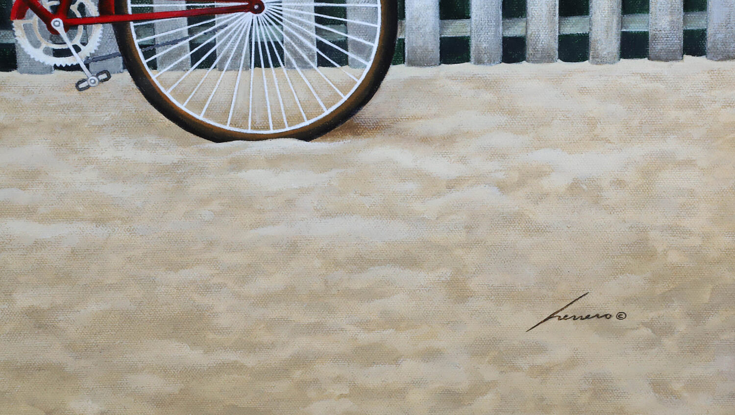 Lowell Herrero (American 1921-2015) Oil on Canvas “Bicycle at the Beach”, circa 1988, signed lower right Herrero, in molded wood frame