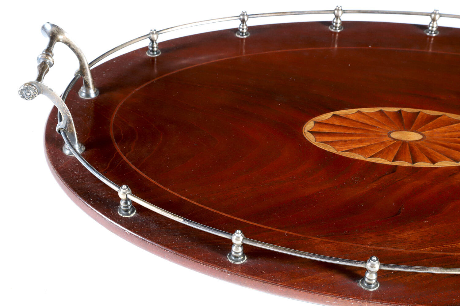 Mahogany Multi-Wood Inlaid Silver Plated Gallery Serving Tray Consign Now DeptDecorative ArtsSizeLength 19 in. Mahogany Multi-Wood Inlaid Silver Plated Gallery Serving Tray with Silver Plated Handles Length 19 in. Please note that this auction has ended. Click here for an overview of this auction.