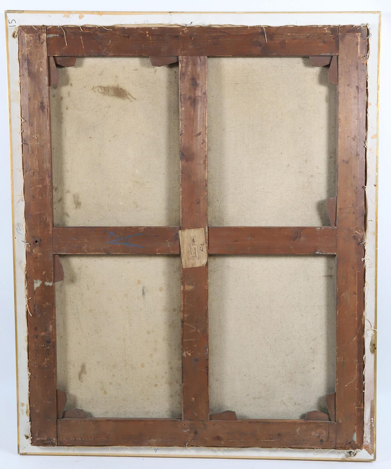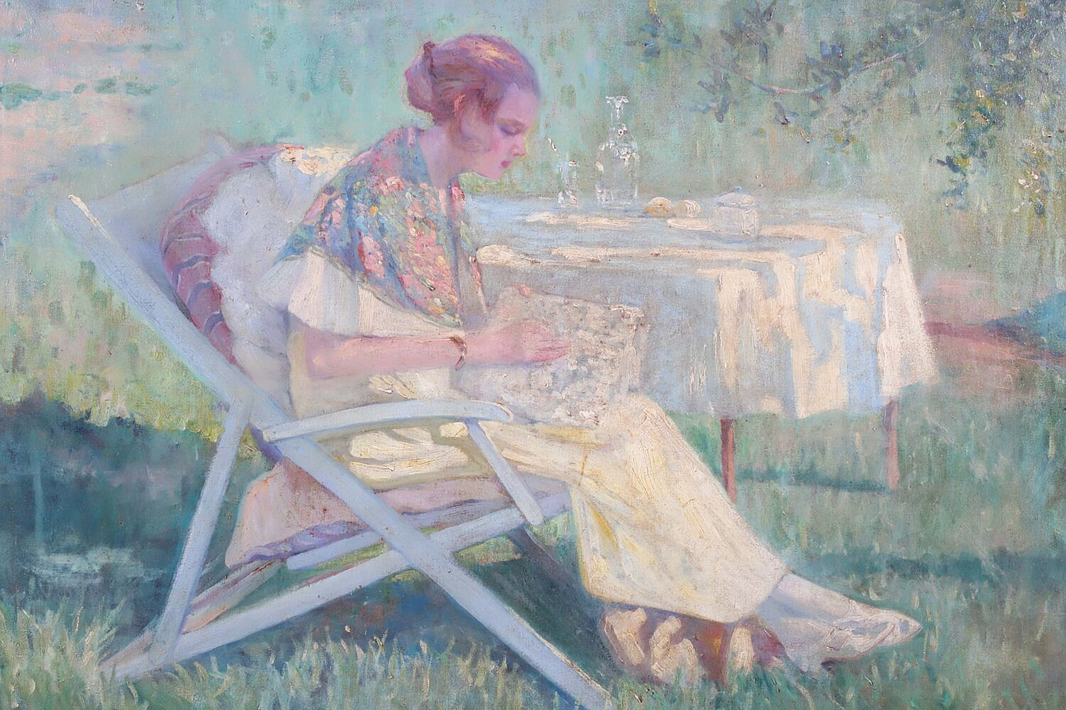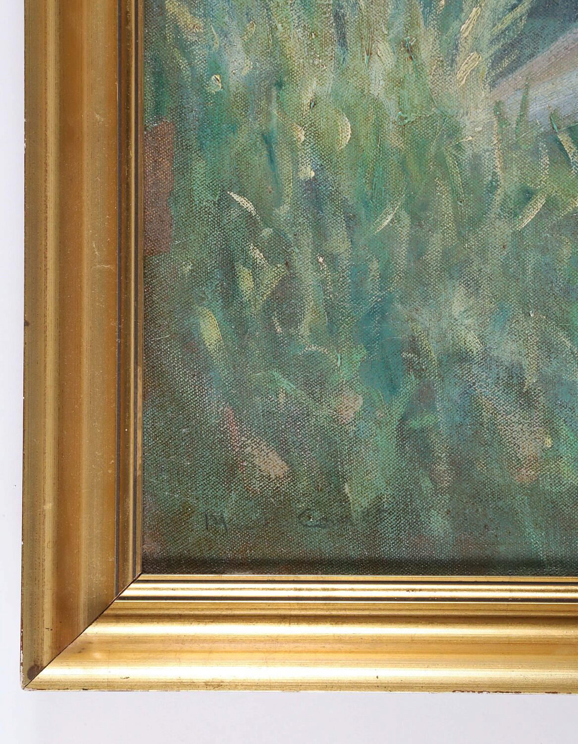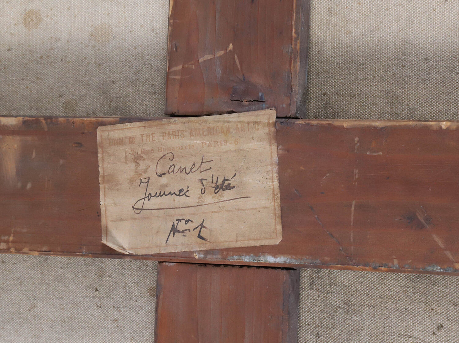 Marcel Canet (Active in France 1879-1959) Oil on Canvas “Lady in the Garden” with original Paris label on reverse, from The Paris American Art, Rue Bonaparte Paris, in molded gilt frame