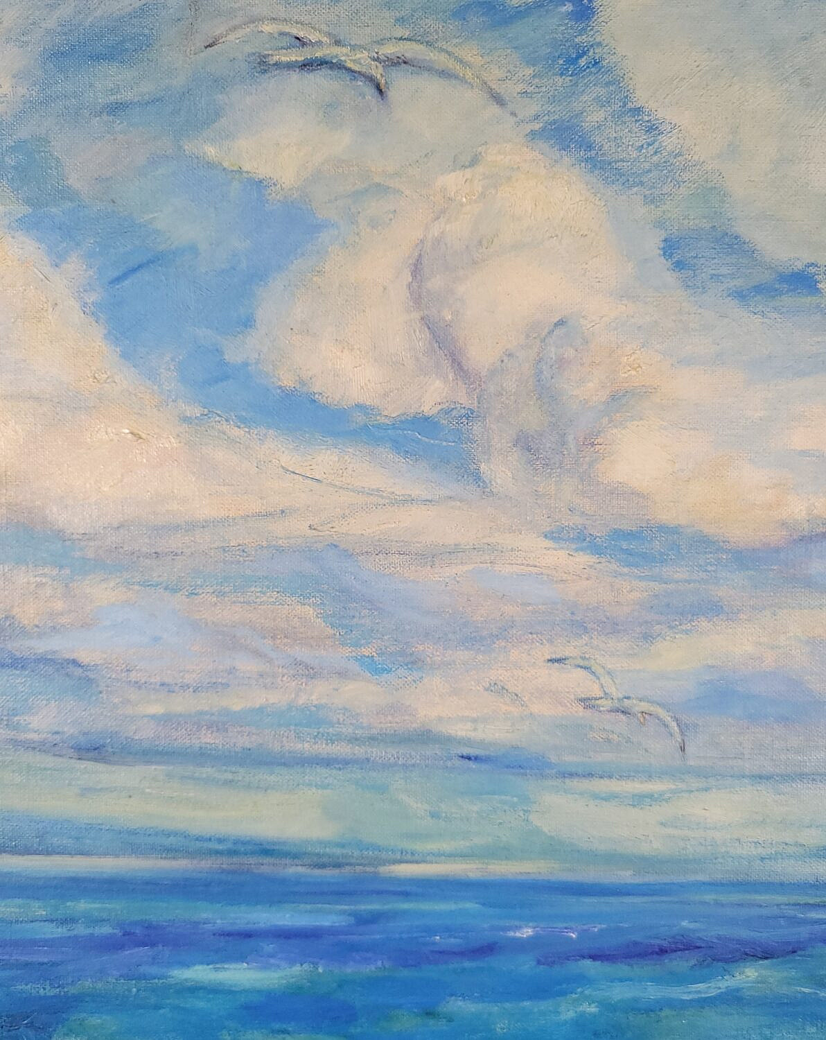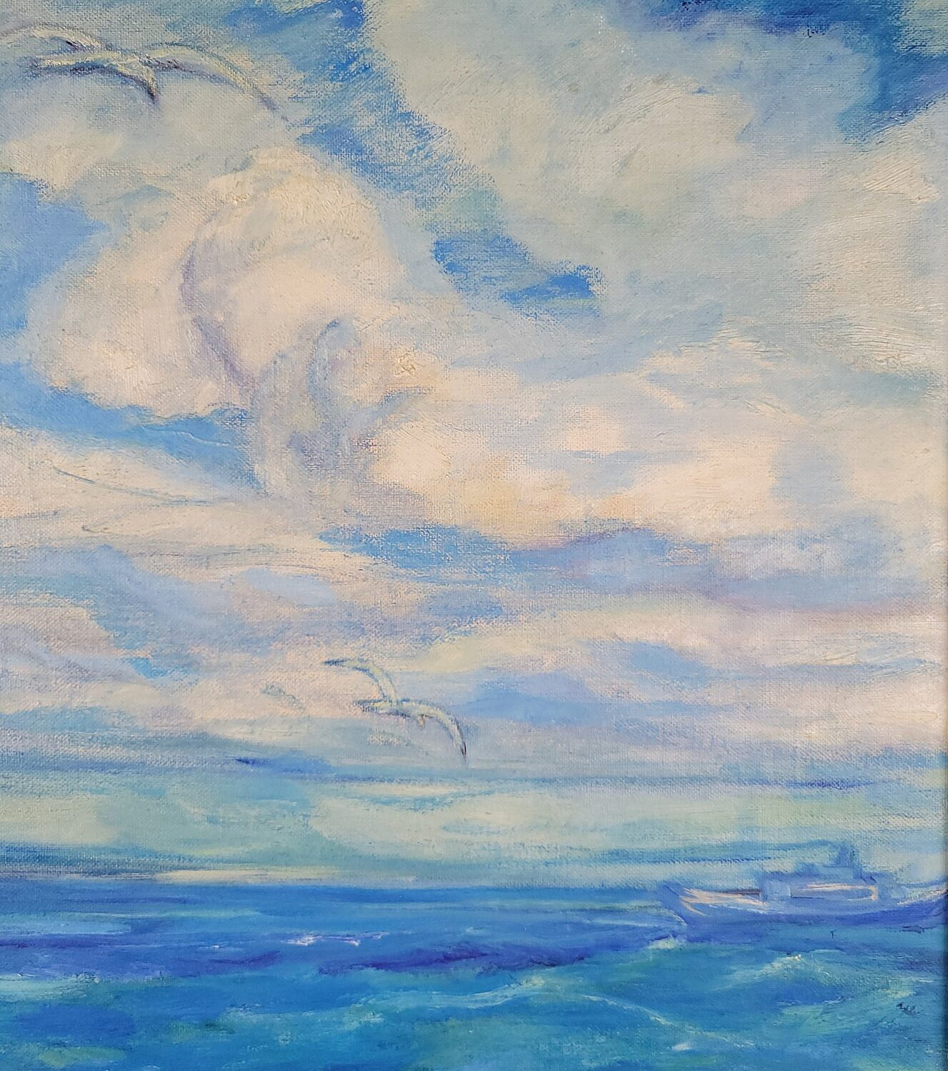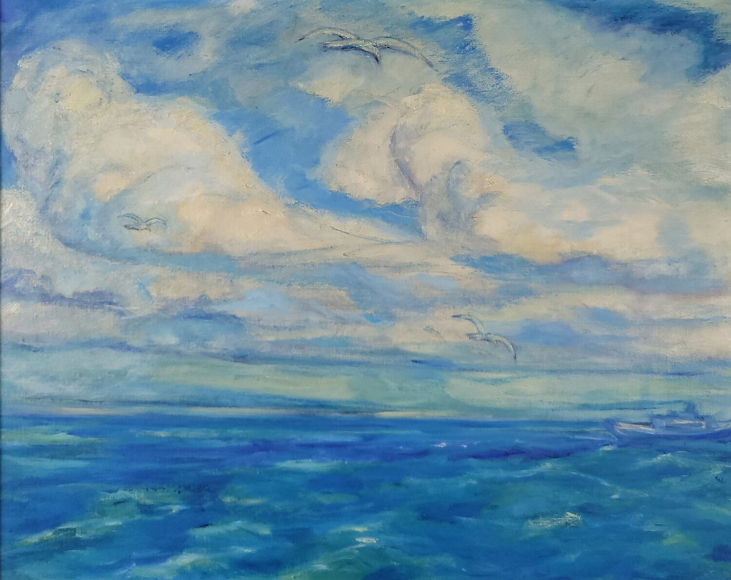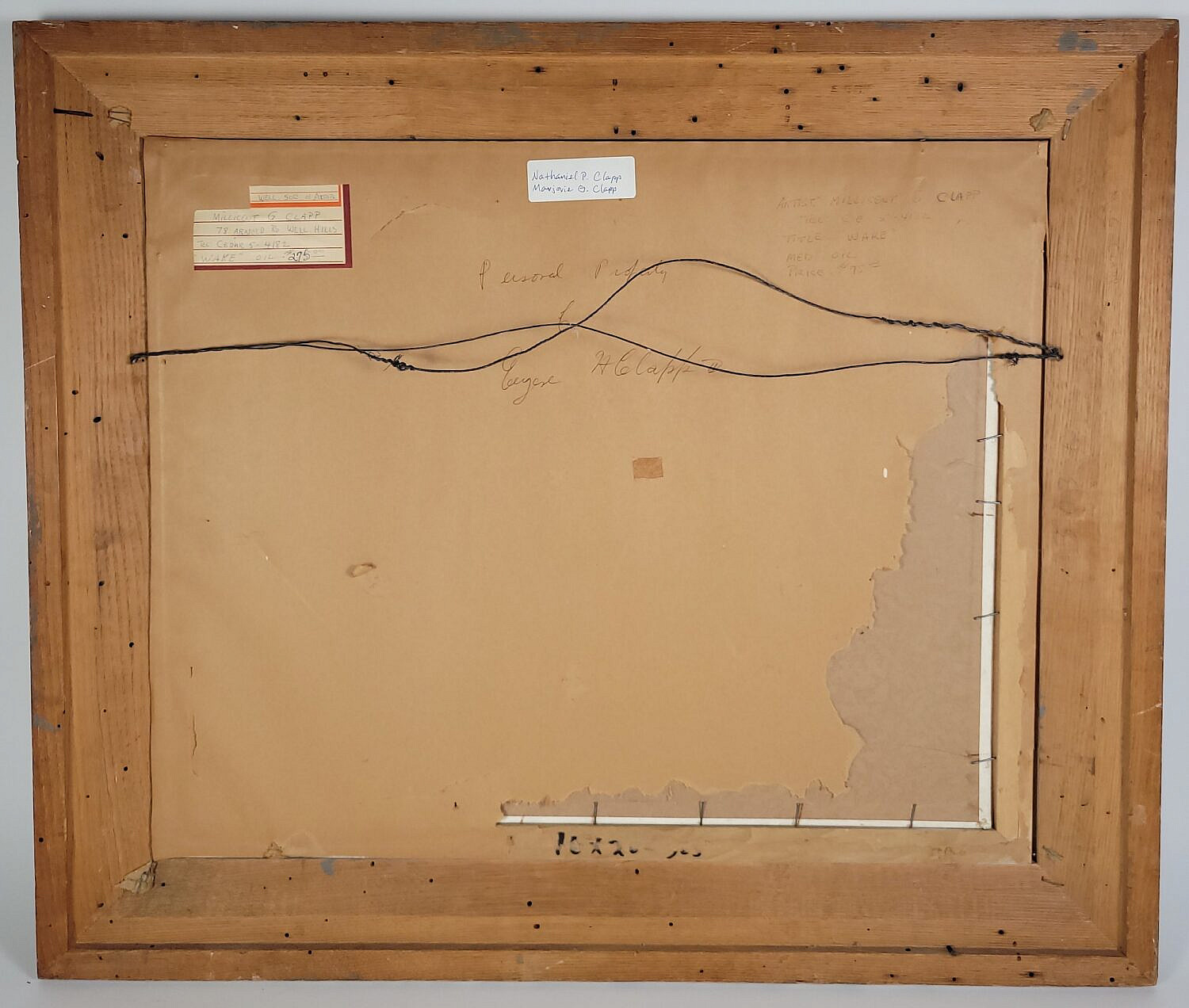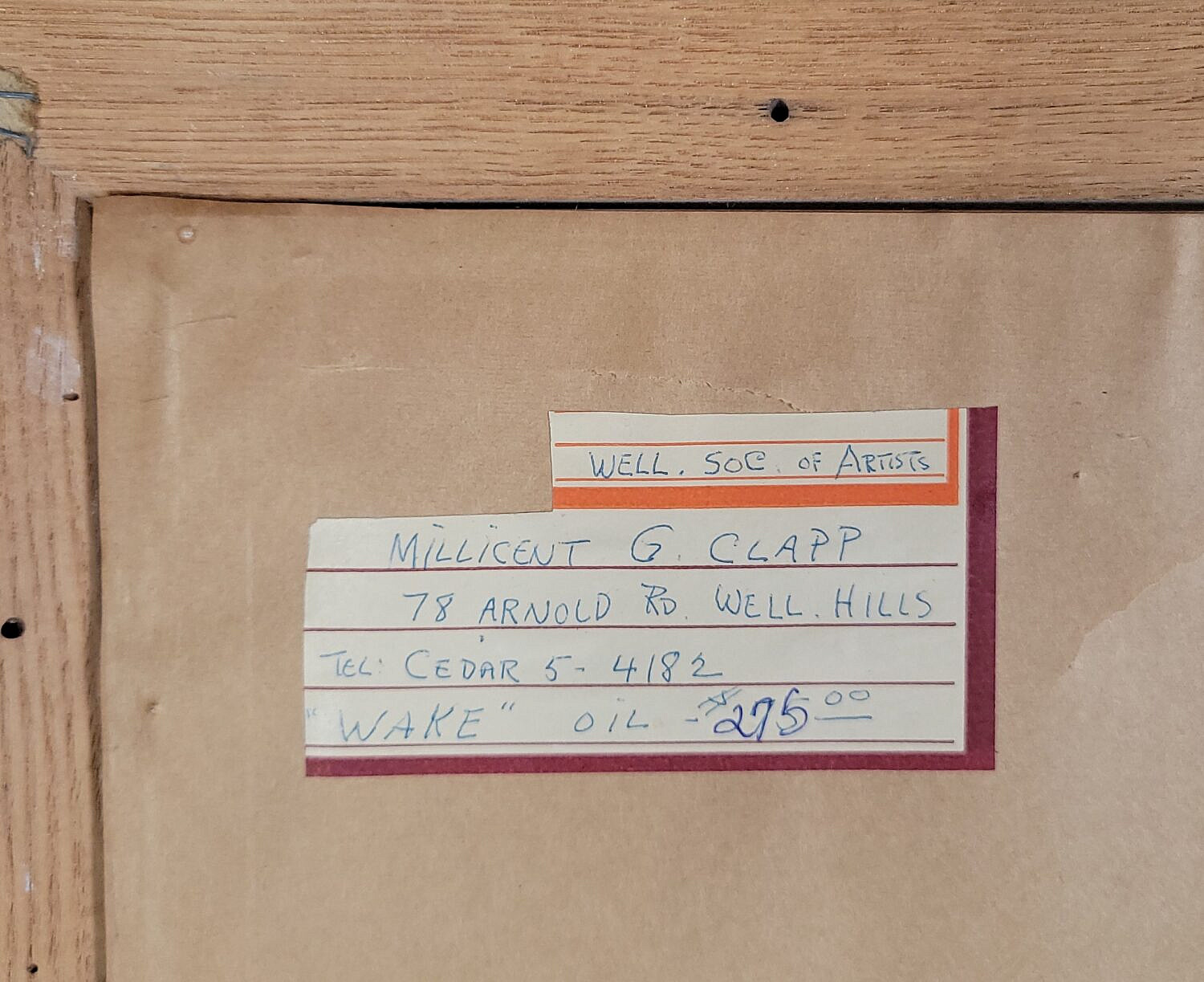 Maud Millicent Greenwood Clapp “The Wake” Nantucket Seascape Painting, mid 20th century, oil on artist’s board, with exhibition label and artist inscription on reverse.