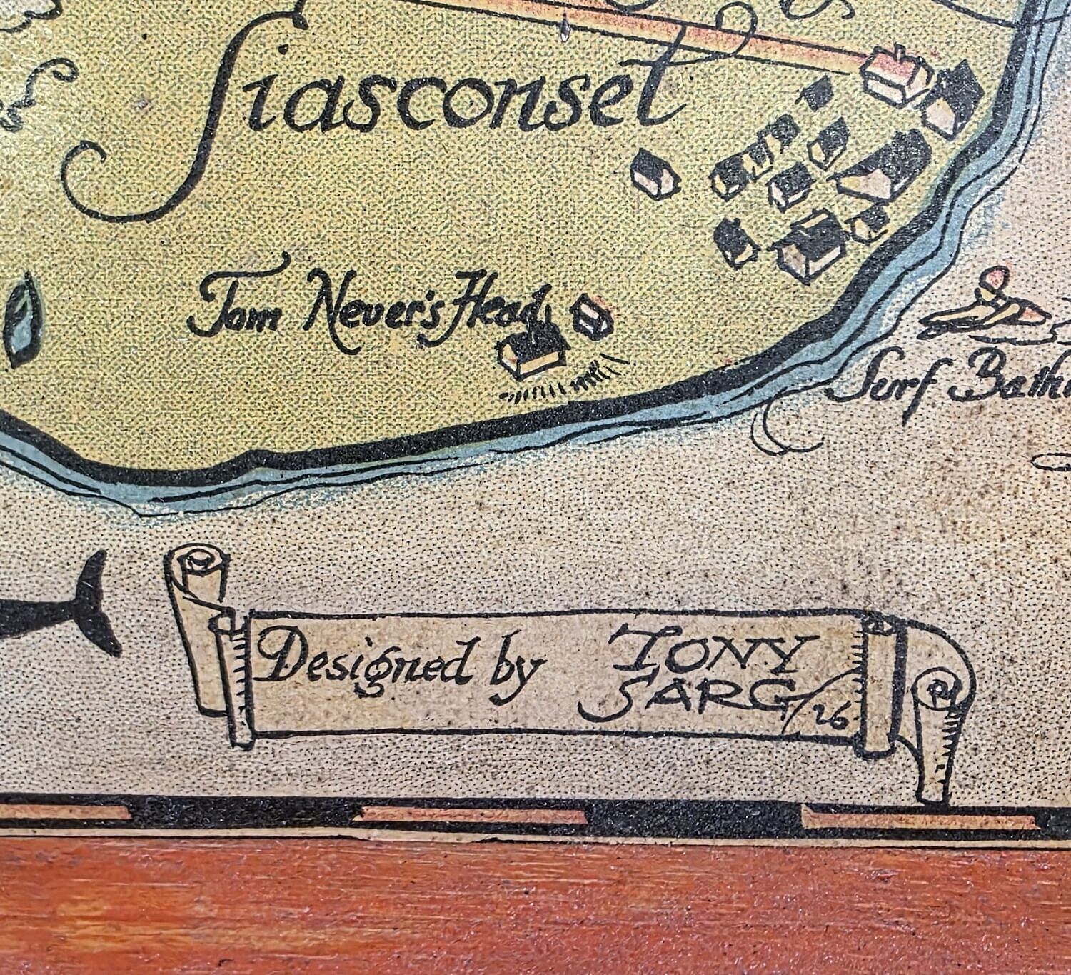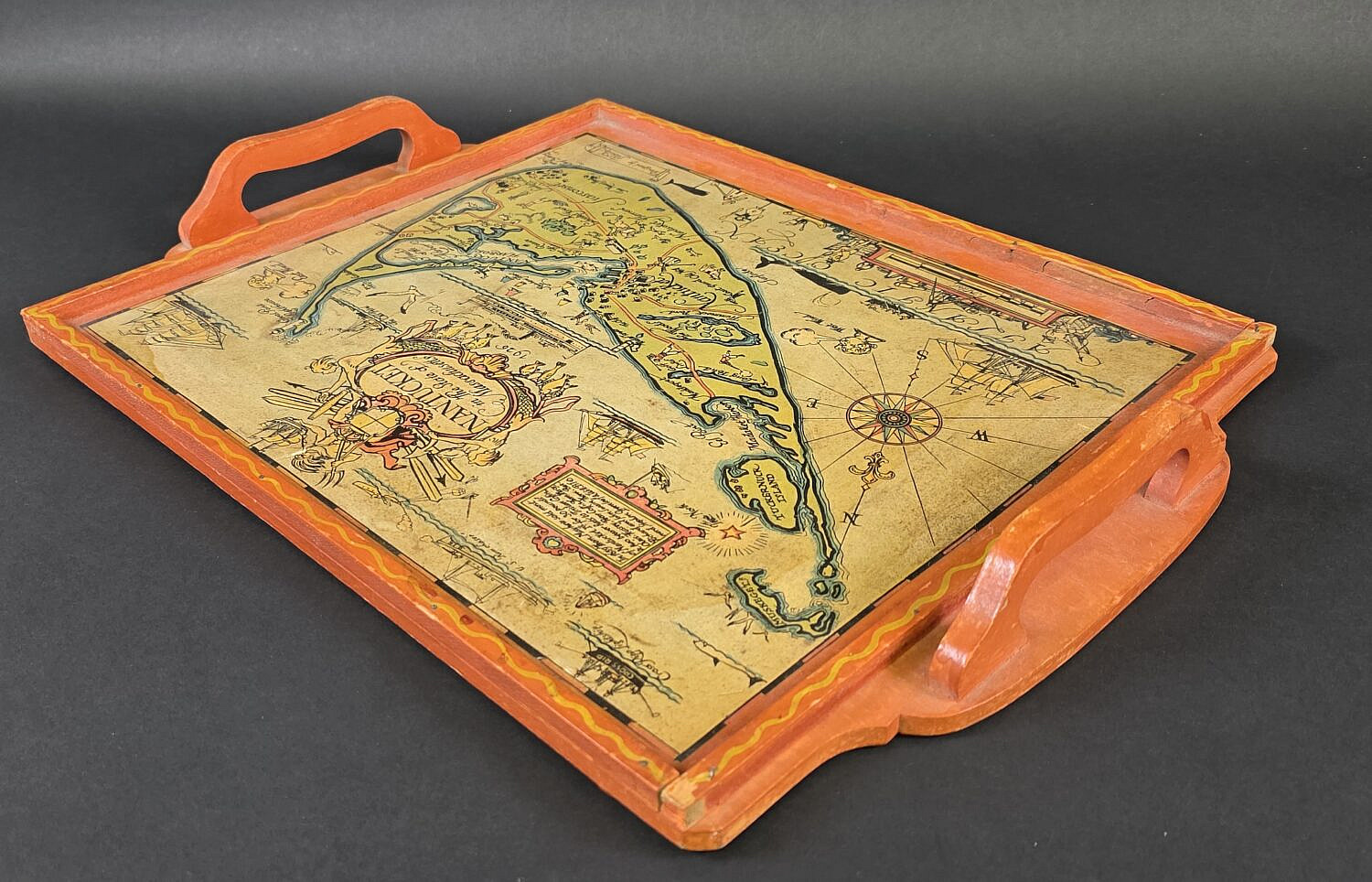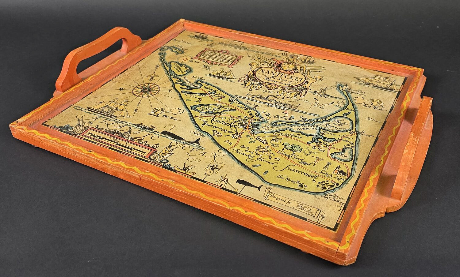 Original Tony Sarg Carved and Painted Nantucket Map Serving Tray, 20th century, with original makers label on reverse.