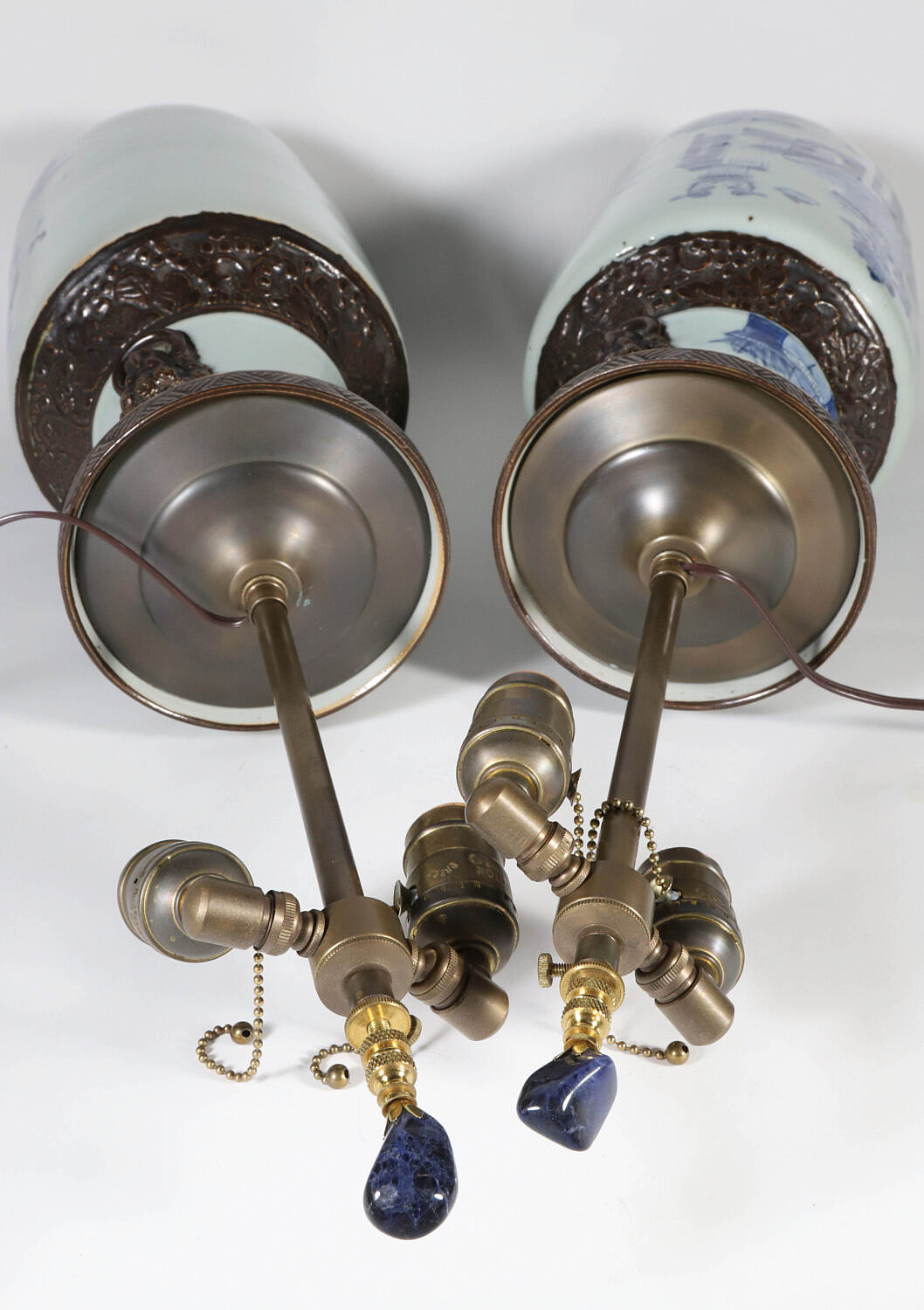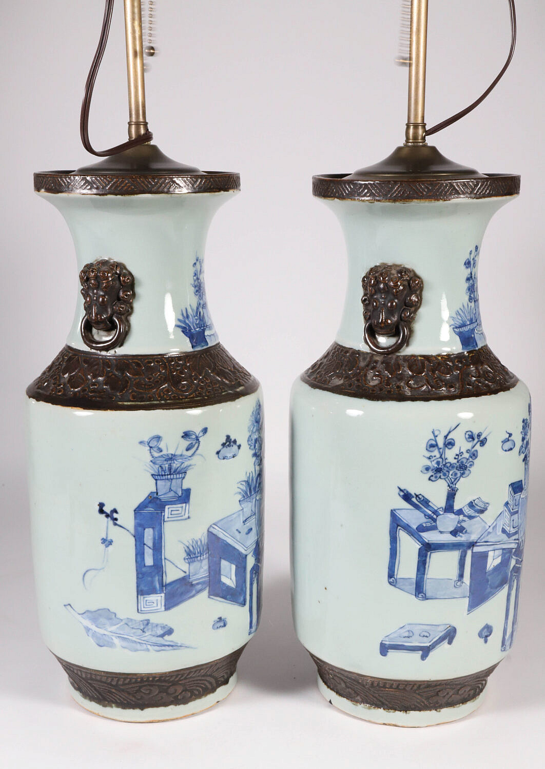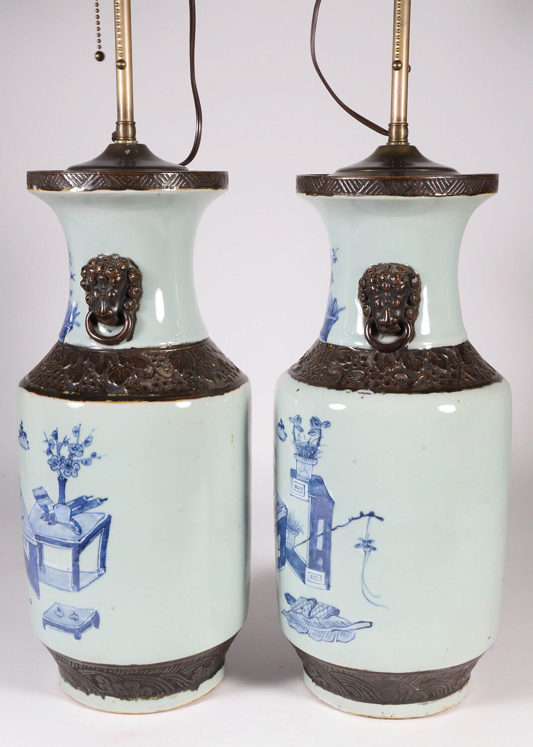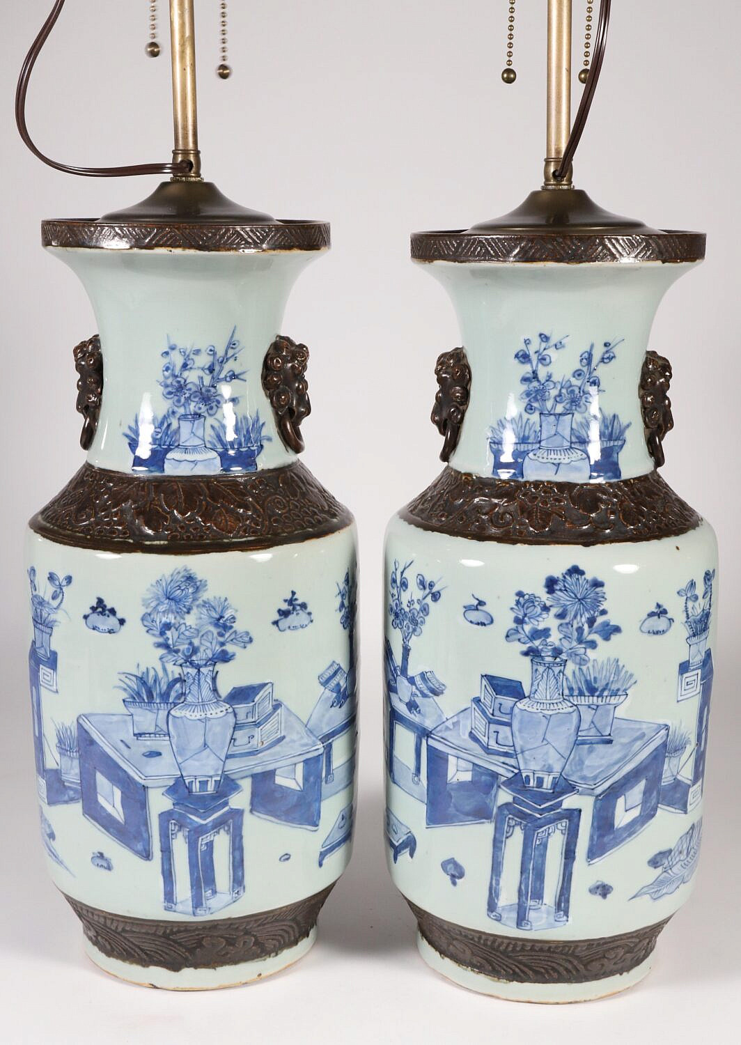 Pair of Chinese Blue and White Porcelain Vases Mounted as Lamps, electrified, but not drilled; fine detail of an interior with floral arrangements, brown patina bands and lion heads with rings