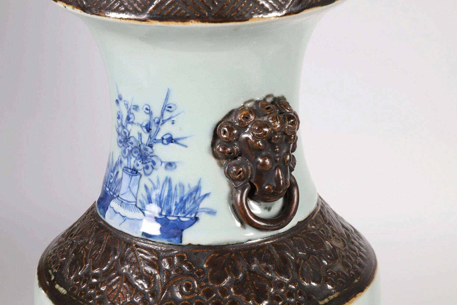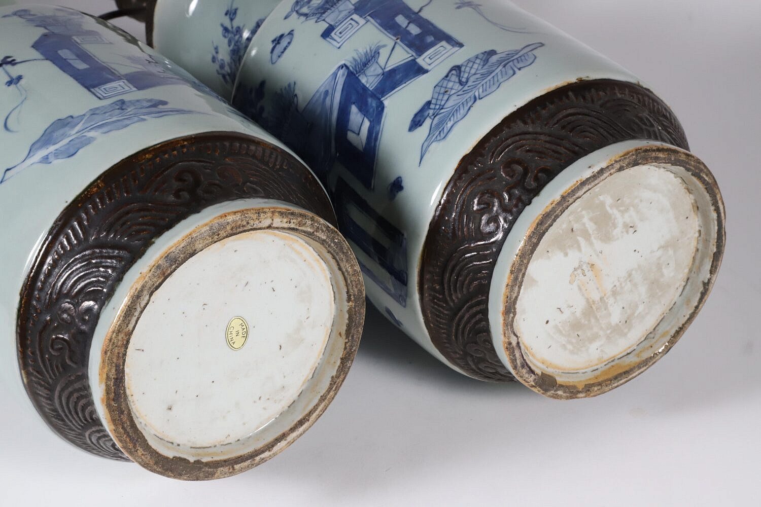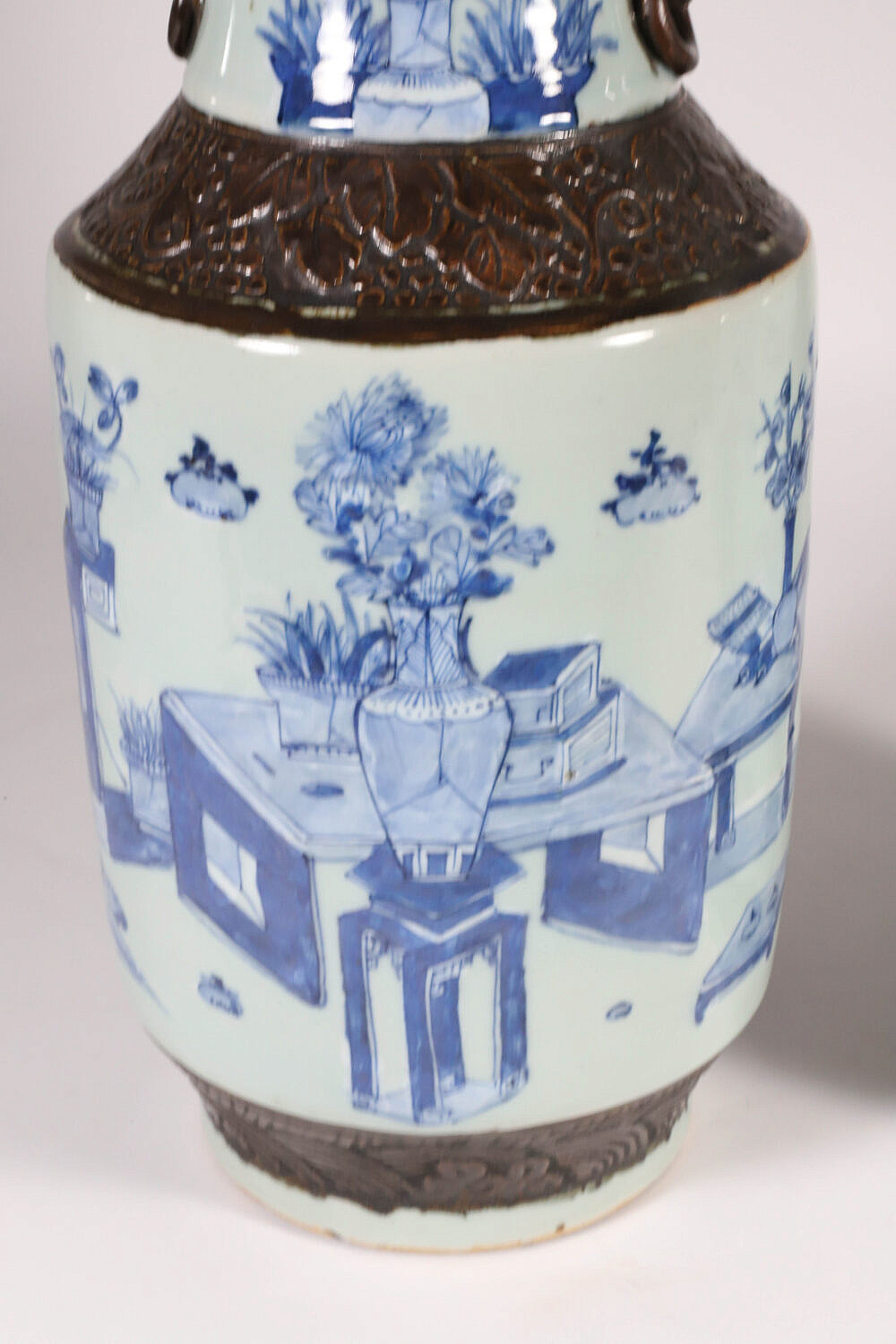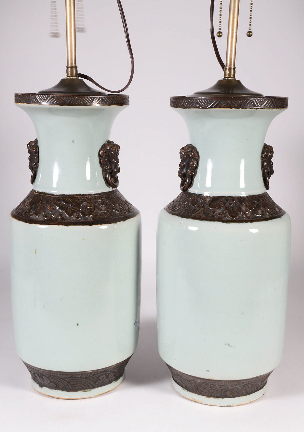 Pair of Chinese Blue and White Porcelain Vases Mounted as Lamps, electrified, but not drilled; fine detail of an interior with floral arrangements, brown patina bands and lion heads with rings