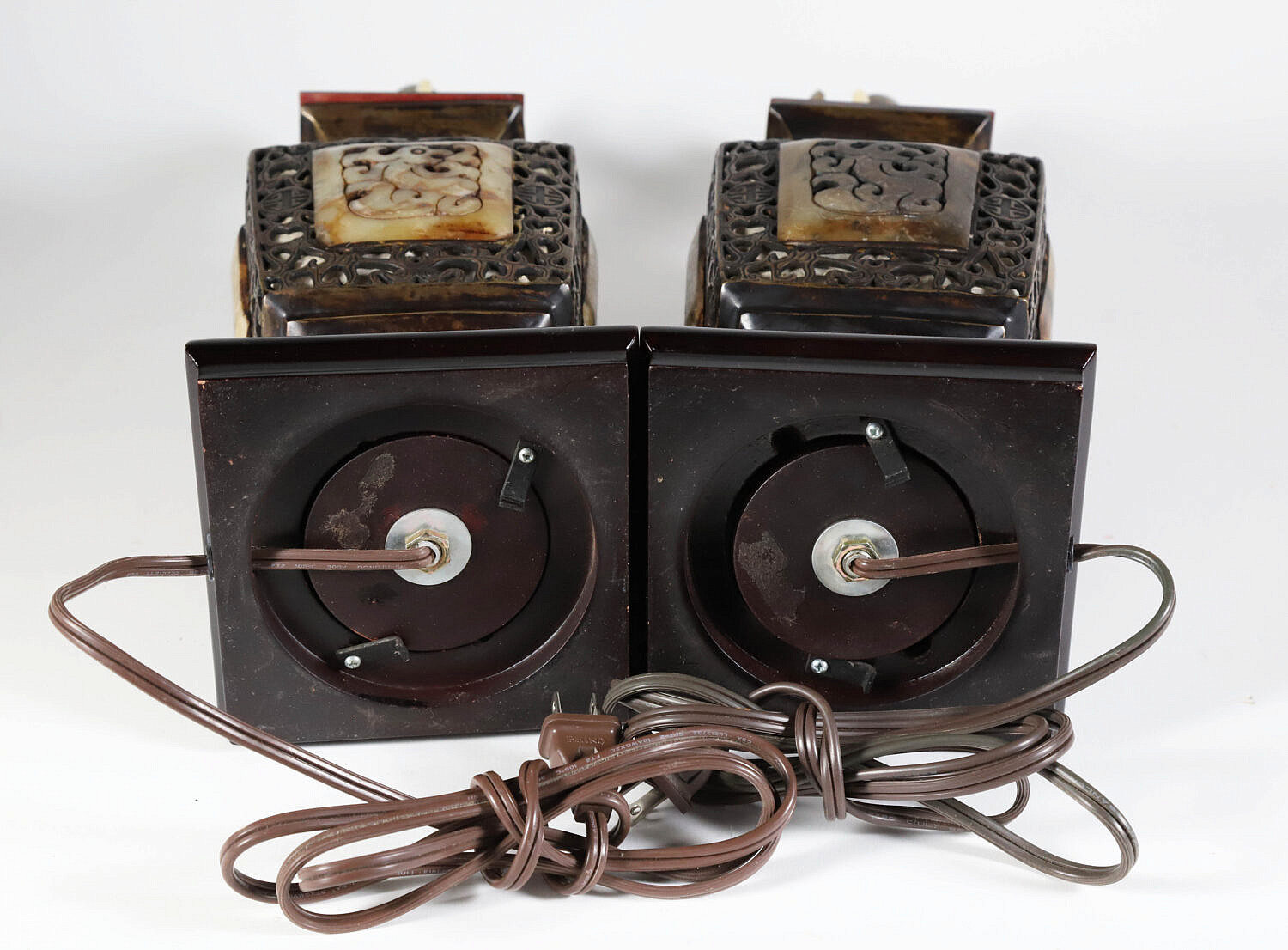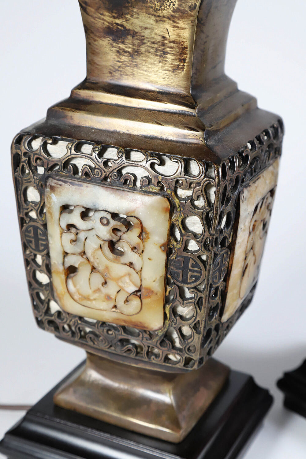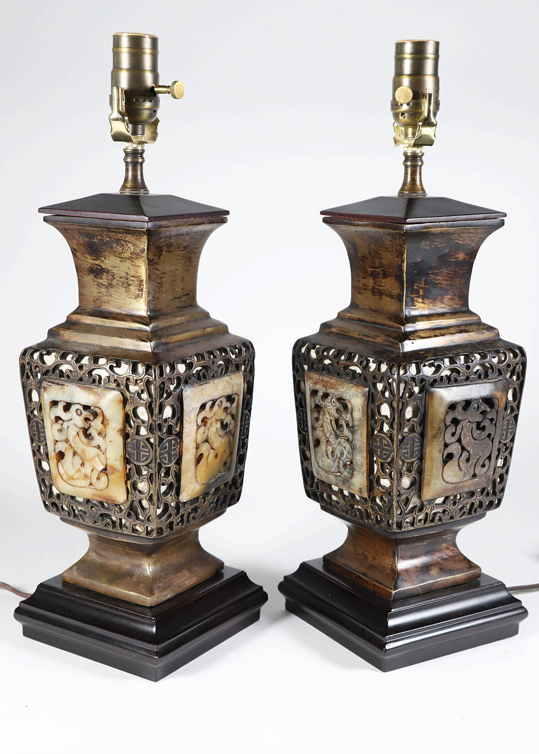 Pair of Chinese Filigree Brass and Carved Stone Lamps