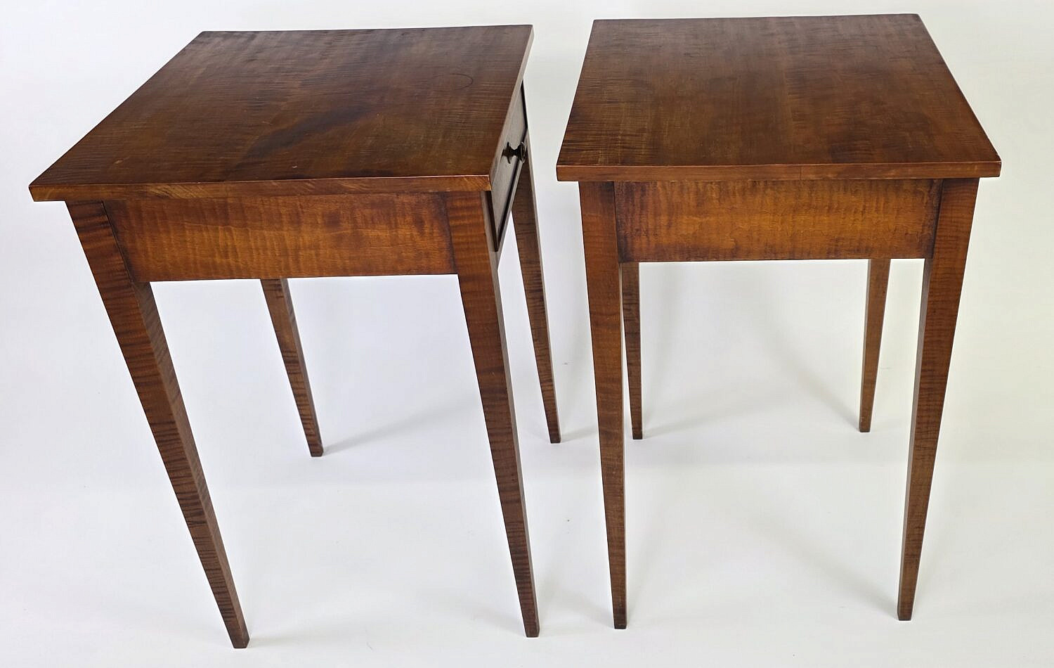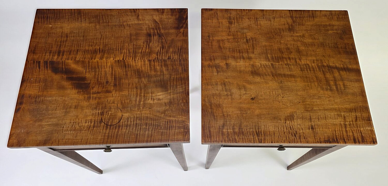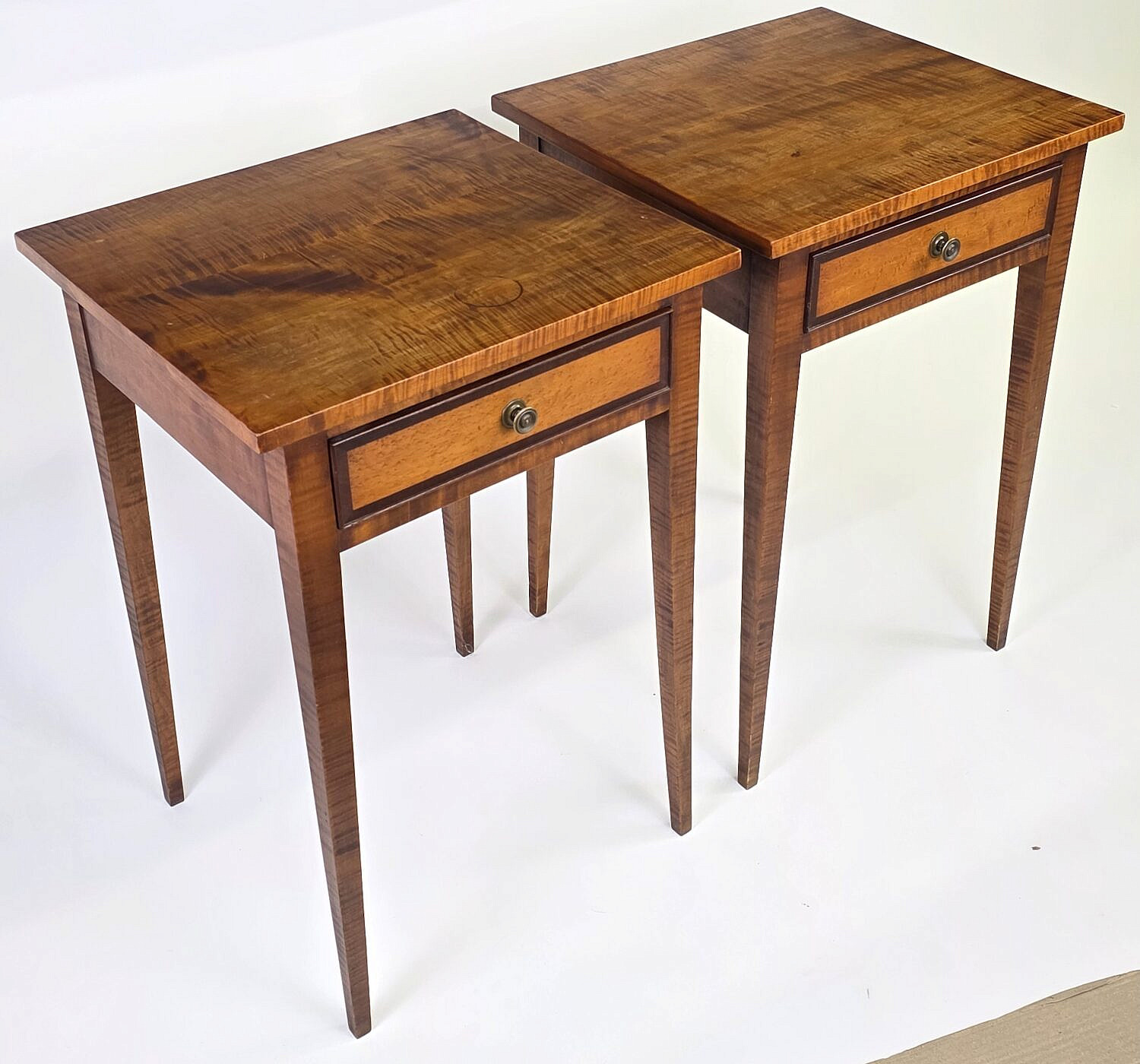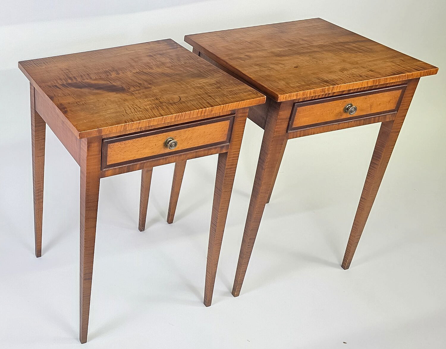 Pair of Eldred Wheeler Tiger Maple One Drawer Night Stands, both with original paper labels, Hepplewhite style and circular brass pulls.