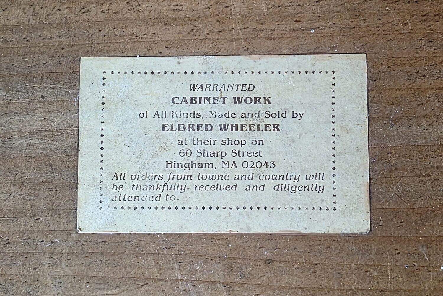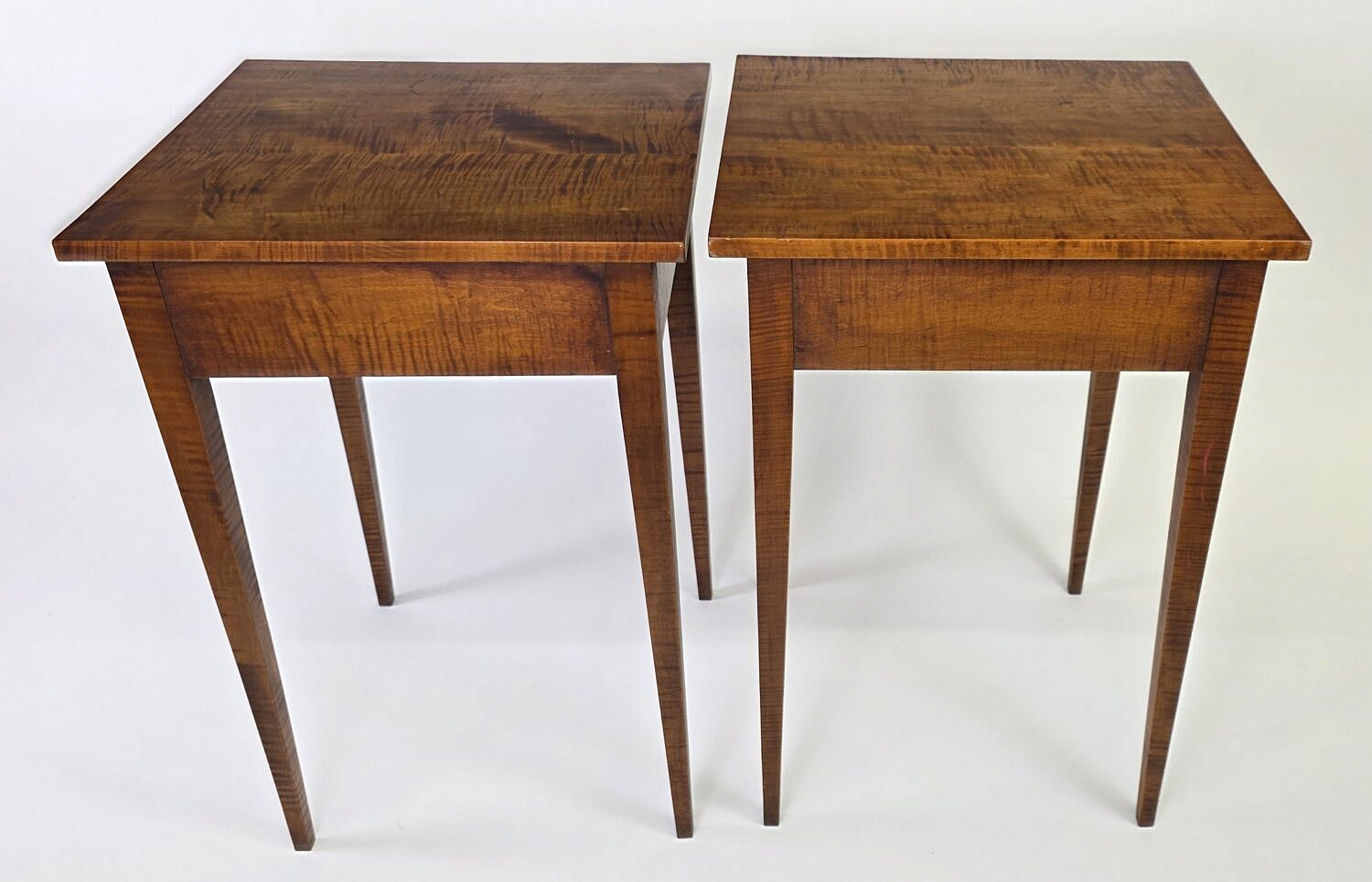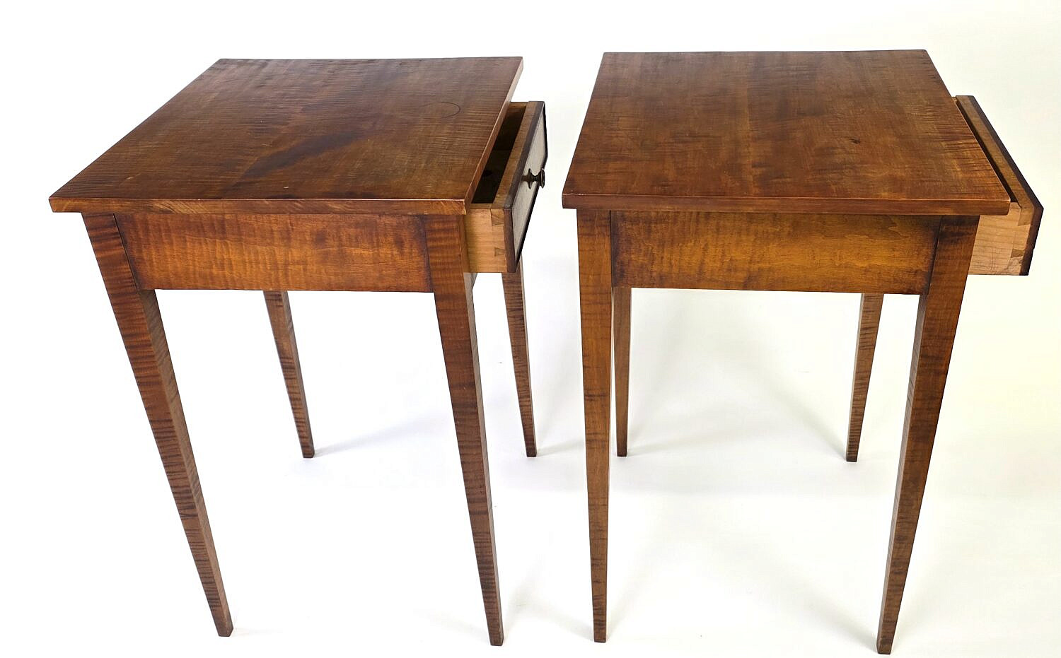 Pair of Eldred Wheeler Tiger Maple One Drawer Night Stands, both with original paper labels, Hepplewhite style and circular brass pulls.