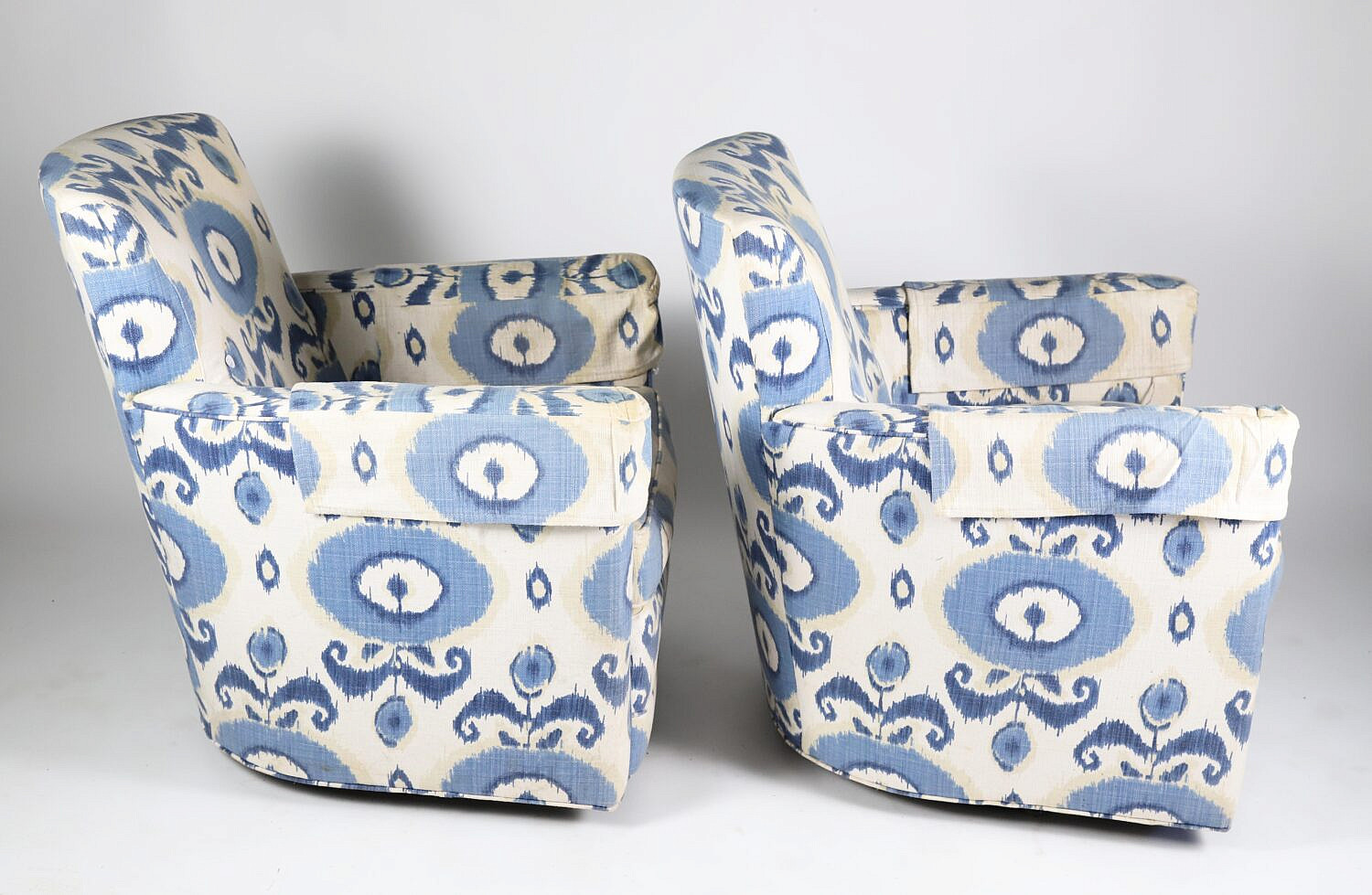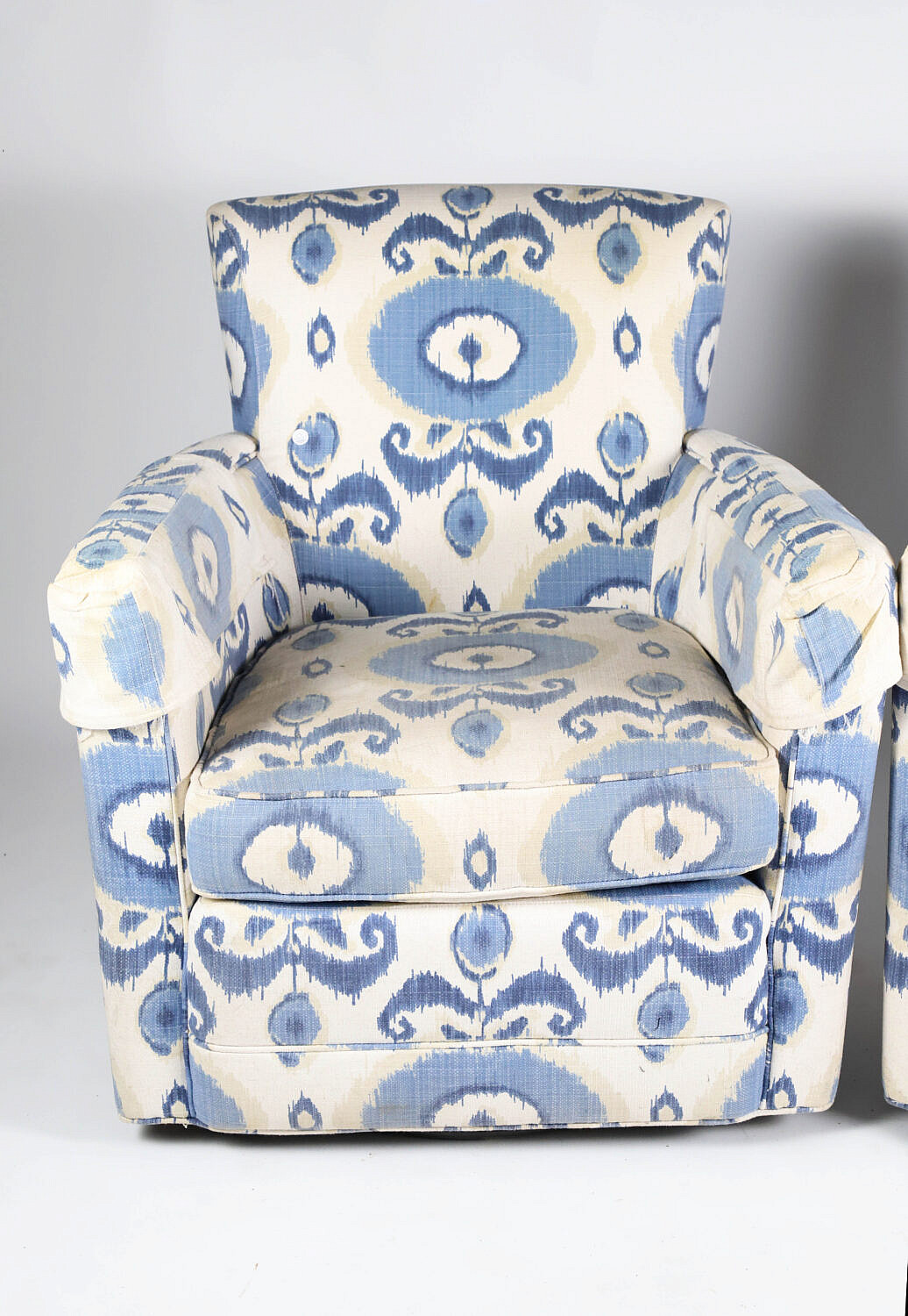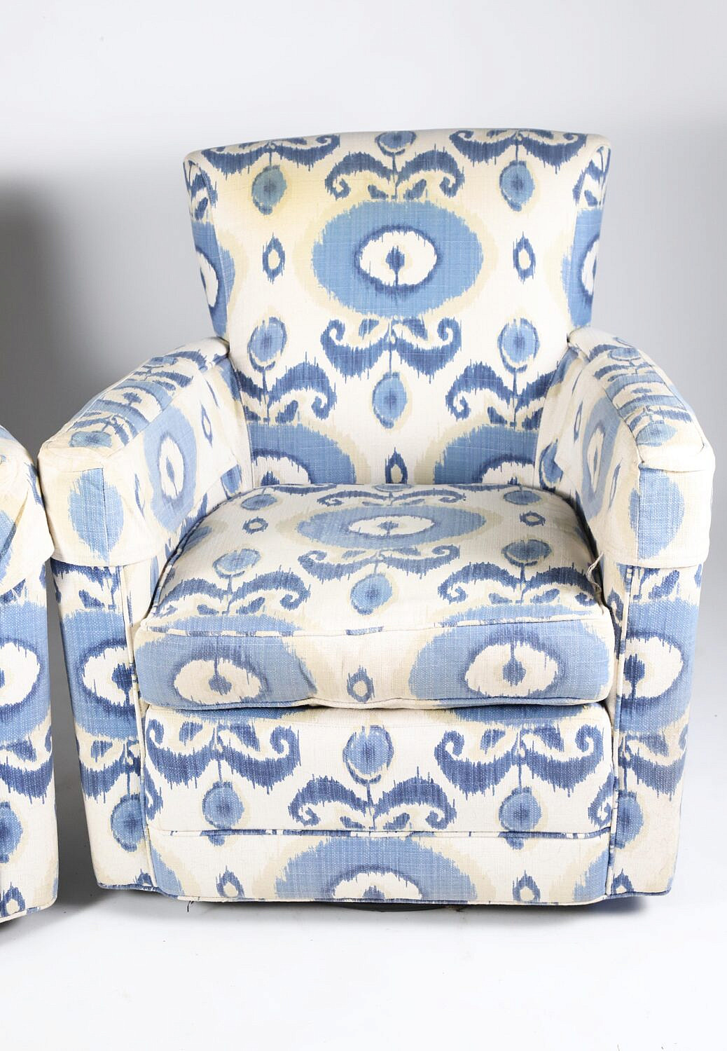 Pair of Lee Craftsmen Blue and White Batik Upholstered Swivel Club Chairs