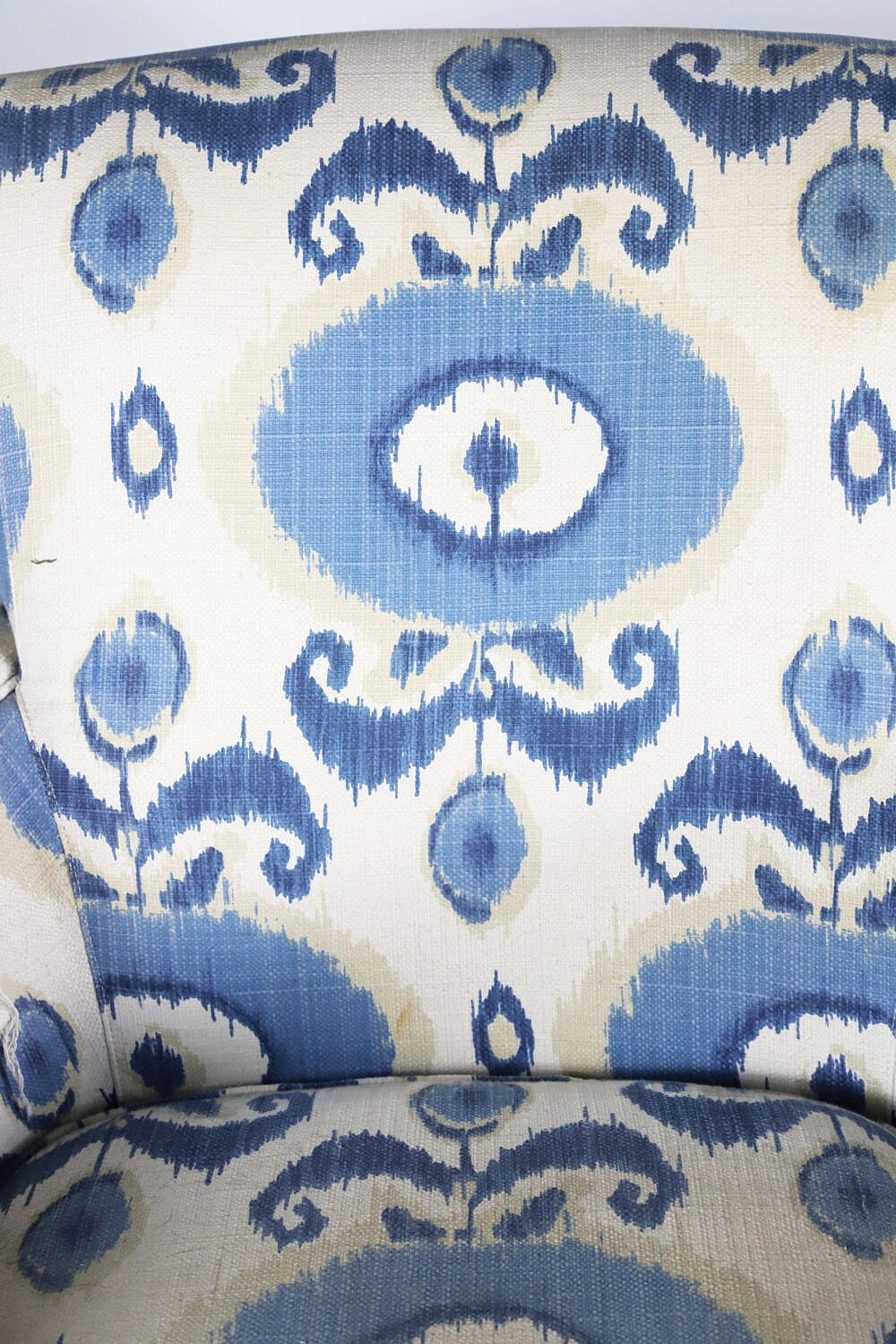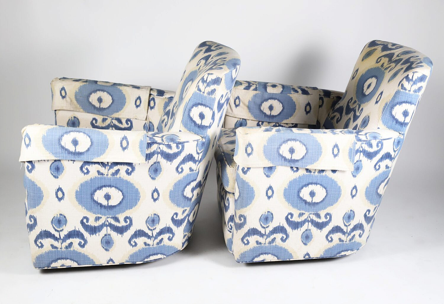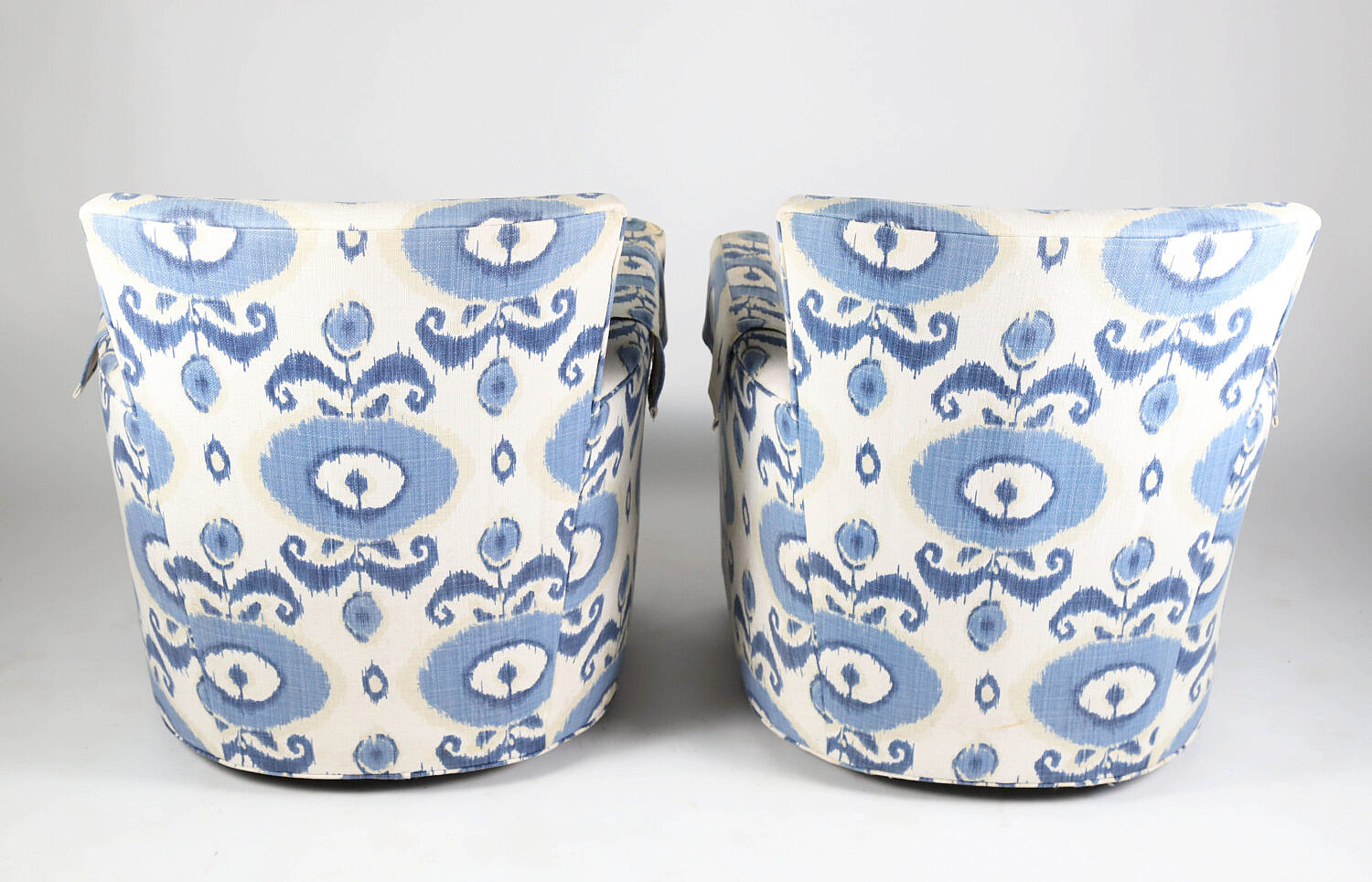 Pair of Lee Craftsmen Blue and White Batik Upholstered Swivel Club Chairs