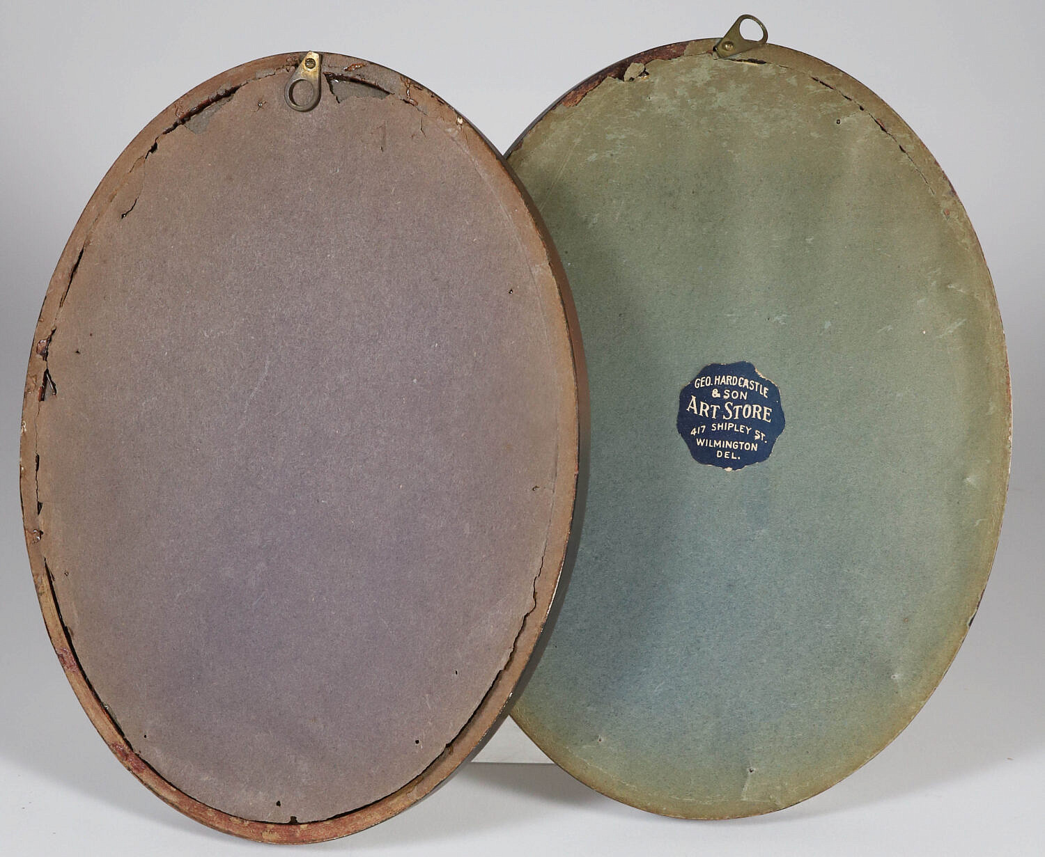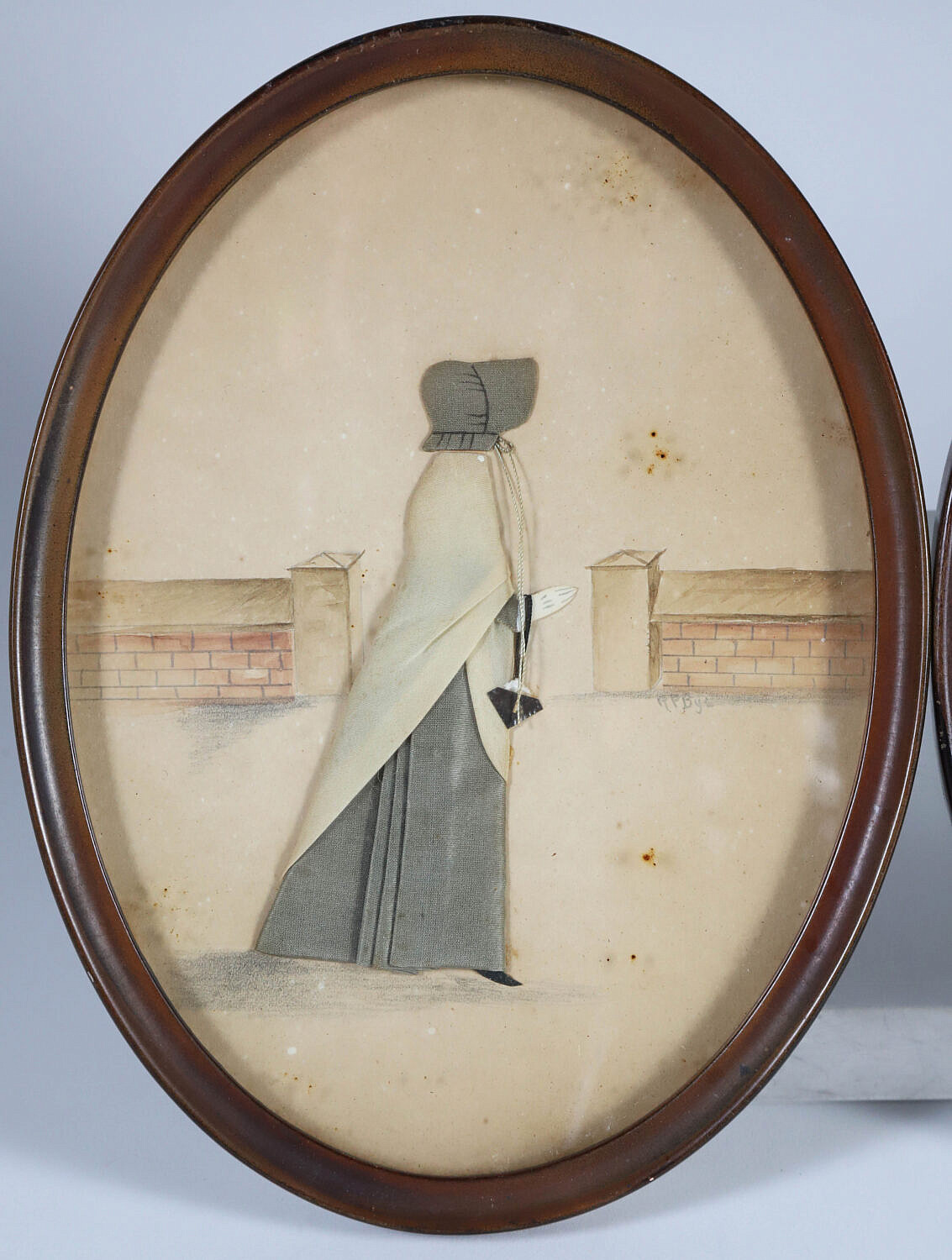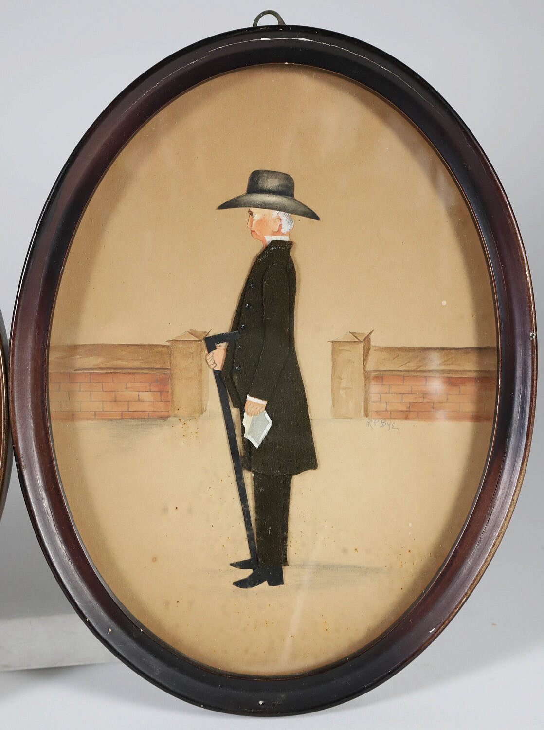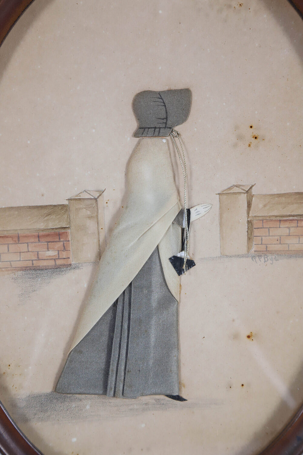 Pair of Quaker Oval Portraits of Man and Woman by R.P. Bye, 20th Century, mixed media watercolor, paper and fabric, signed mid right R.P. Bye