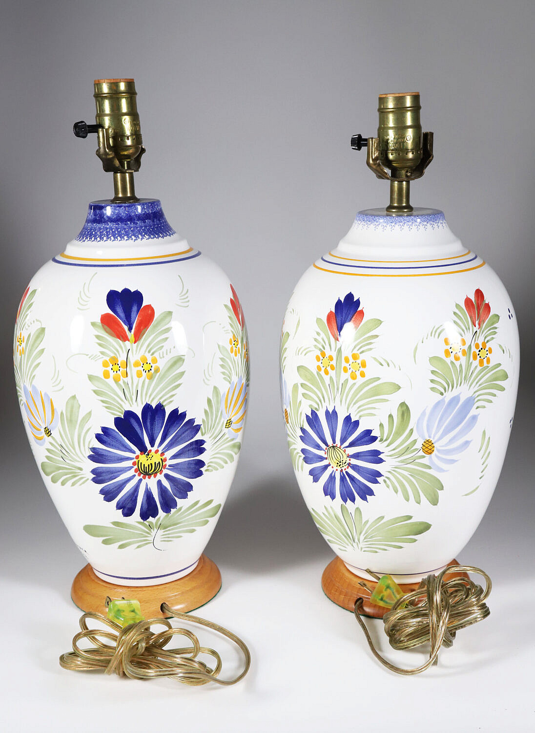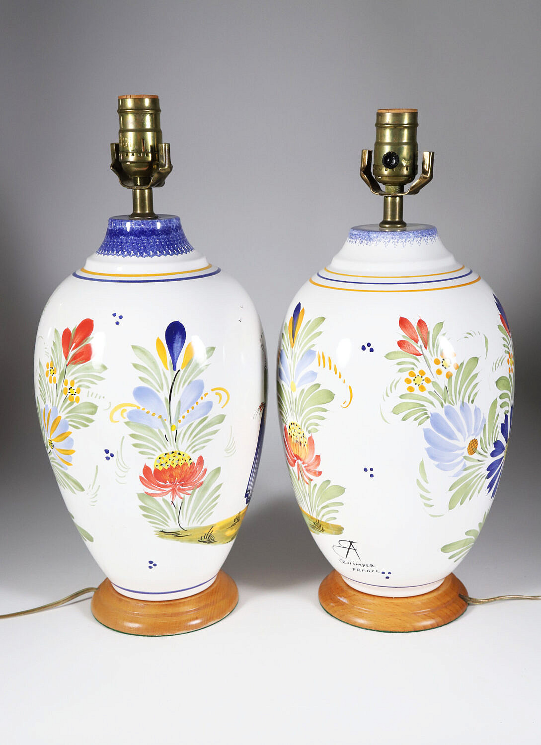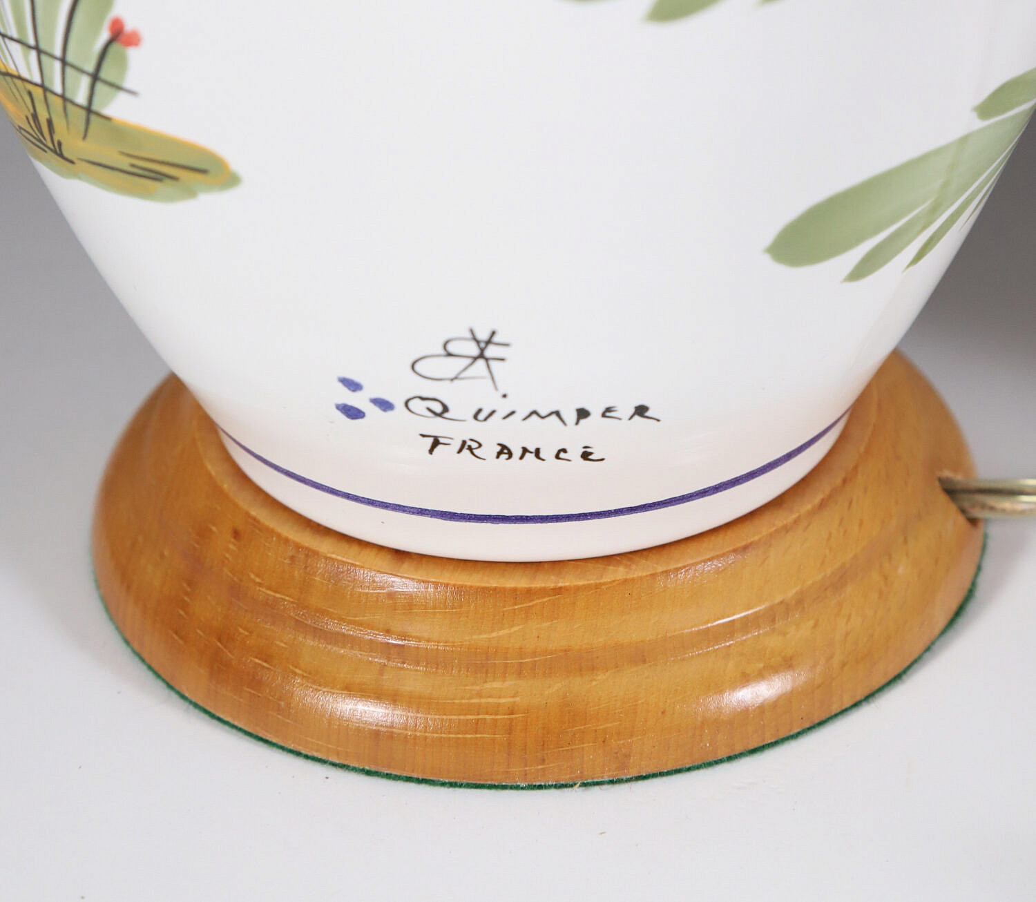 Pair of Quimper Ceramic Decorated Lamps, Signed Quimper France, on turned wood bases