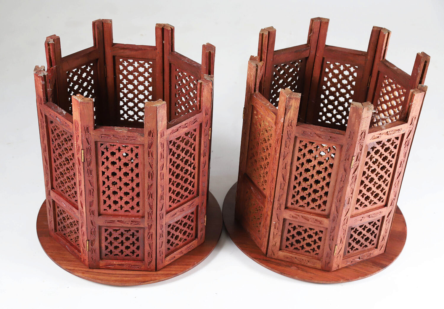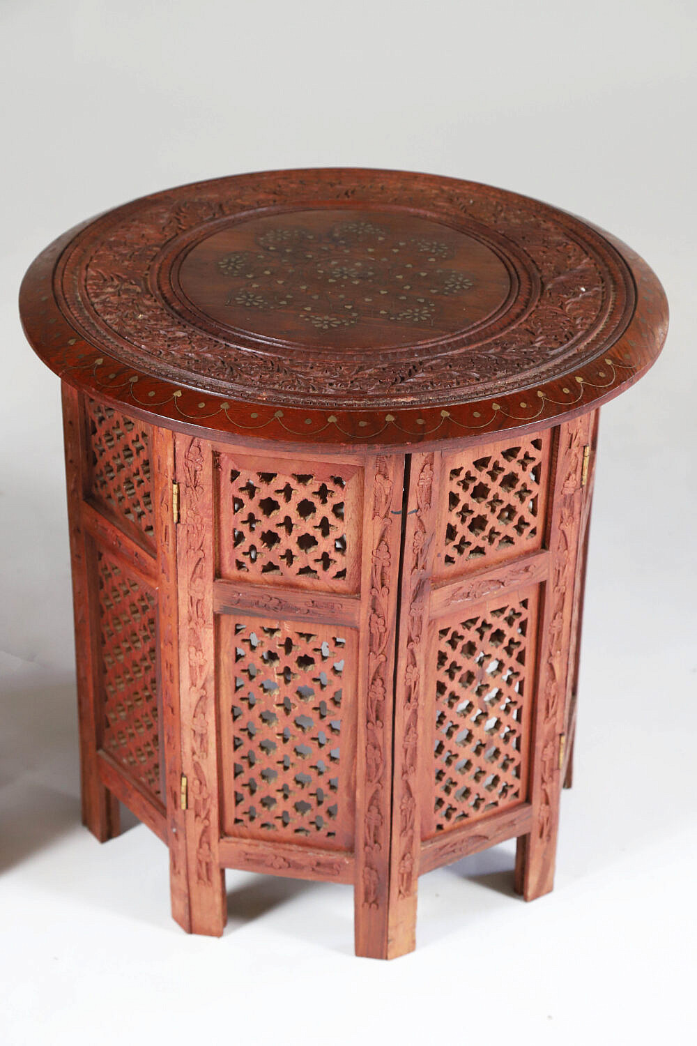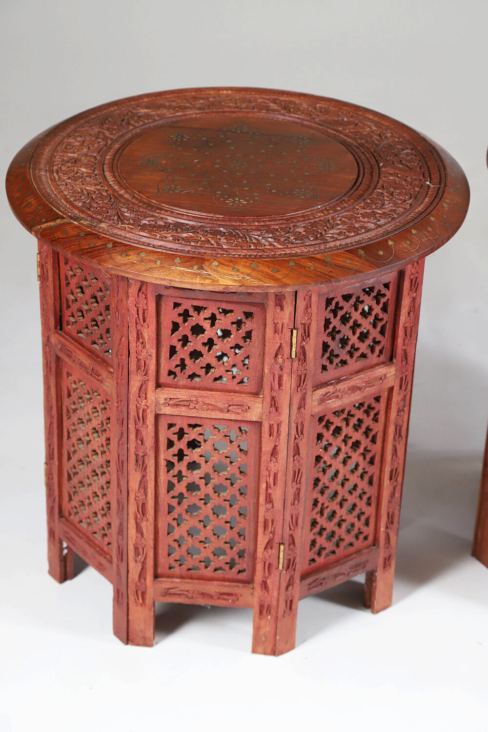 Pair of Teak Wood Brass Inlaid Side Tables, circular tops on pierced octagonal bases