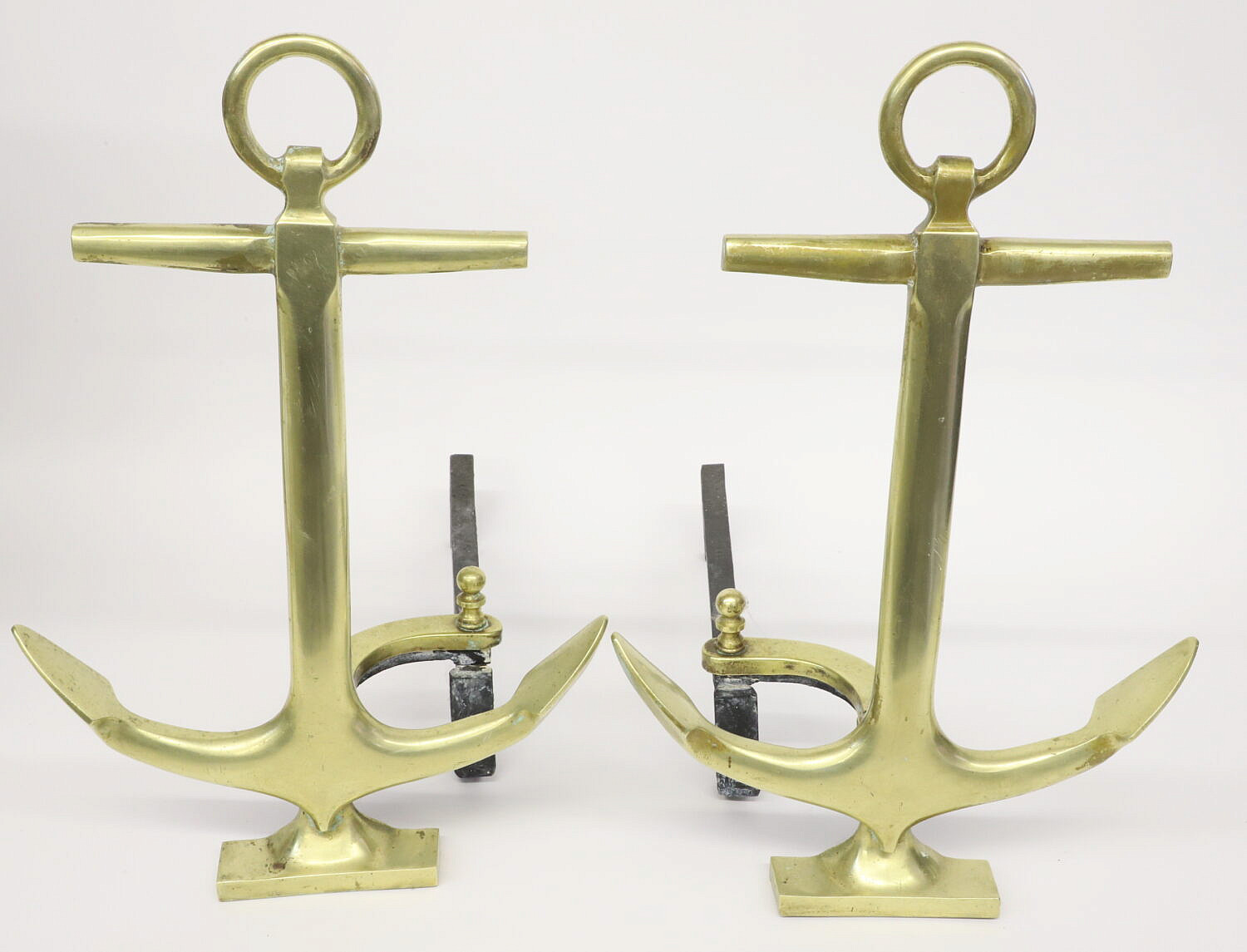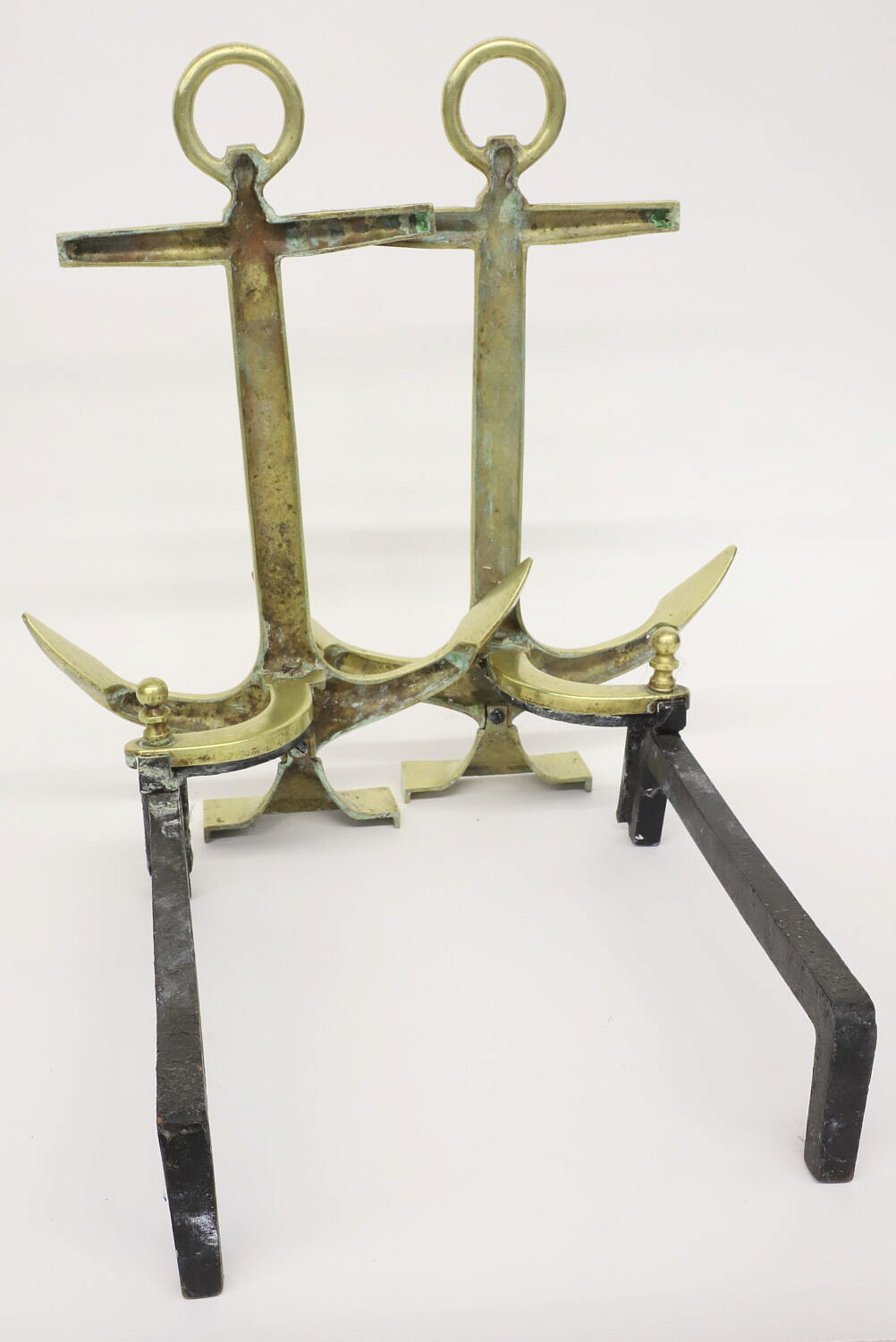 Pair of Vintage Brass Nautical Anchor Andirons, cast brass anchors with cast iron log dogs.