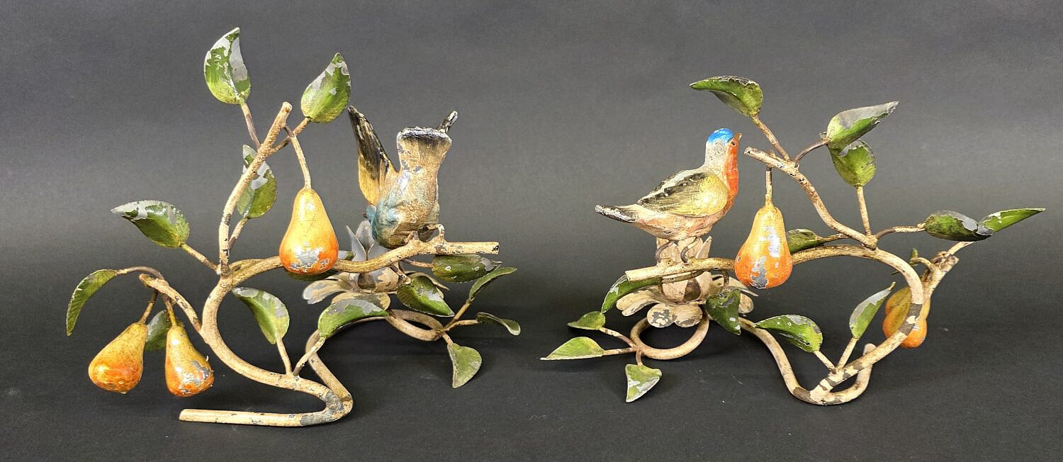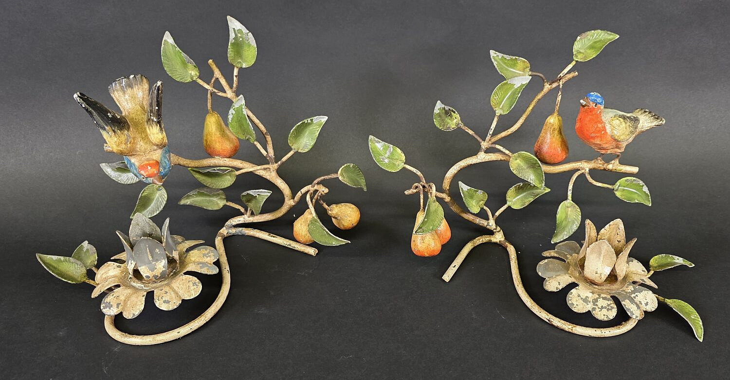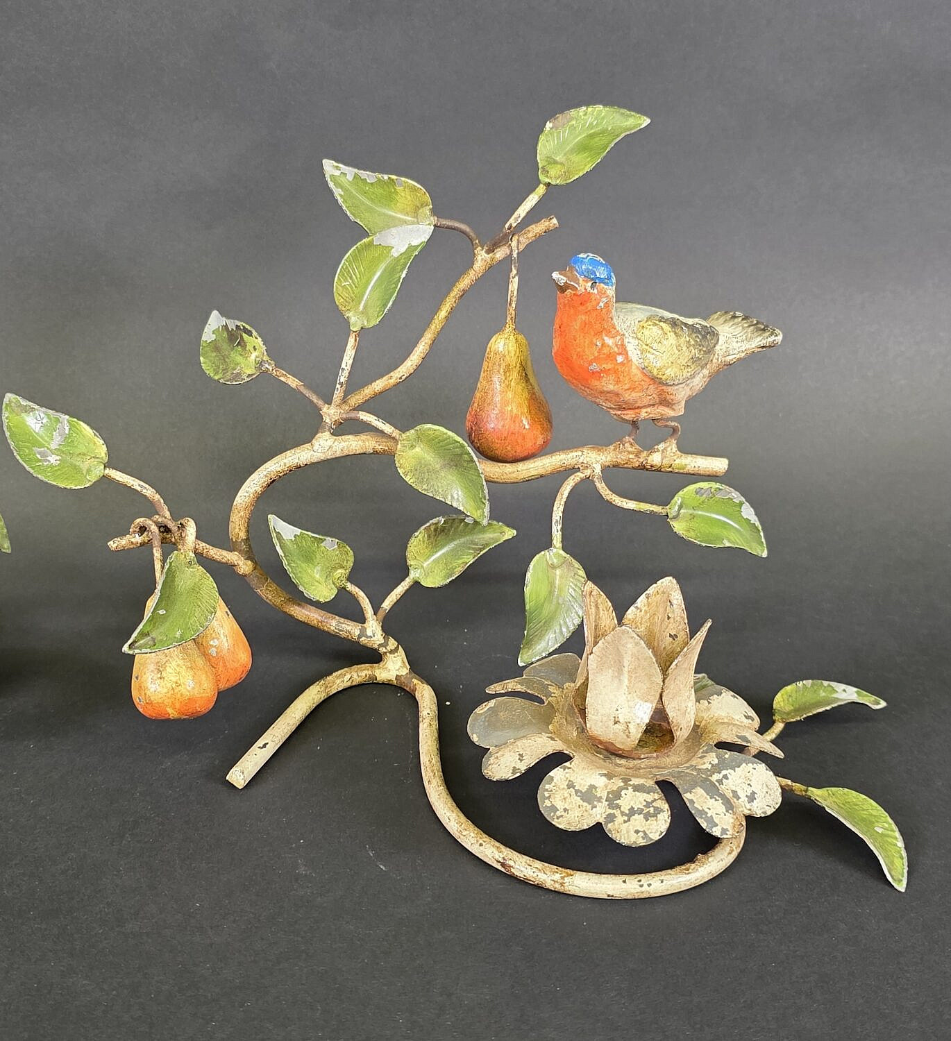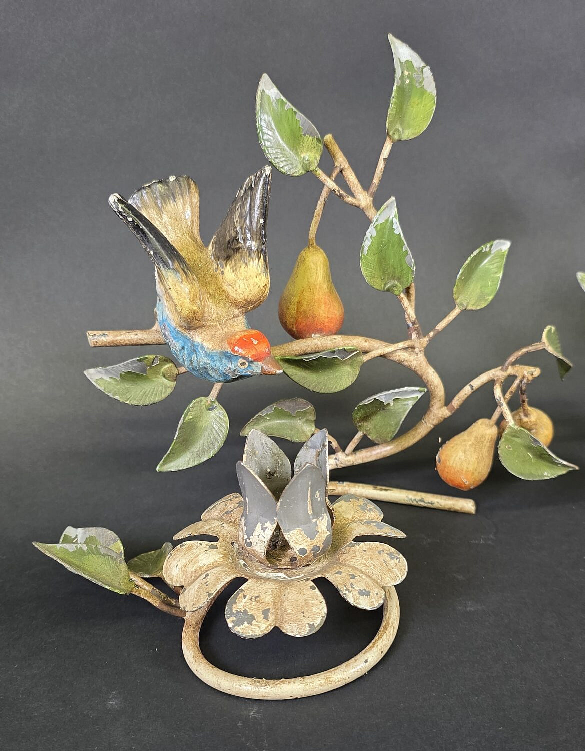 Pair of Vintage Painted Metal Bird and Foliate Candlesticks, 20th century