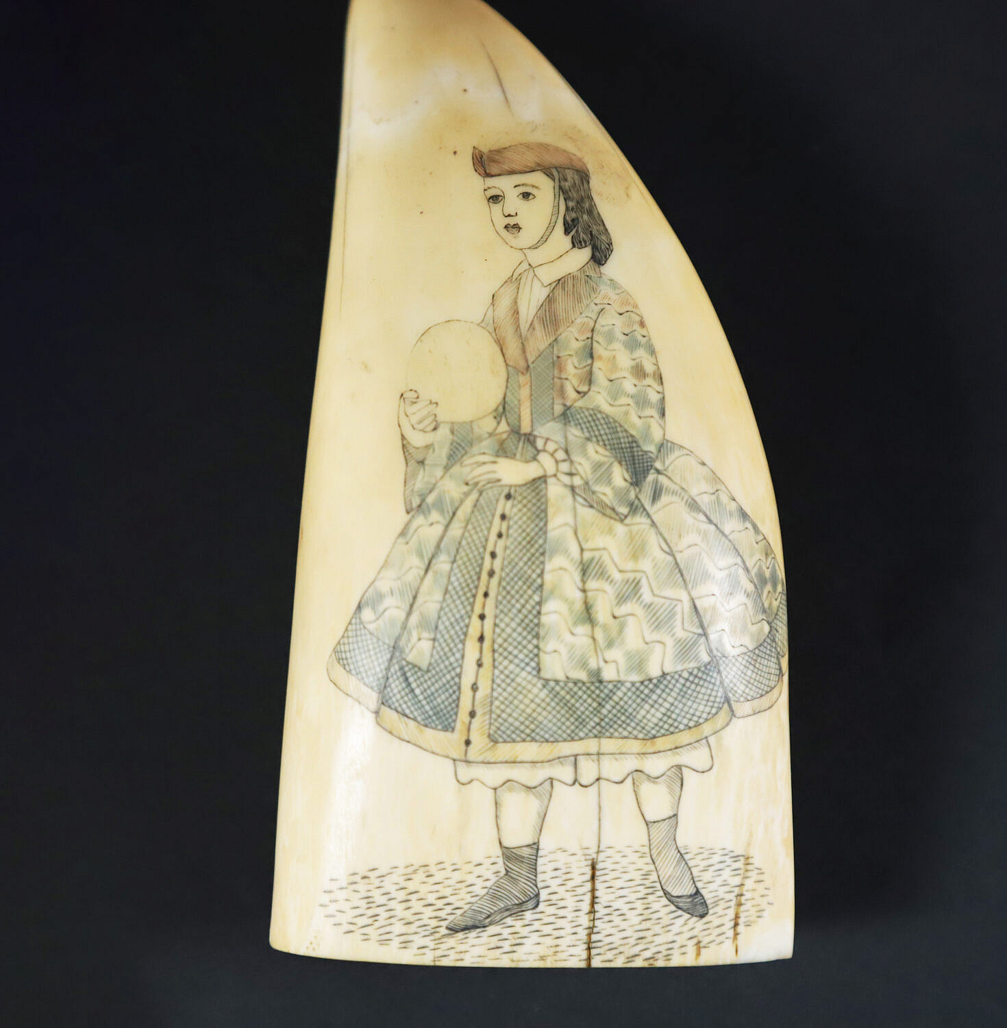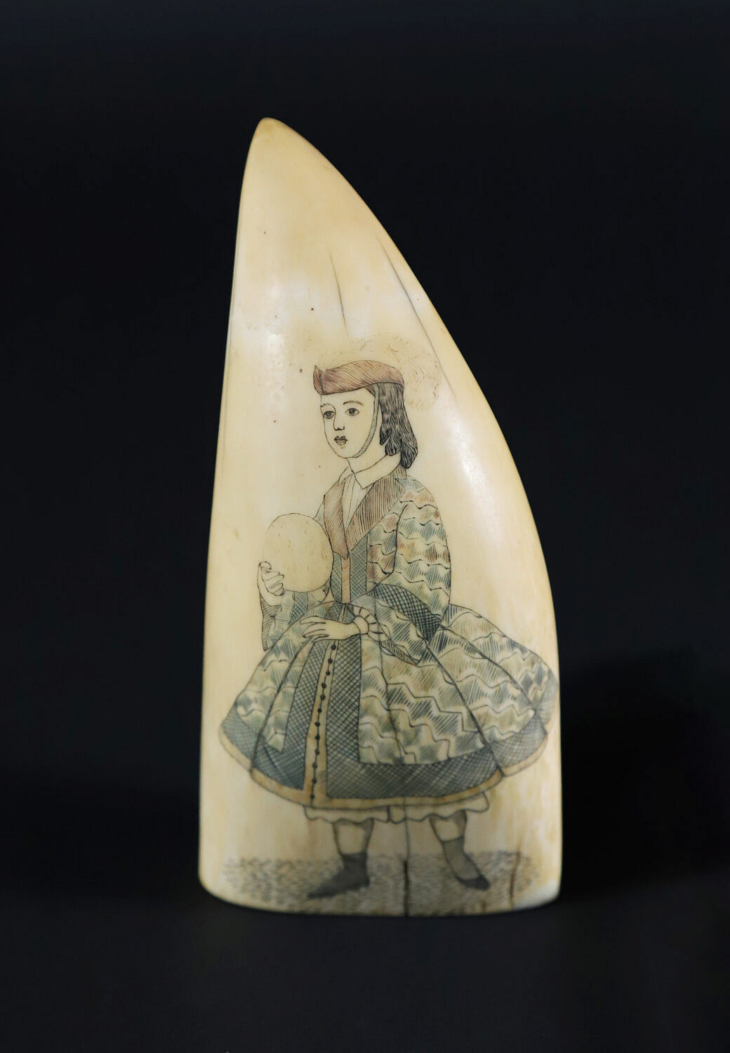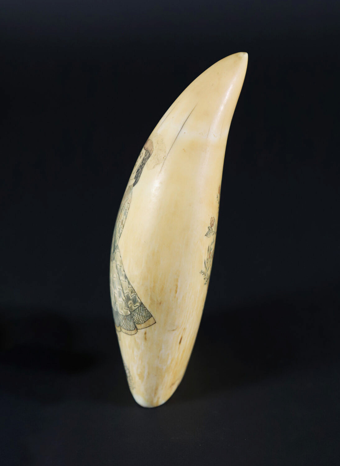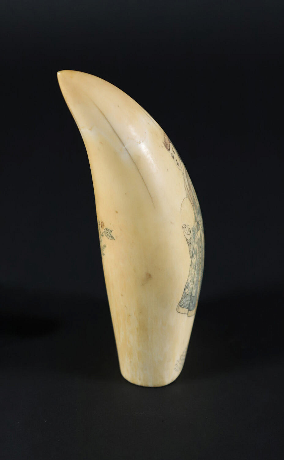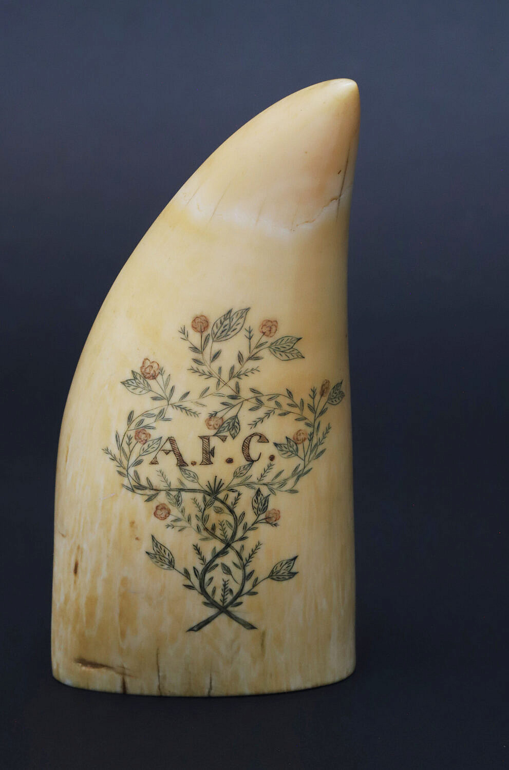 Polychrome Scrimshaw Whale Tooth, 19th Century, with a fine portrait of a young lady, the verso engraved with floral vine and initials “A.F.C”