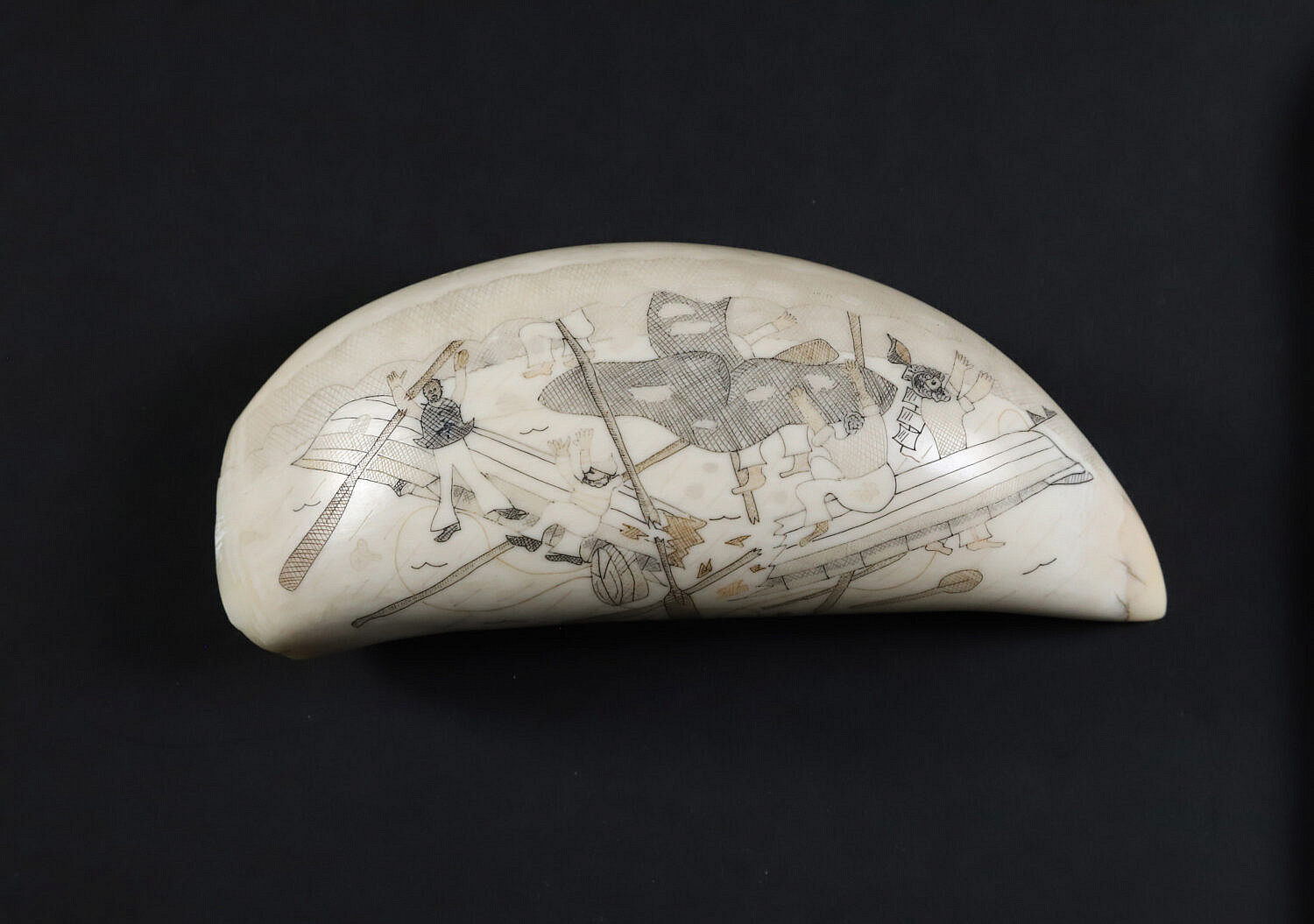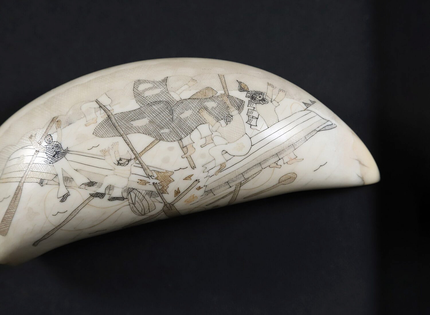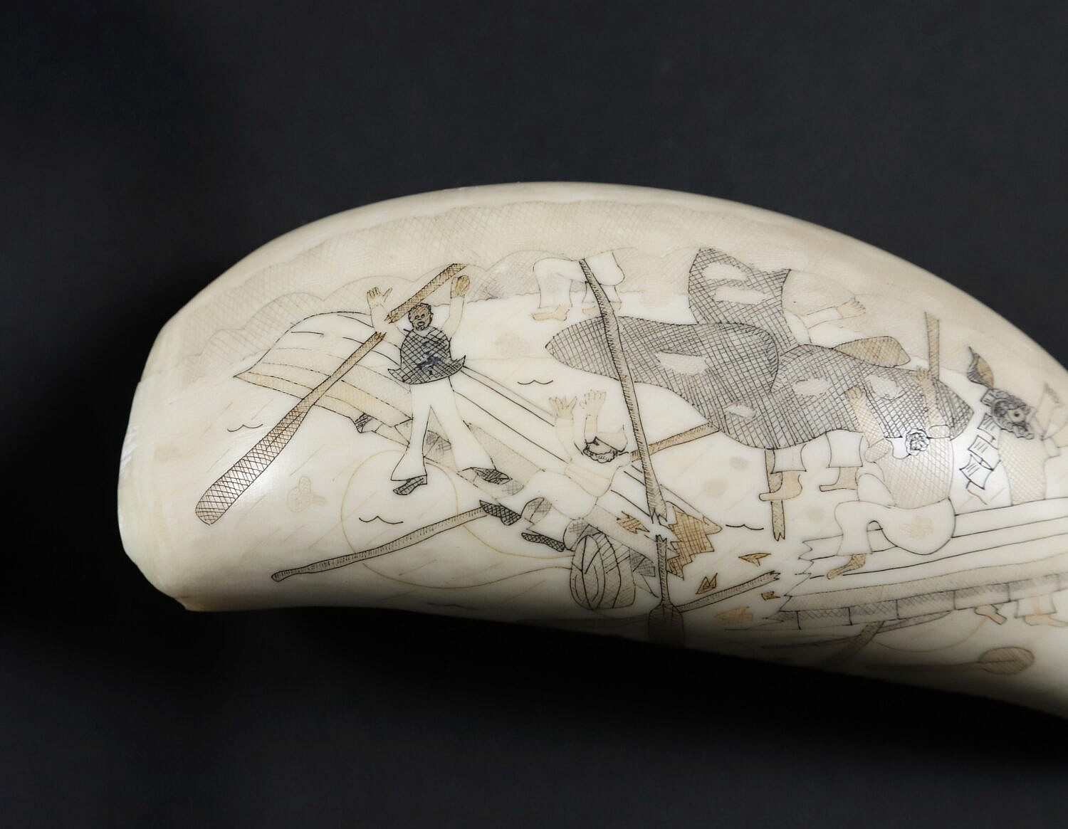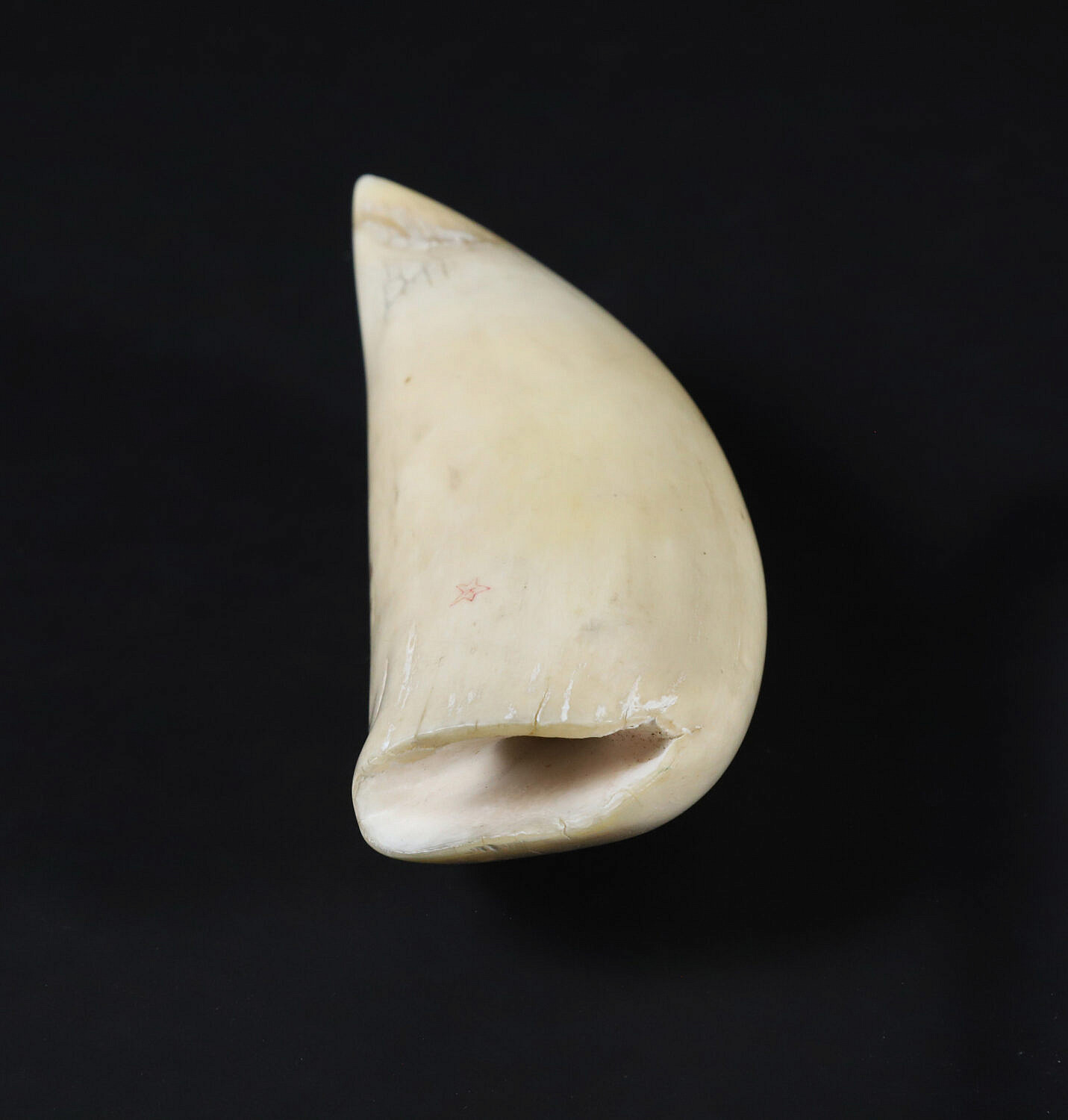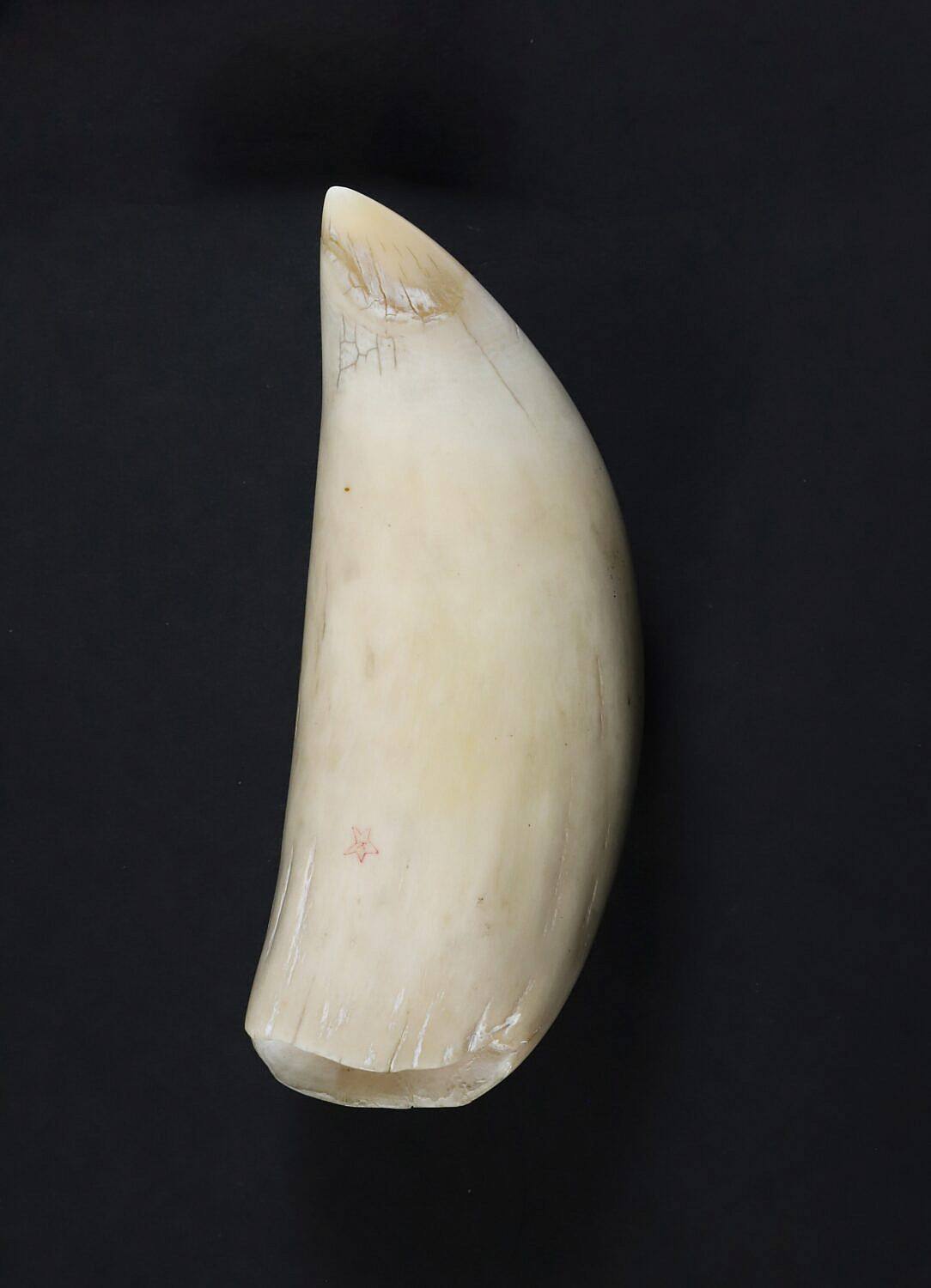 Polychrome Scrimshaw Whale Tooth “Stove Boat Aribus”, the reverse with a red letter “k” within a star. As per Federal regulations this may only be purchased by a Massachusetts resident and is not available for export