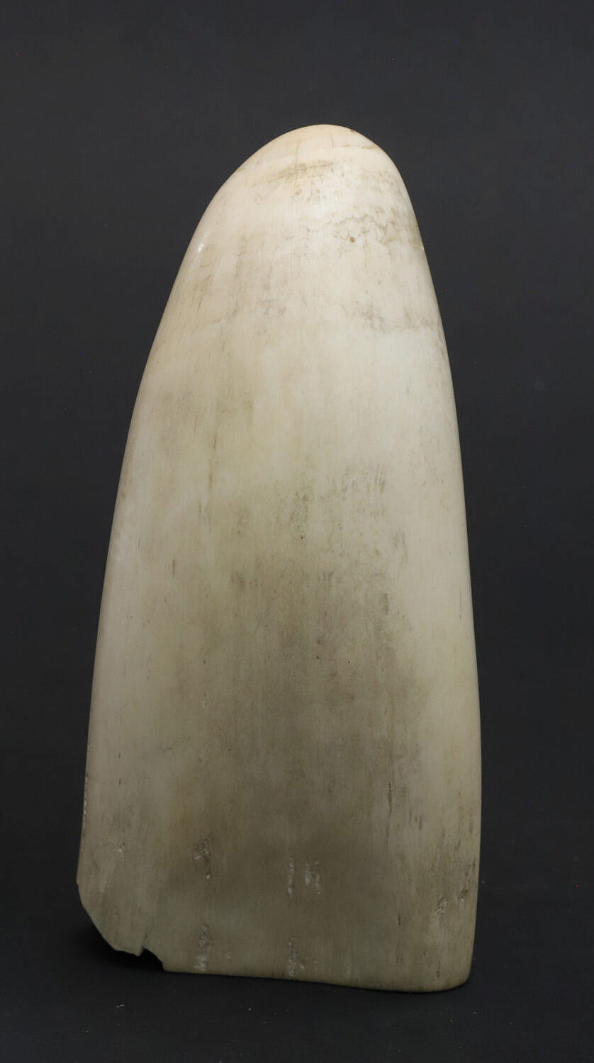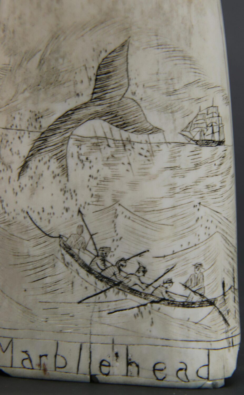 Scrimshaw Antique Whale’s Tooth “Marblehead”, 19th Century, engraved with a polychromed star above a longboat on a diviing whale and Mother ship on the horizon, the ship’s name Marblehead engraved at the base of the tooth