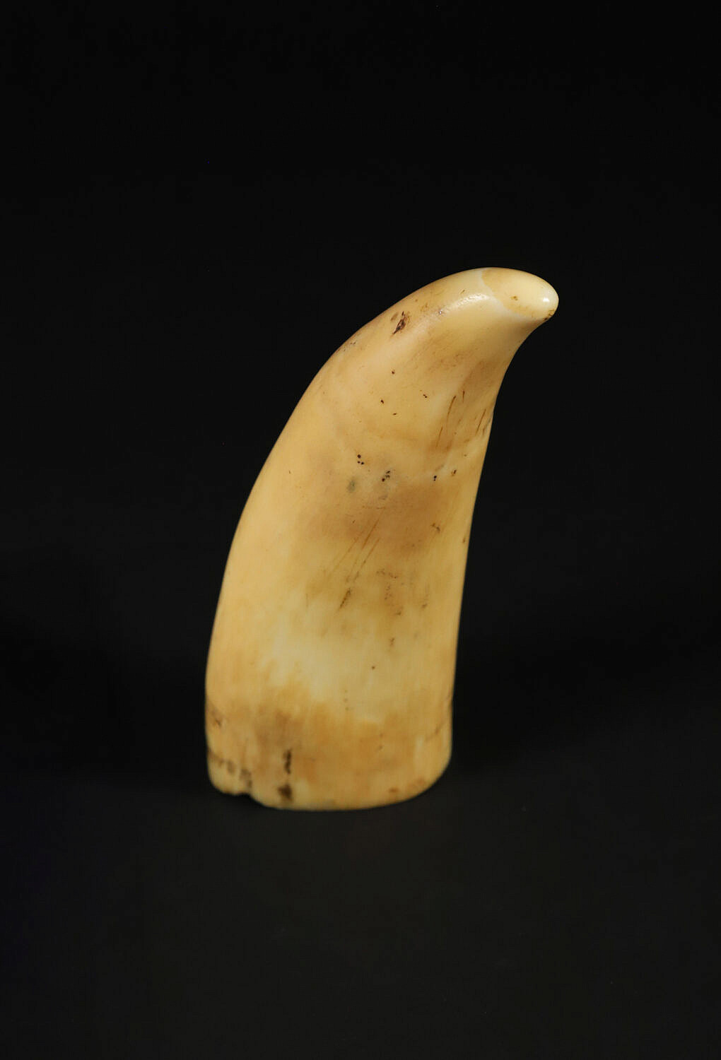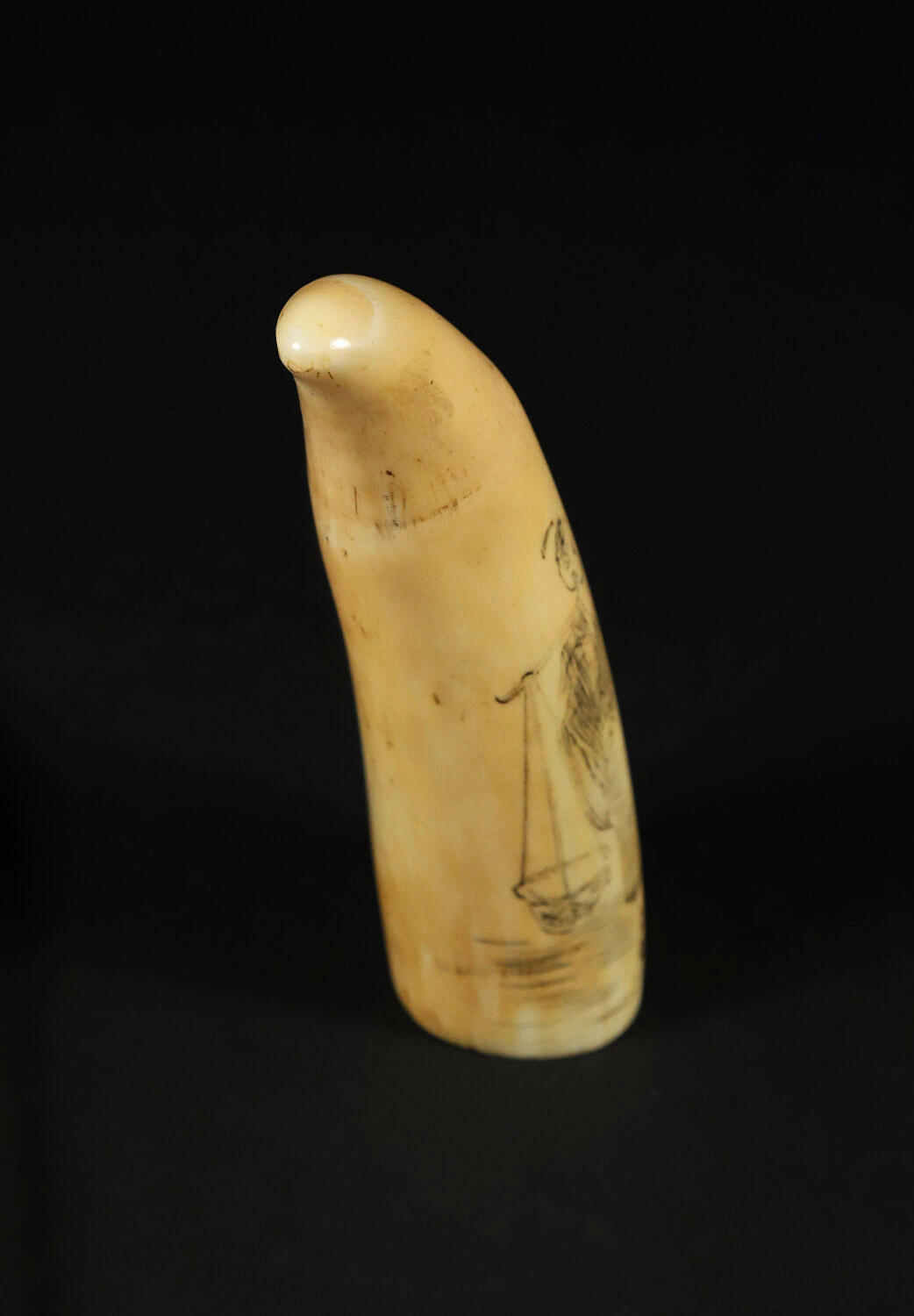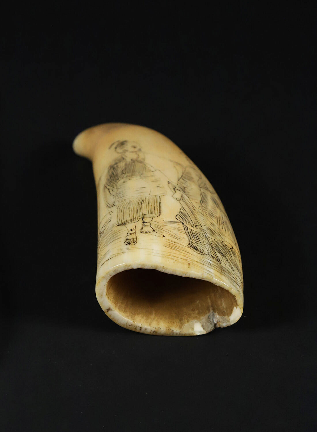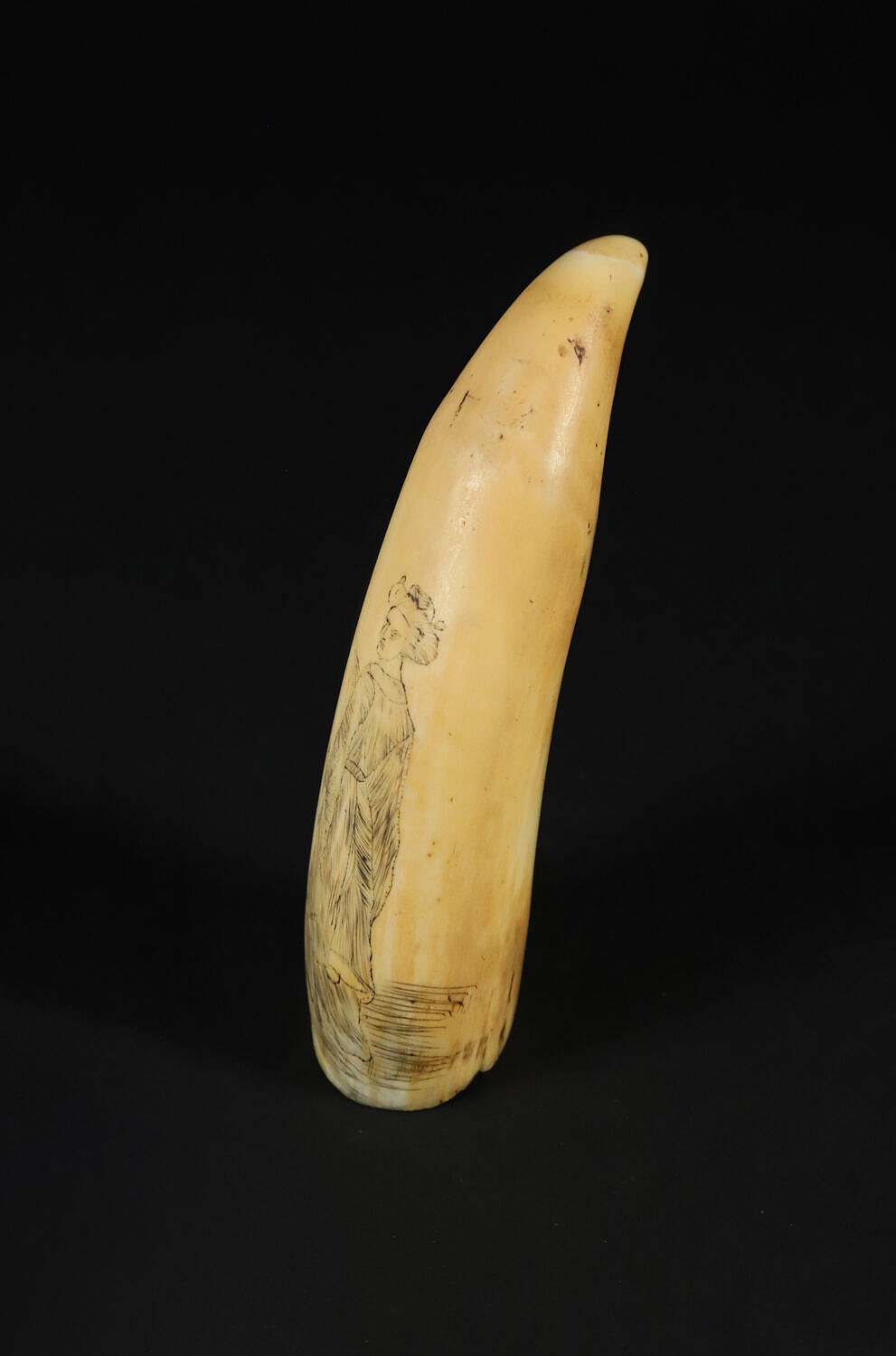 Scrimshaw Whale’s Tooth “Asian Water Man”, 19th Century, engraved with a figure carrying two water buckets, meats, another gent holding a closed umbrella
