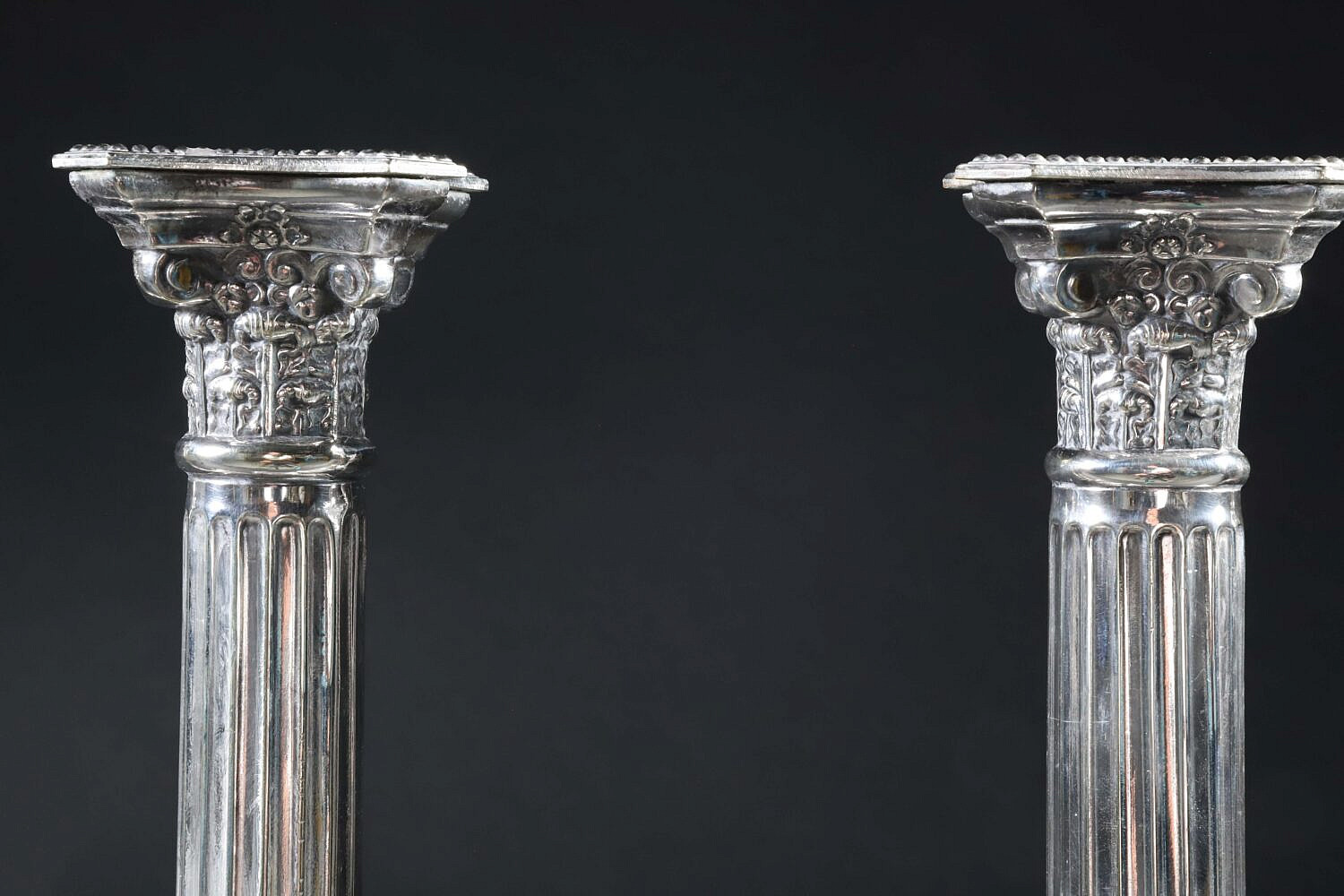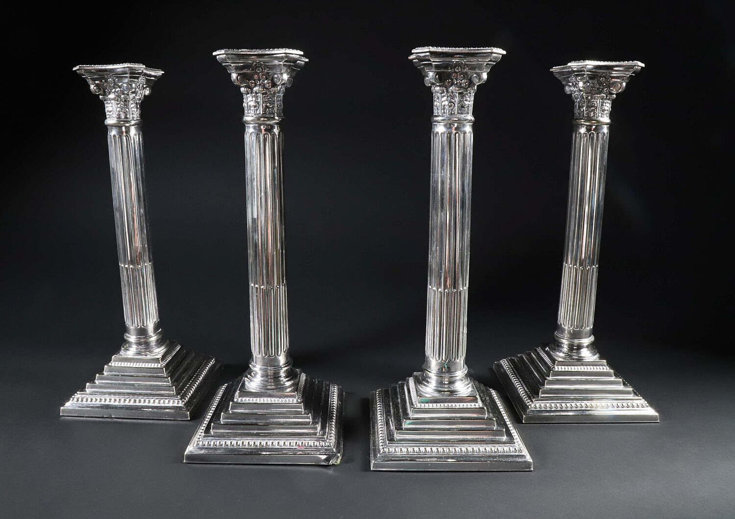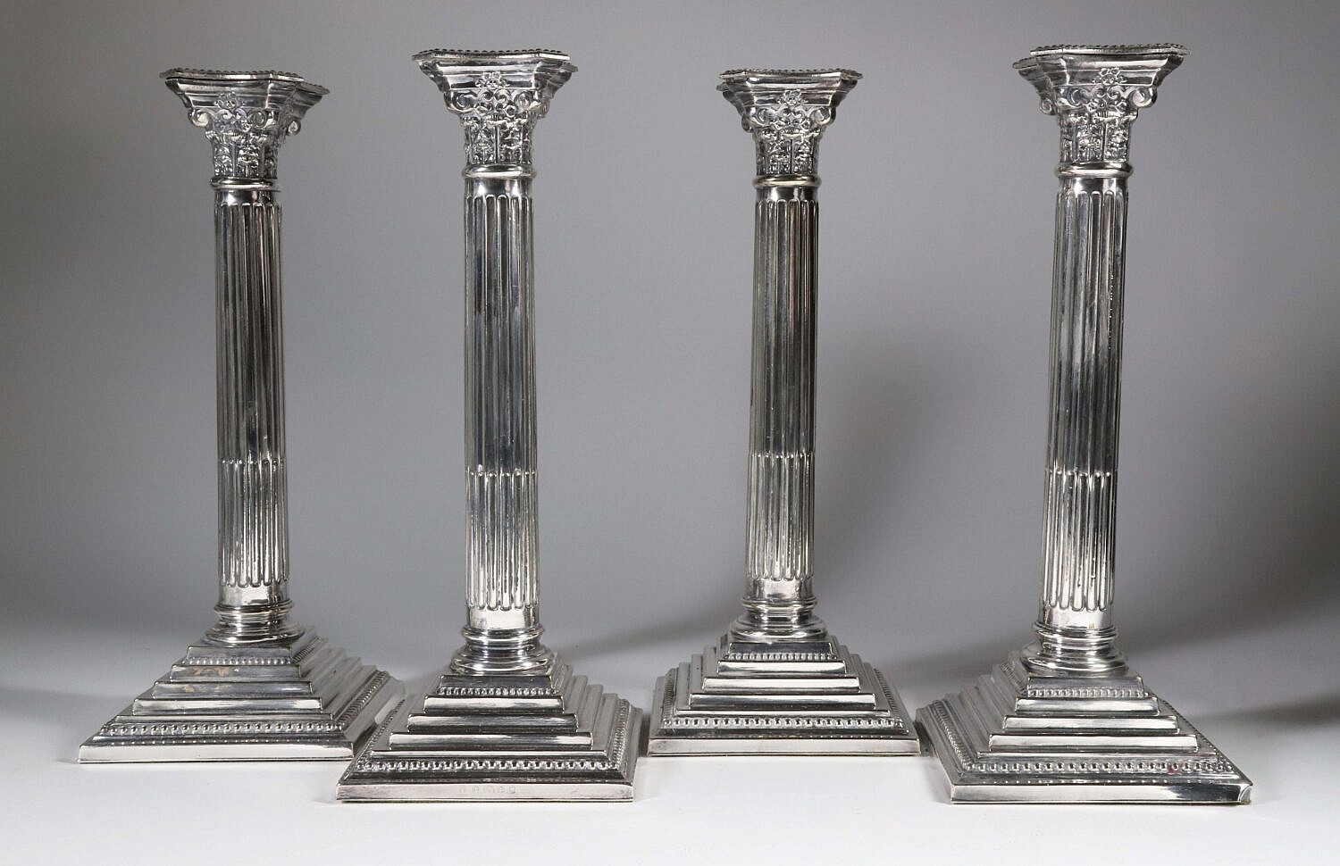 Set of Four Antique Sheffield Classical Corinthian Column Candlesticks