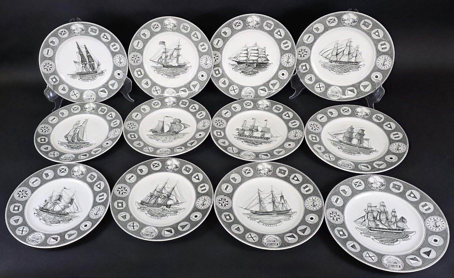 Set of Ten Vintage Wedgwood Sailing Ship Decorated Dinner Plates, each with impressed makers mark, signal flag border, Made in England Of Etruria & Barlaston, representing ships: Margaret, Grand Turk, Cruger, Highlander, Cleopatras Barge, Baltick, Sooloo, Ulysses, Monk, America, Essex, and Olinda.