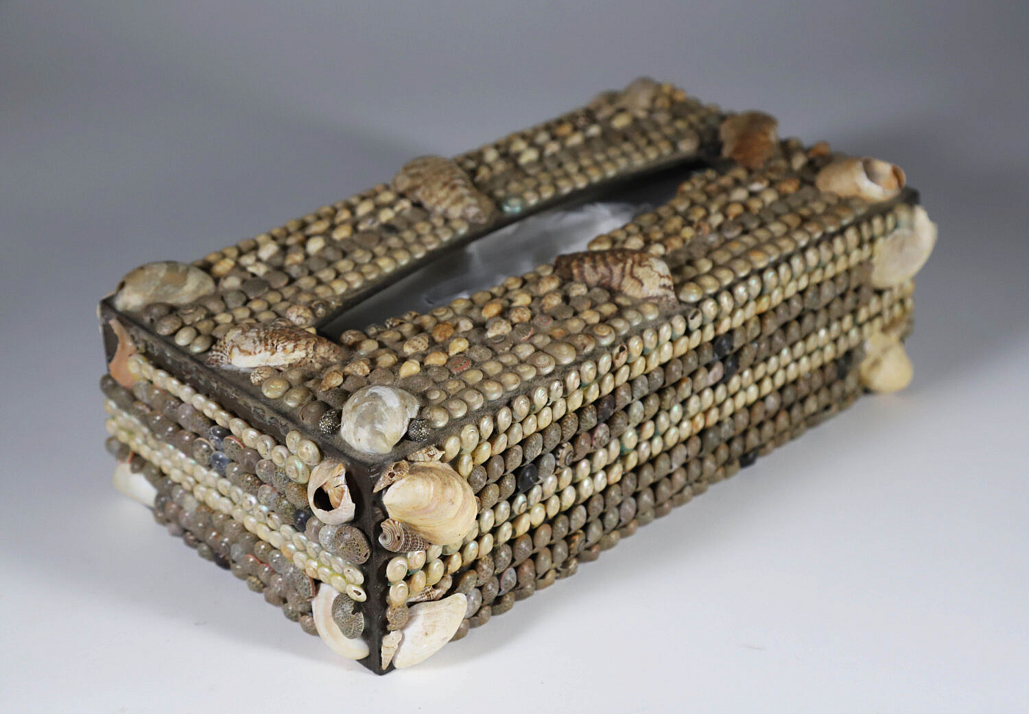 Shell Encrusted Tissue Box with Slide Cover on Base Consign Now DeptDecorative ArtsSize4 in. x 10 in. x 6 in. Contemporary Shell Encrusted Tissue Box with Slide Cover on Base 4 in. x 10 in. x 6 in. Please note that this auction has ended. Click here for an overview of this auction.