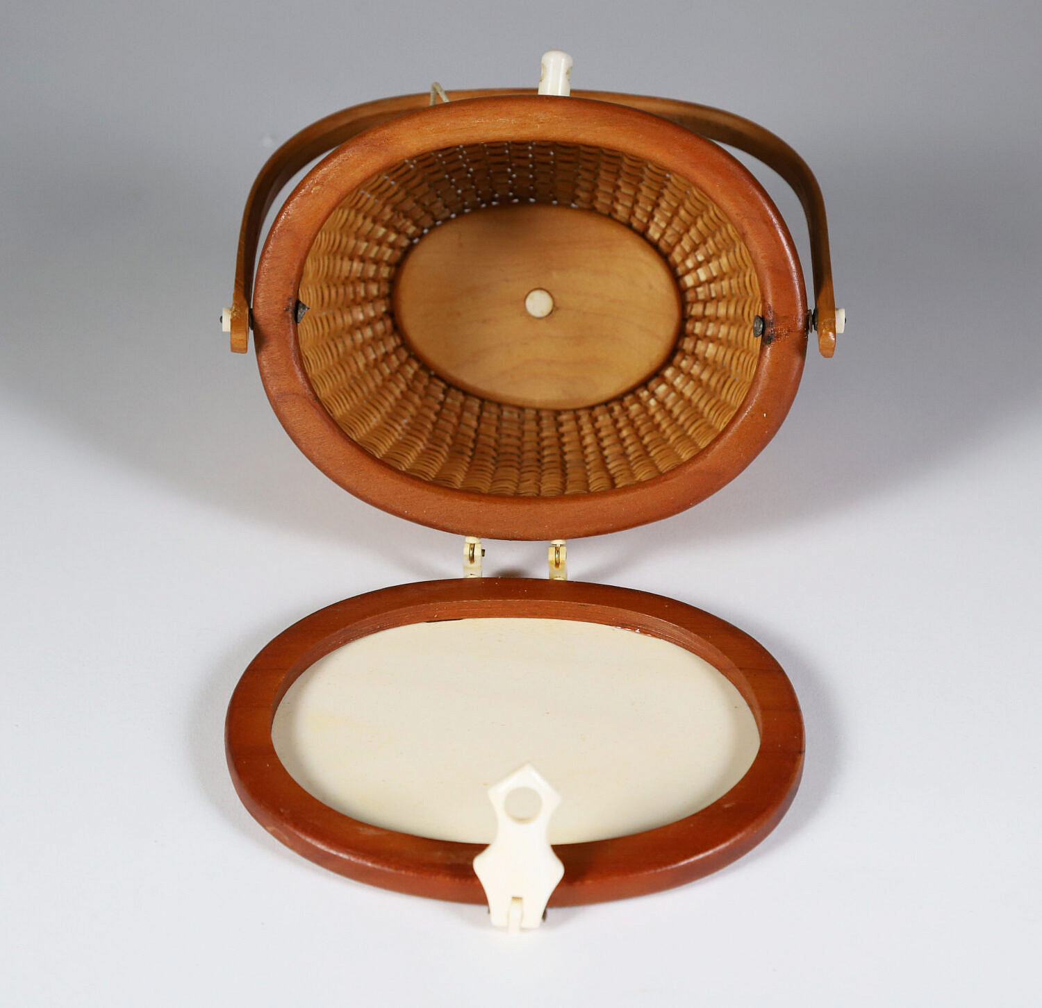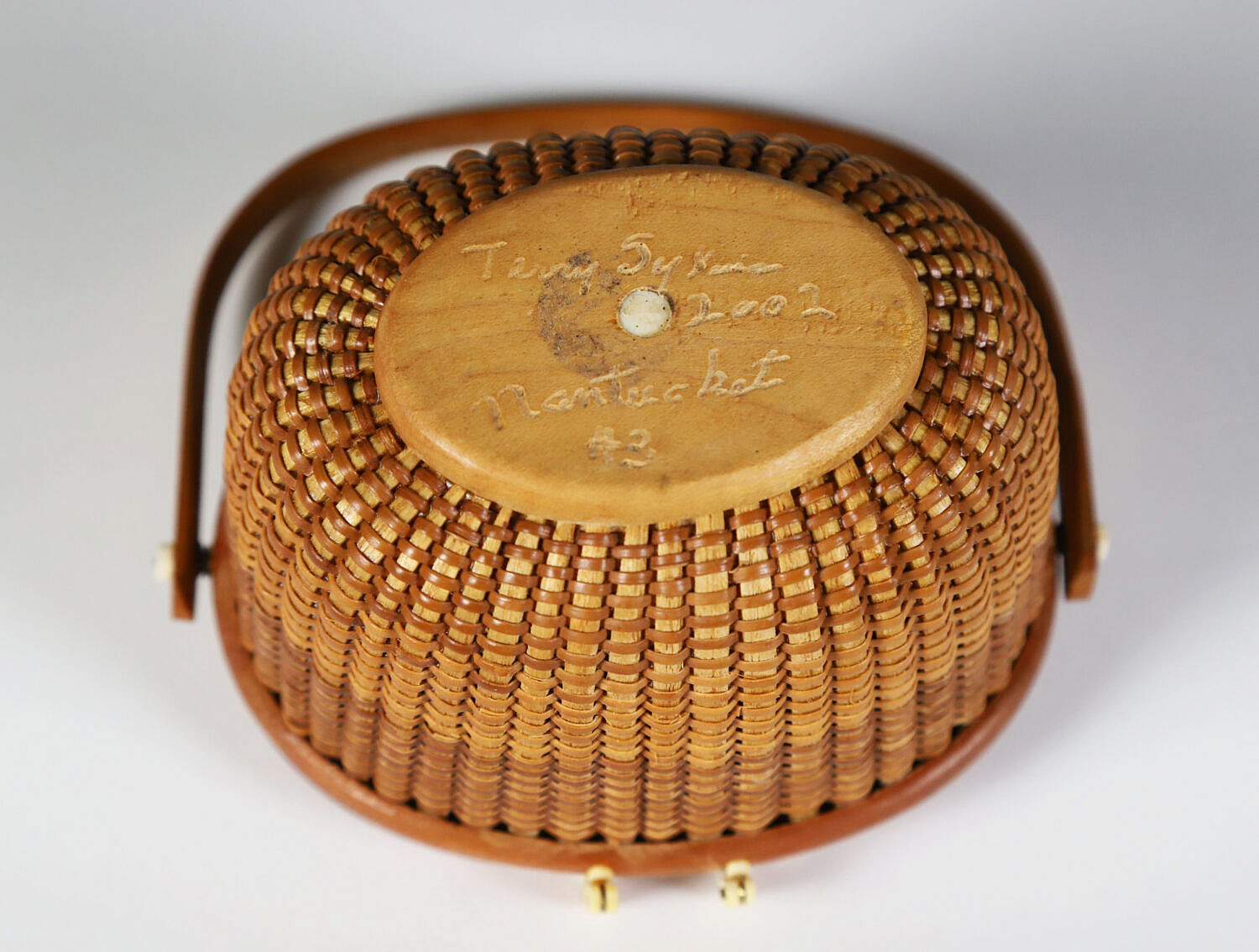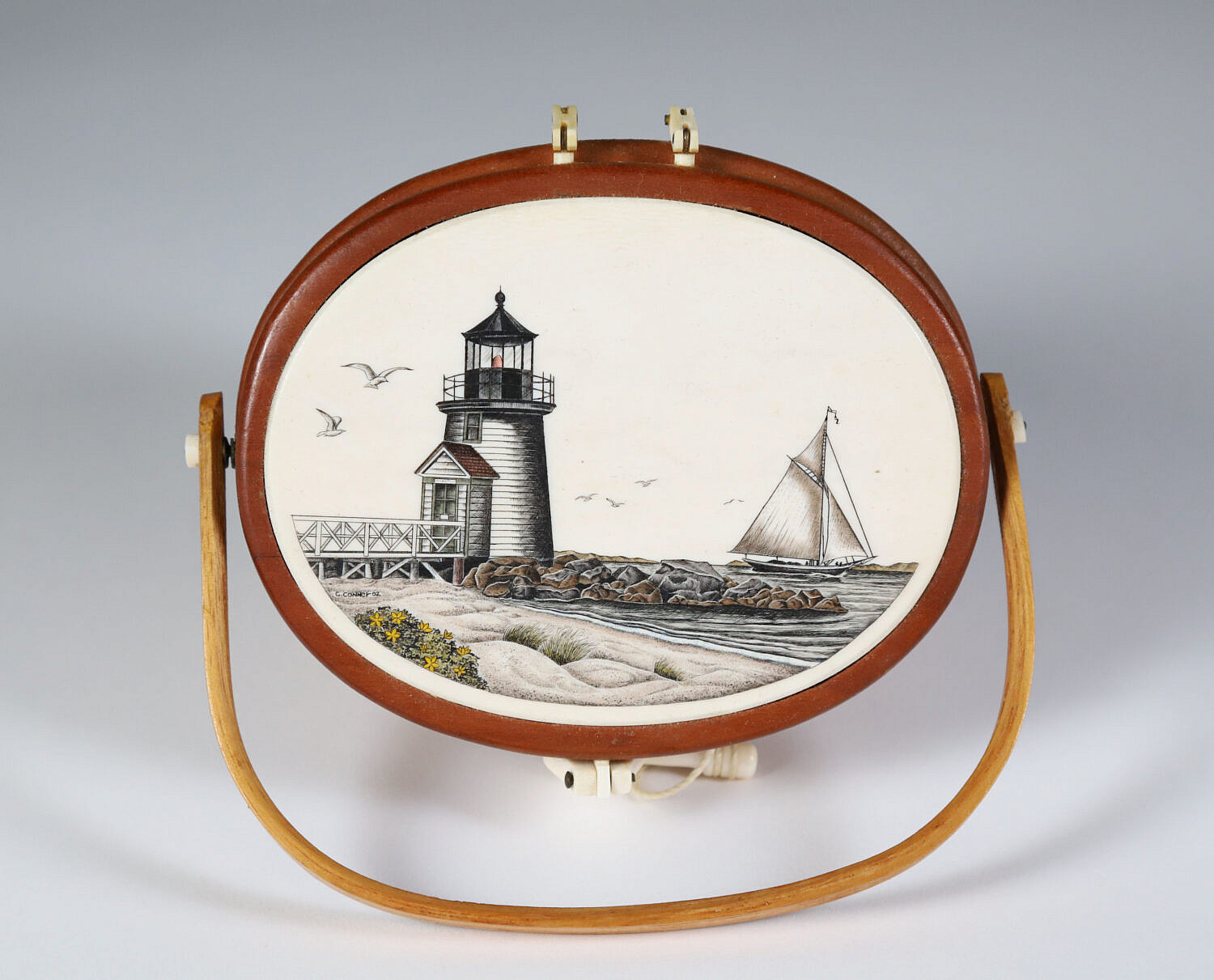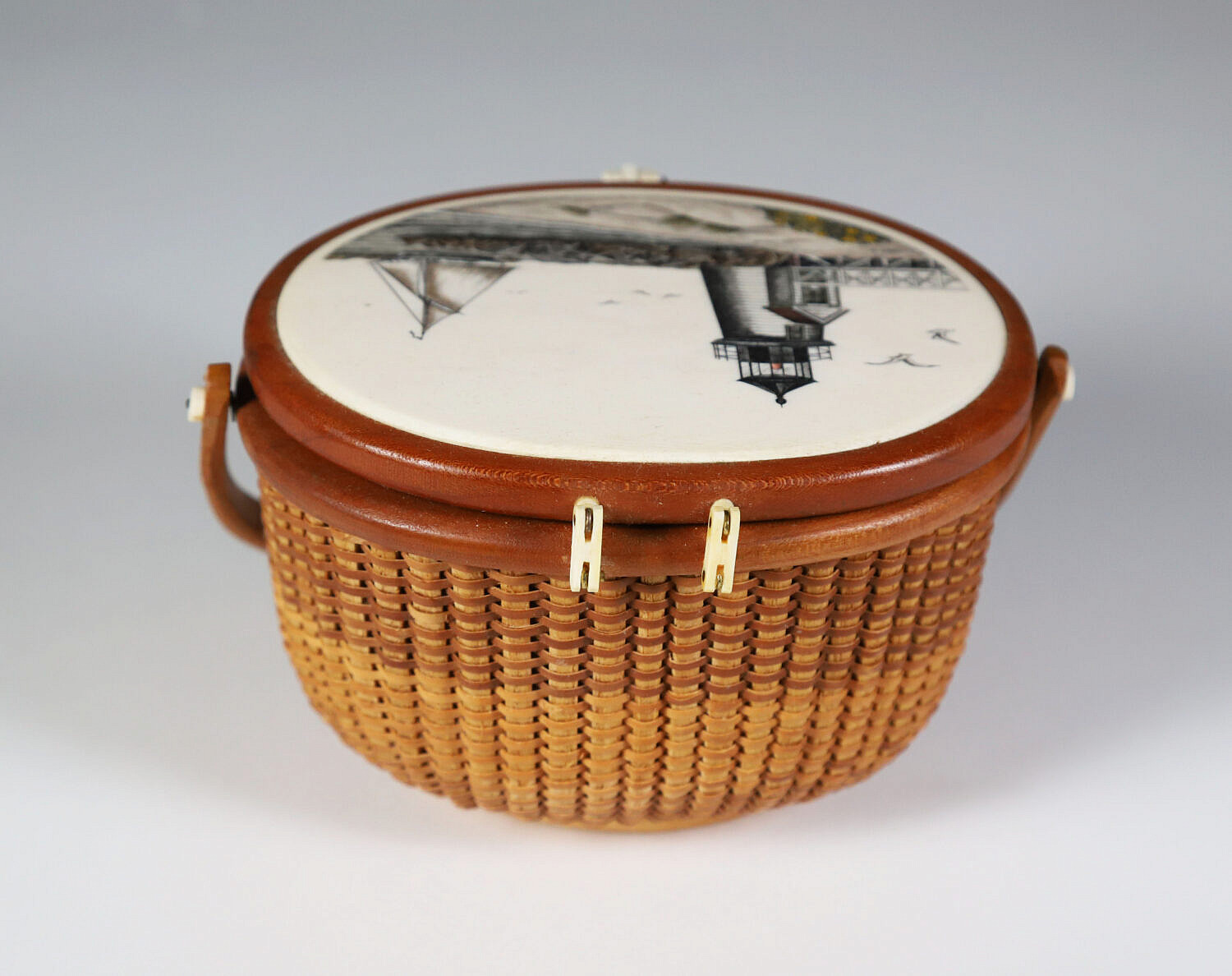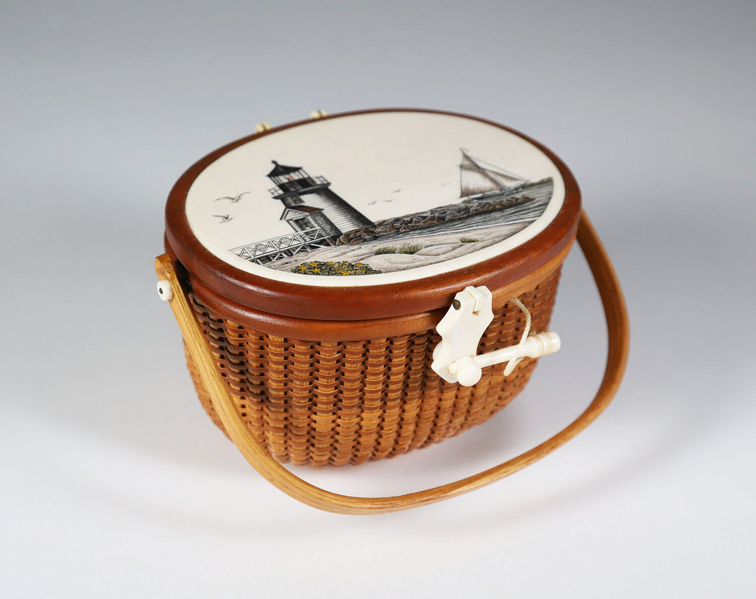 Terry Sylvia Miniature Nantucket Friendship Basket, Depicting a Polychrome Scrimshaw View of Brant Point by CH Conner, circa 2002
