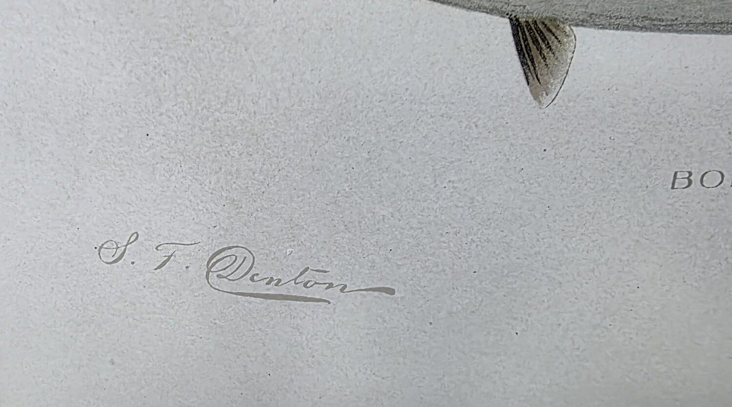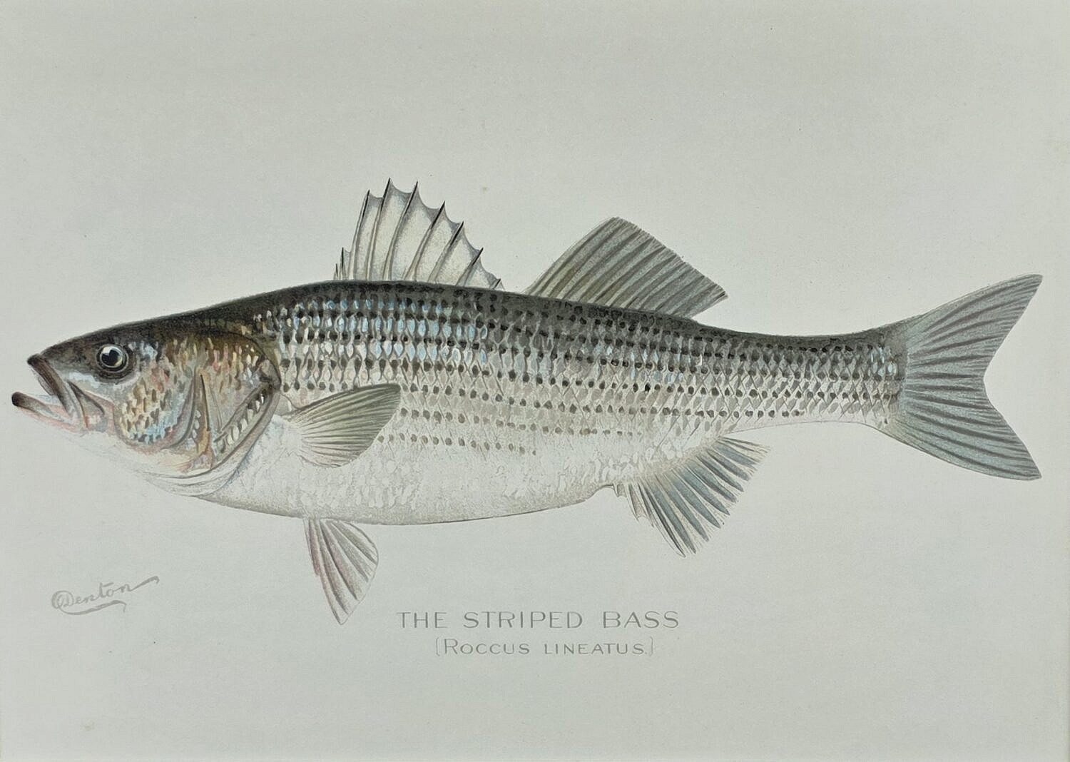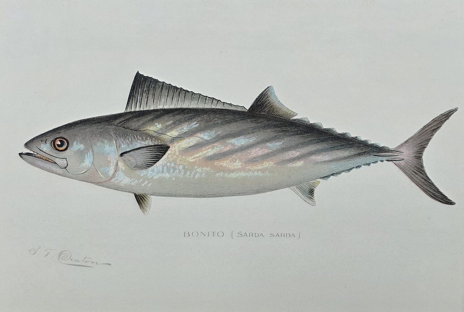 Two Sherman Foote Denton (1856-1937) Fish Chromolithographs, The Striped Bass and Bonito. Matted and framed, from the State of New York Fisheries, Game, and Forest Commission’s Annual Reports from 1895 to 1909
