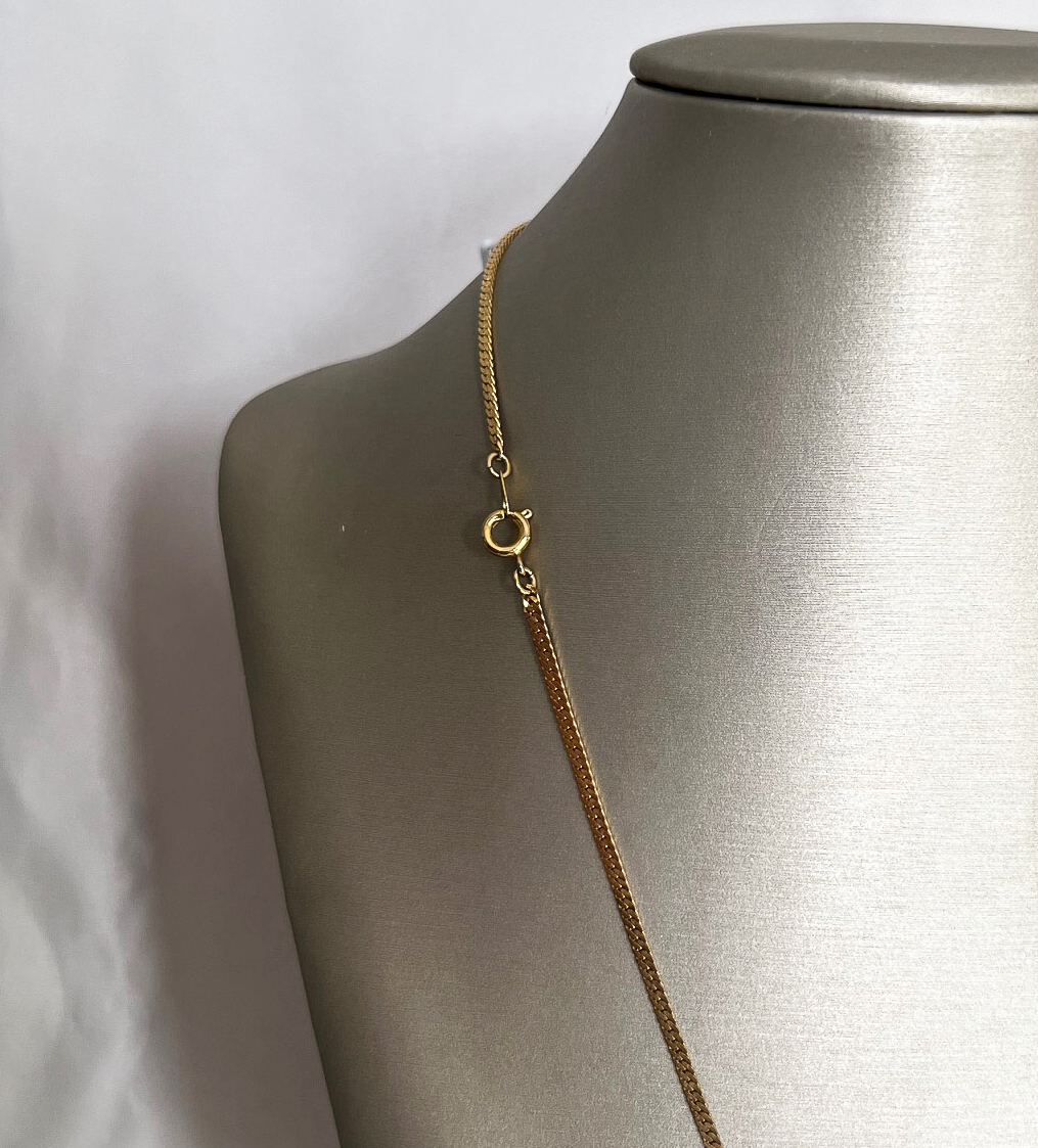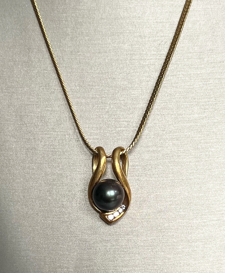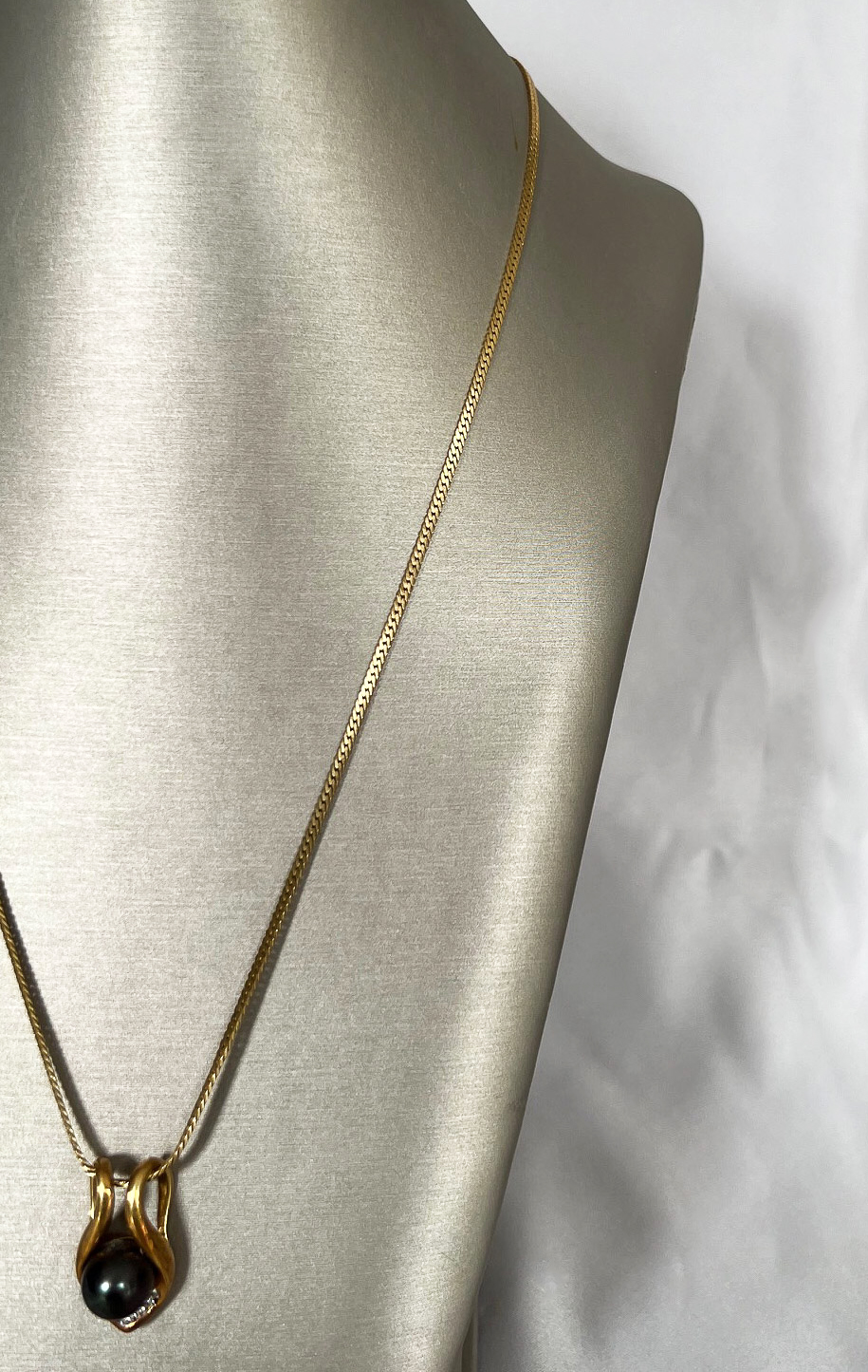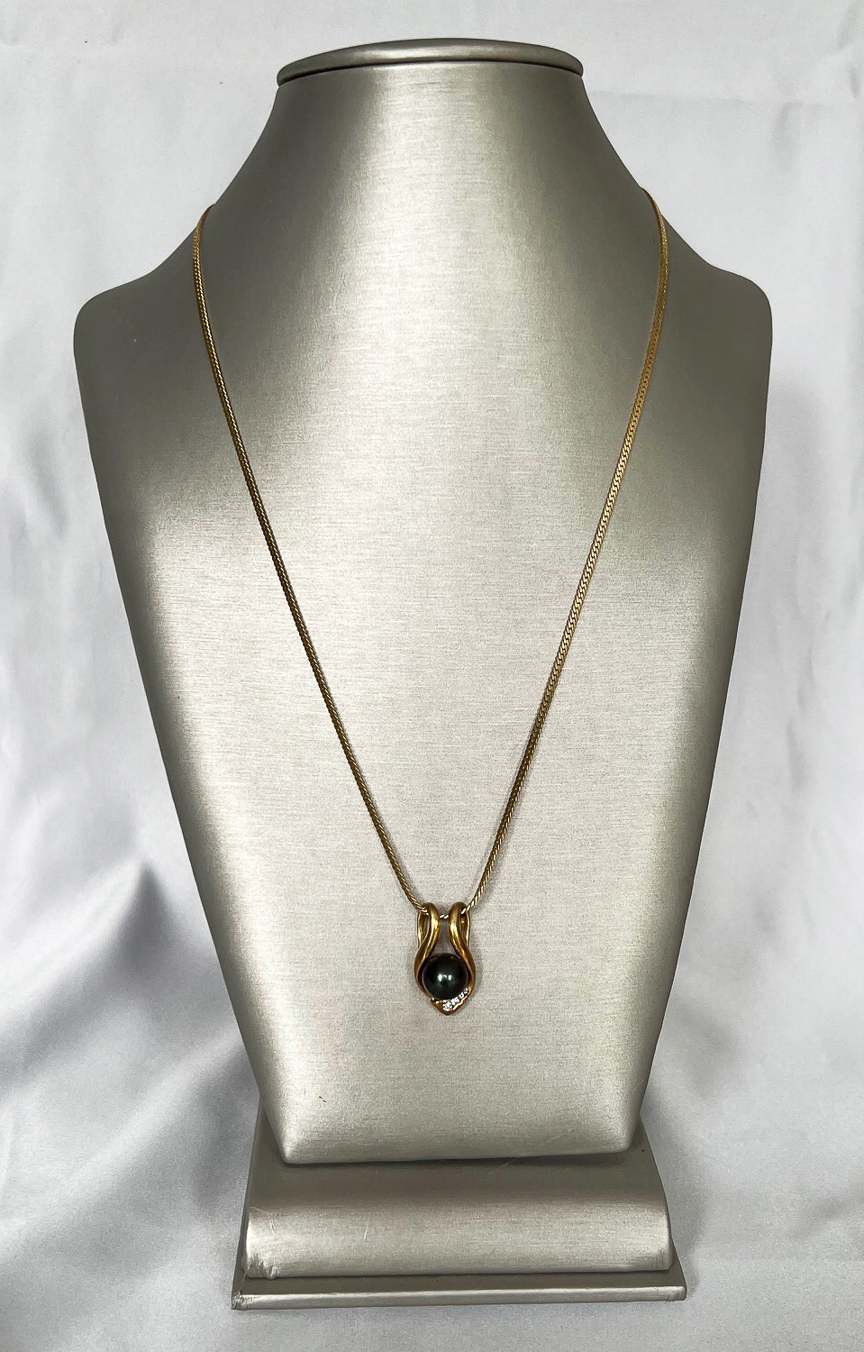 Vintage 18k Gold, Diamond and Black Pearl Pendant on Gold Chain, set with four diamonds, pearl 9.7mm 6.48dwt