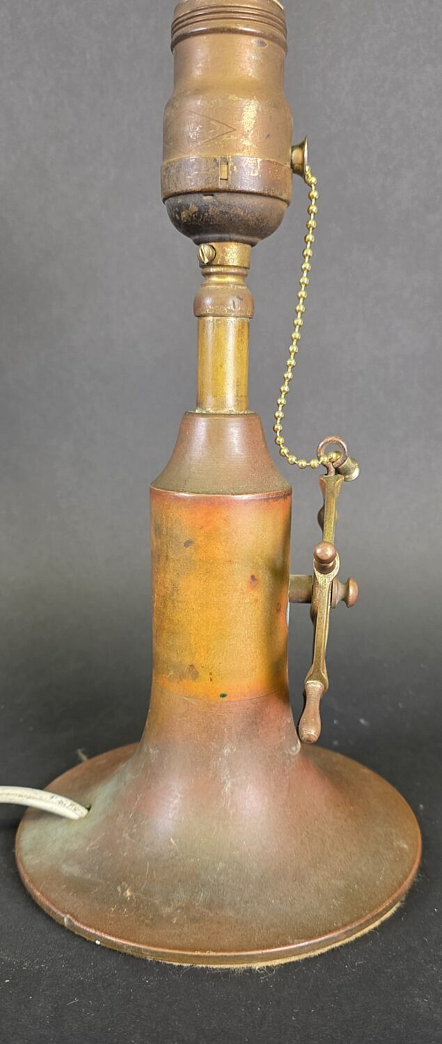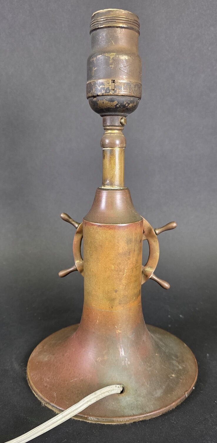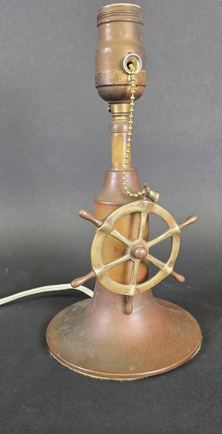 Vintage Brass Ships Wheel Table Lamp, 20th century, a functional rotating wheel pulls the power cord to on position.